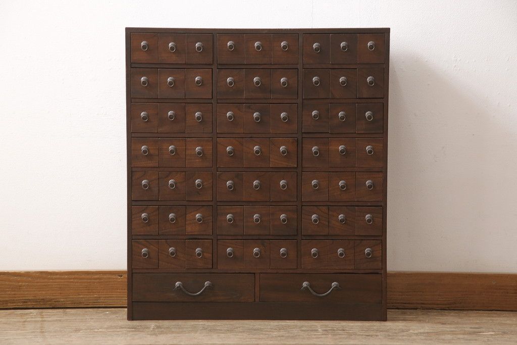 対象昭和初期の薬箪笥をリペア&カスタム!引き出しの取っ手金具を交換。本体を深みのある茶色に着色し仕上げ。(薬タンス、チェスト、小物収納、引き出し(大2杯・小63杯))