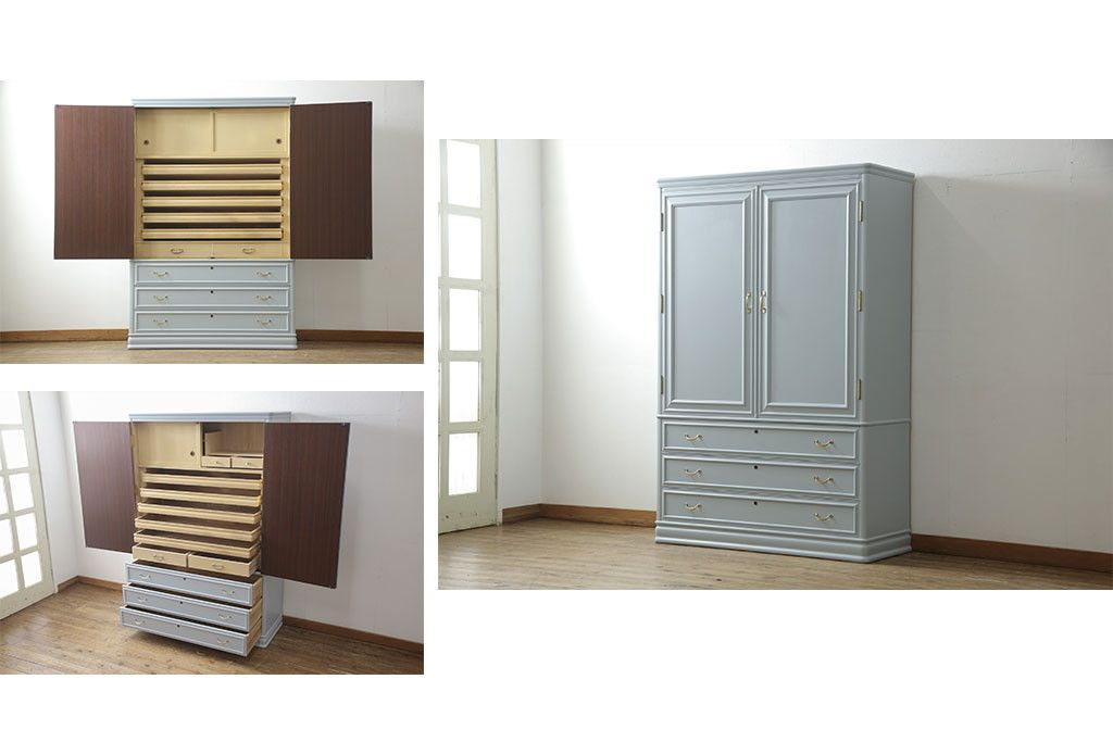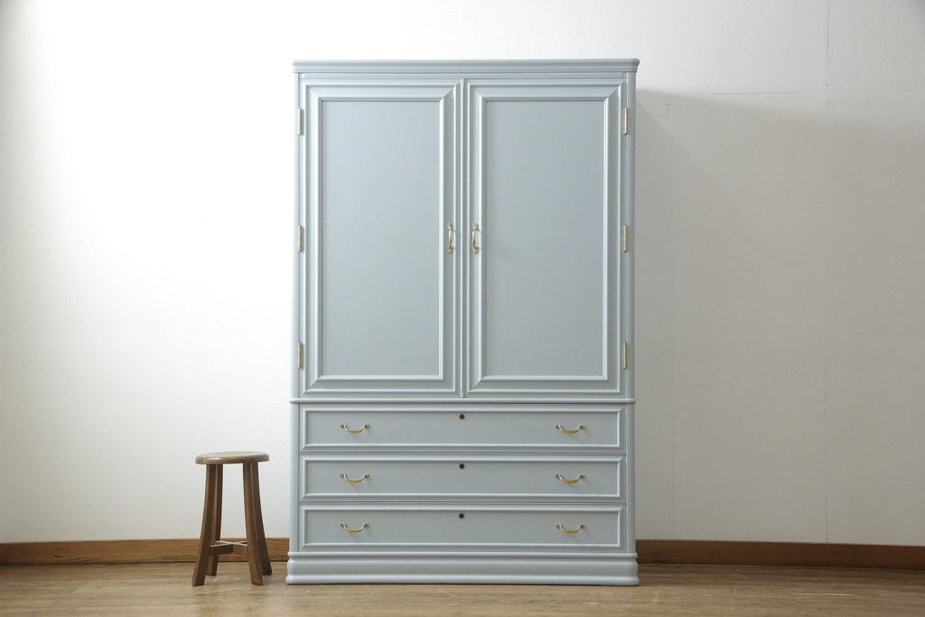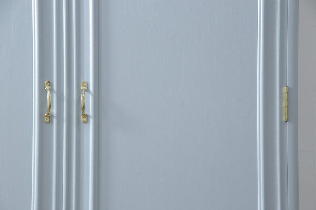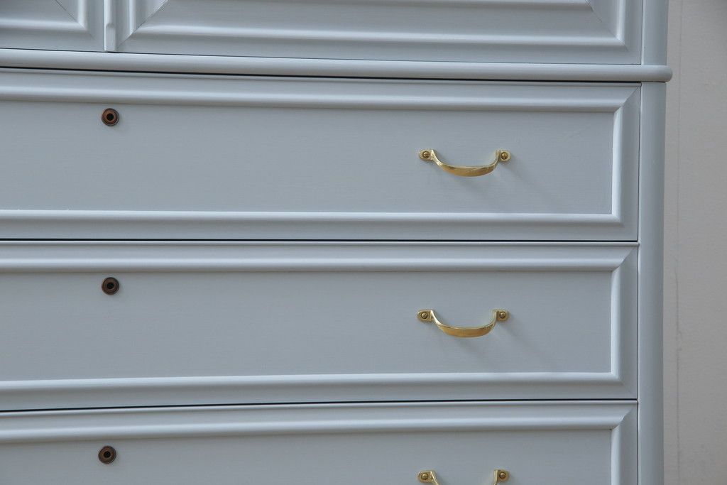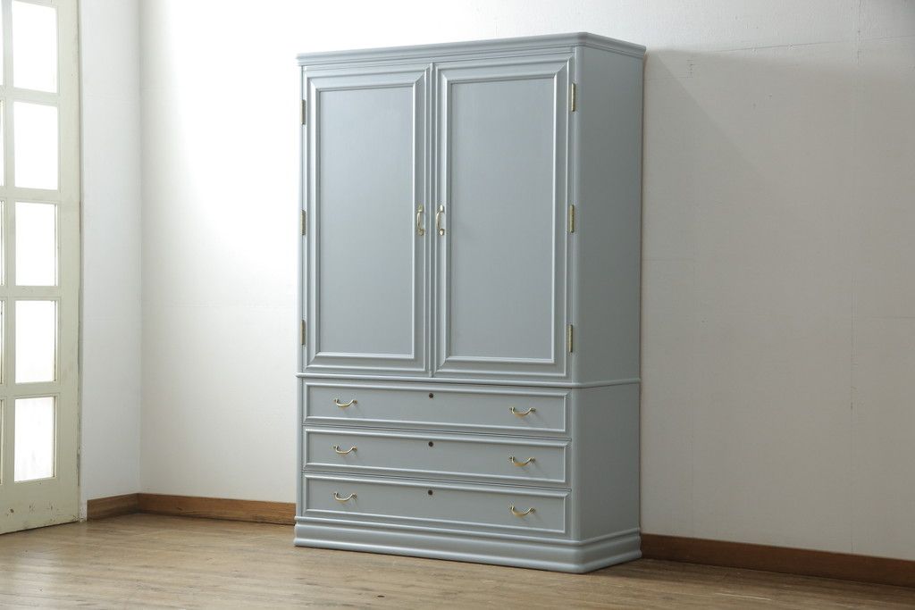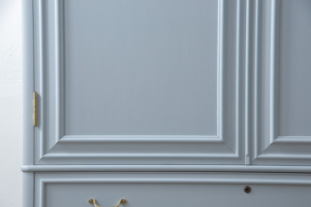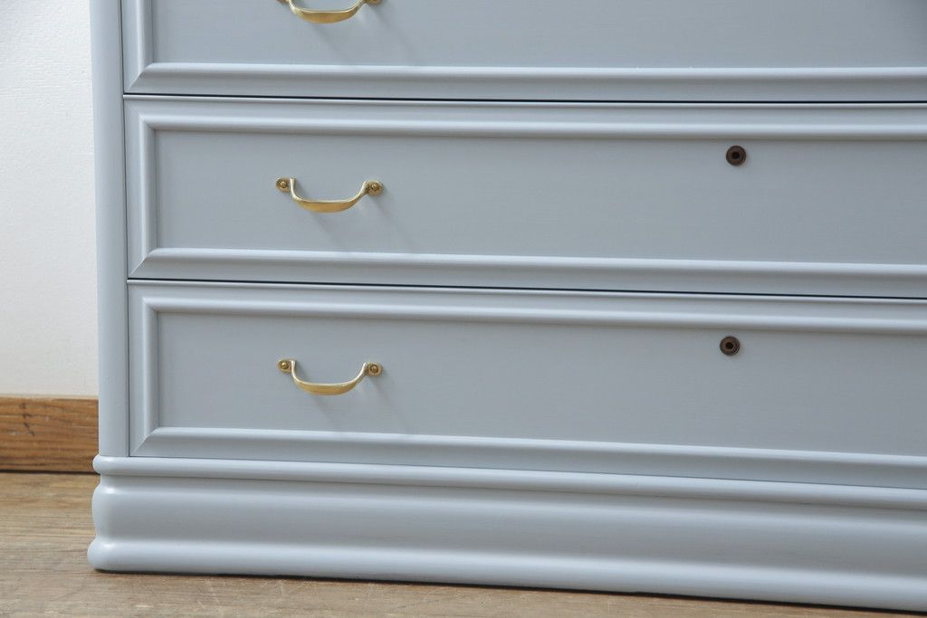 洋服箪笥をペイントリメイク!高品質リペアを施し、扉と引き出しの取っ手を交換。外側のみブルーグレーにペイント仕上げ。