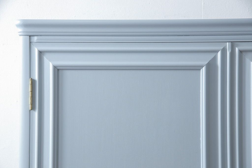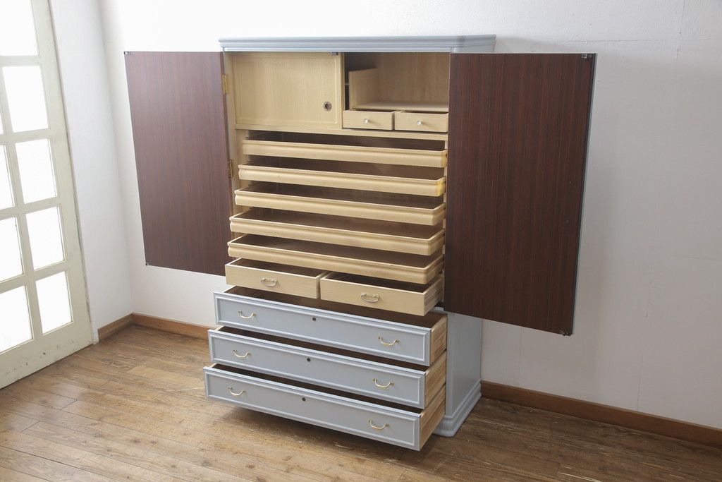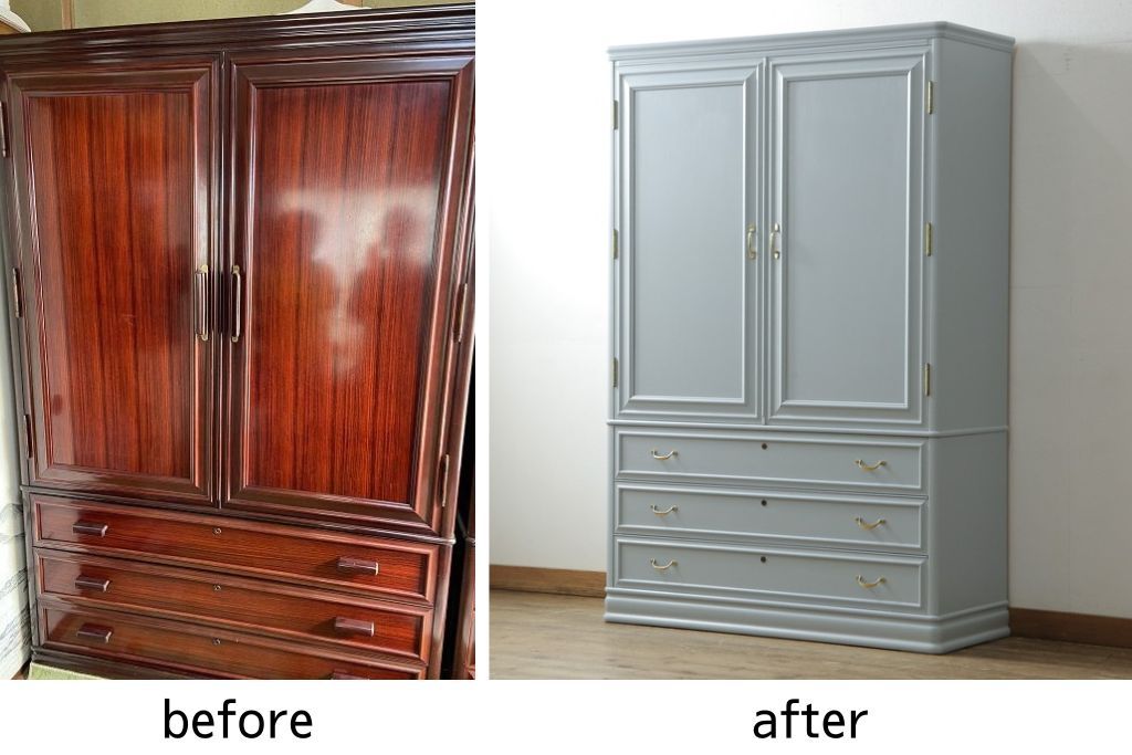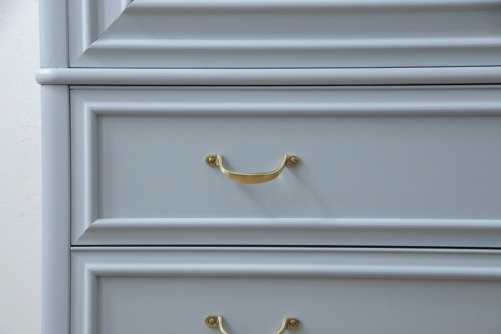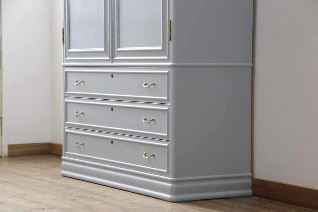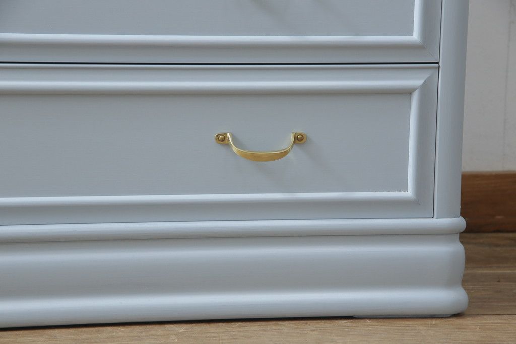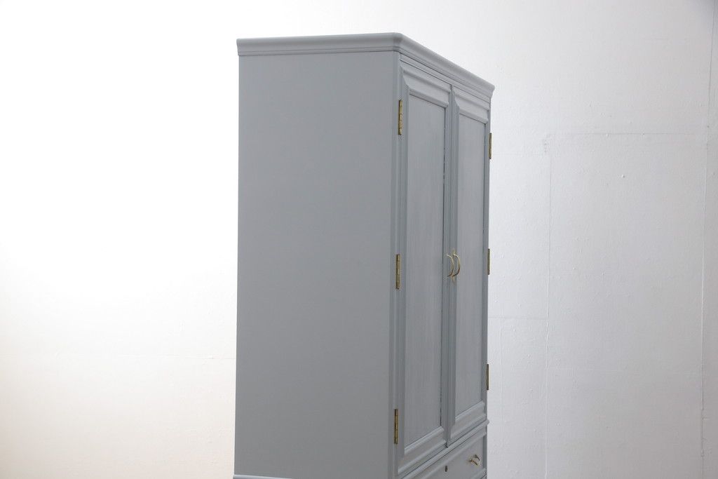 洋服箪笥をペイントリメイク!高品質リペアを施し、扉と引き出しの取っ手を交換。外側のみブルーグレーにペイント仕上げ。