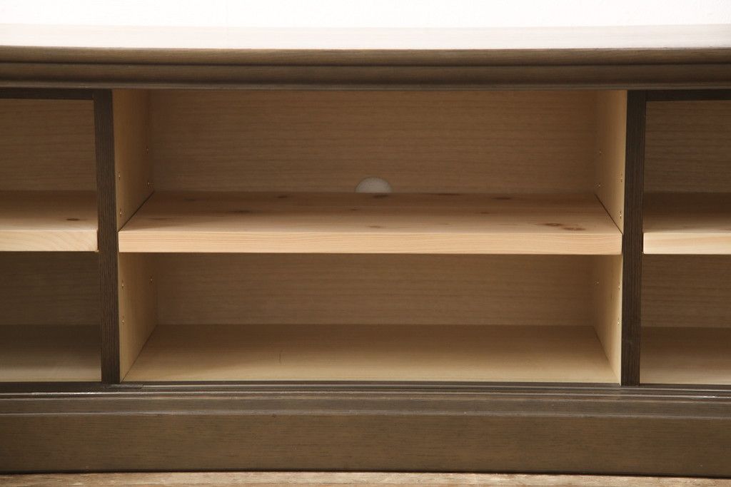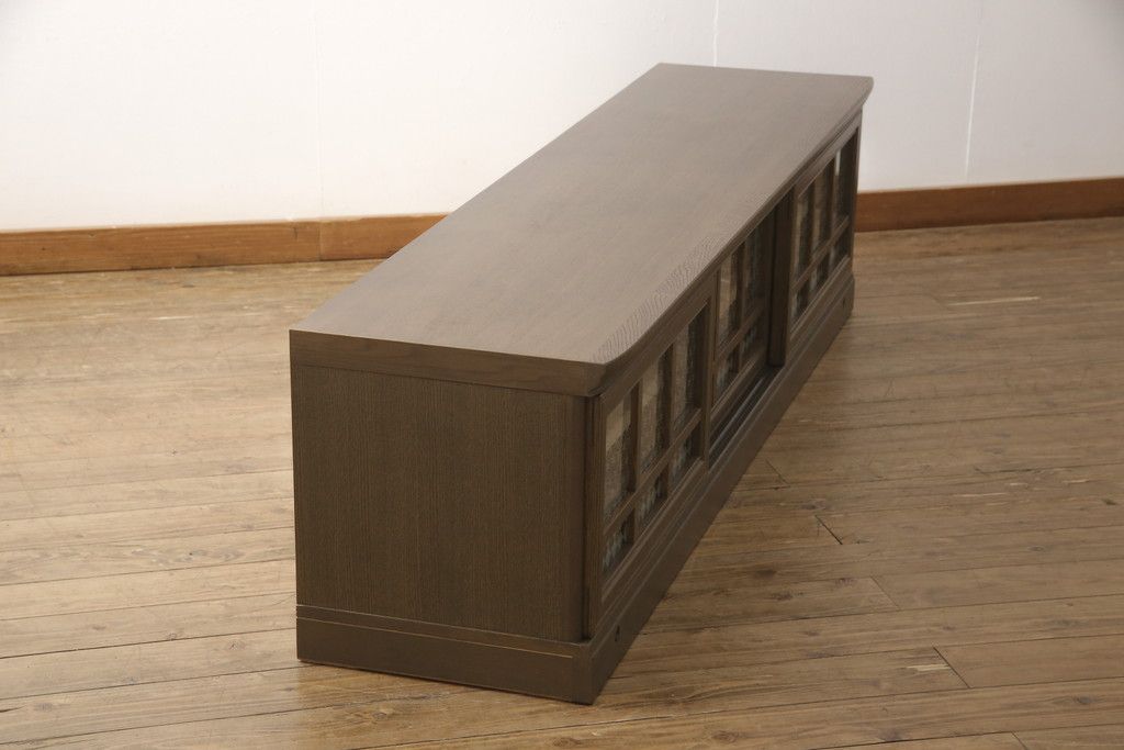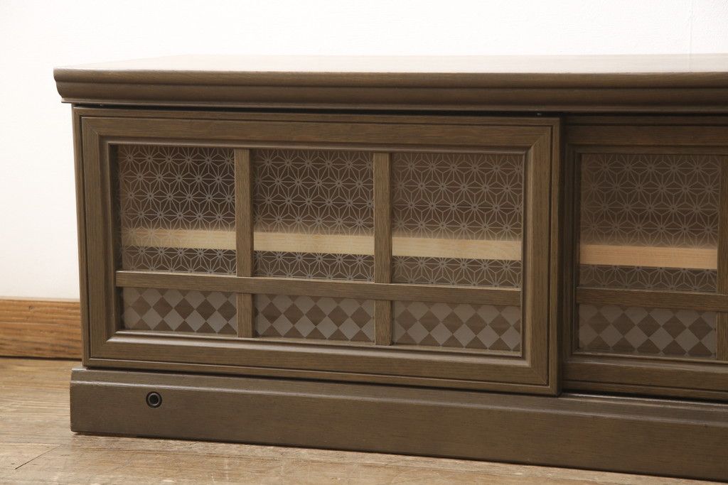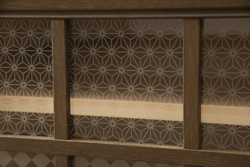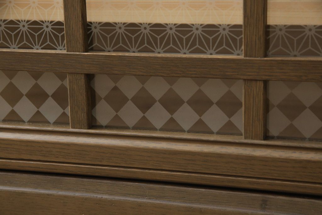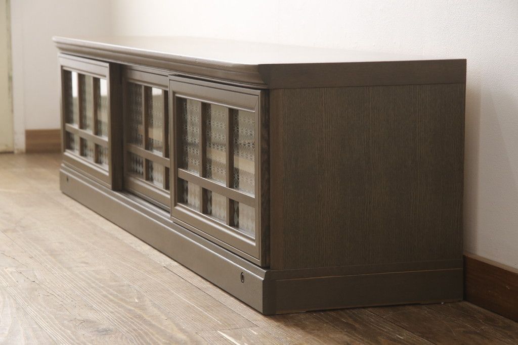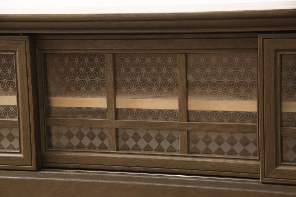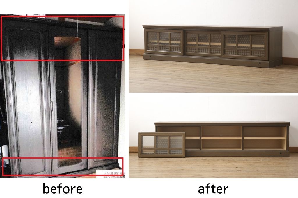 ワードローブとチェストをテレビボードにリメイク!内部に可動式の棚板を設置し、引き戸には模様入りのガラスを使用。新材は元の材に合わせた色味に仕上げ。