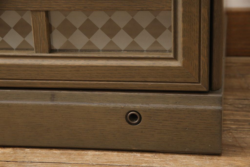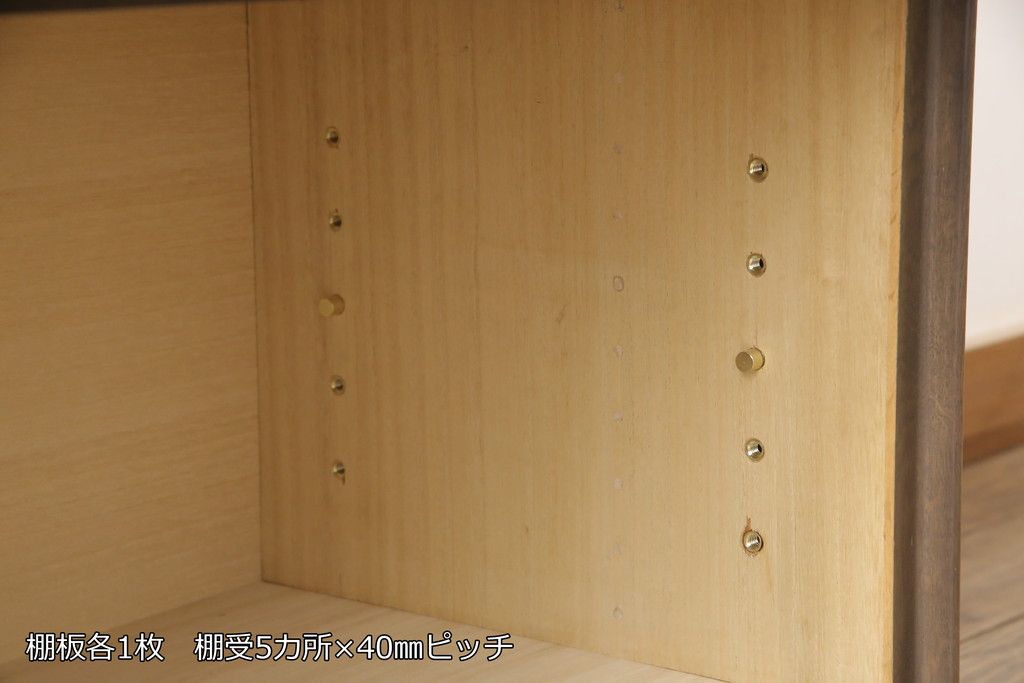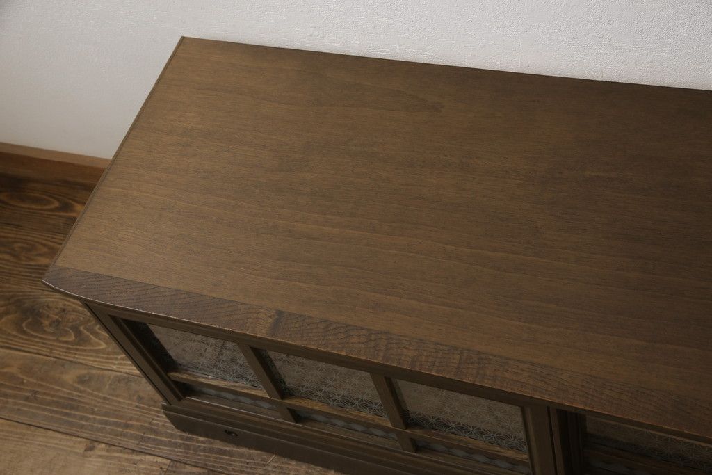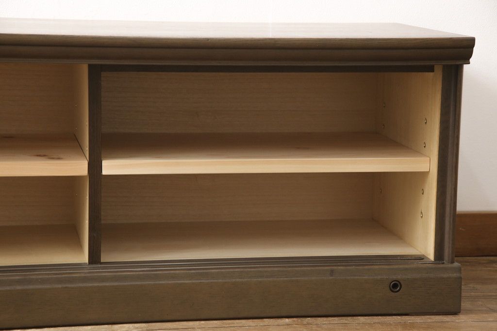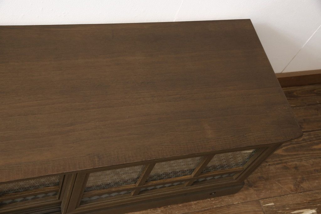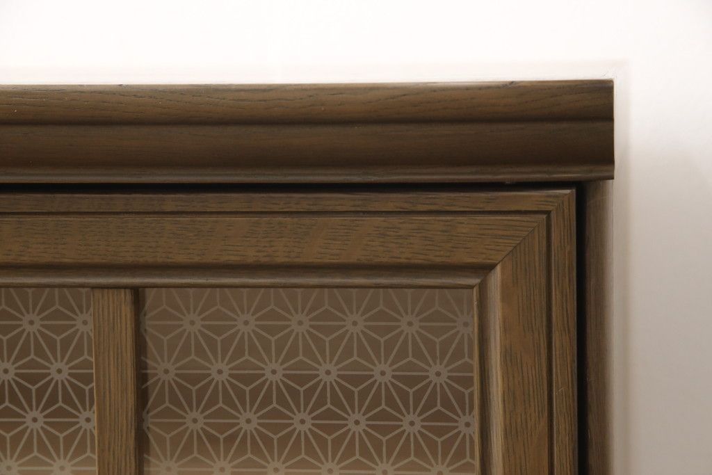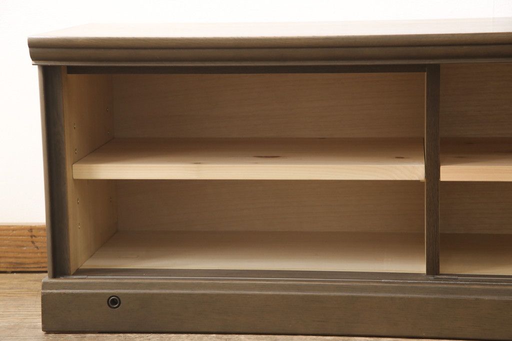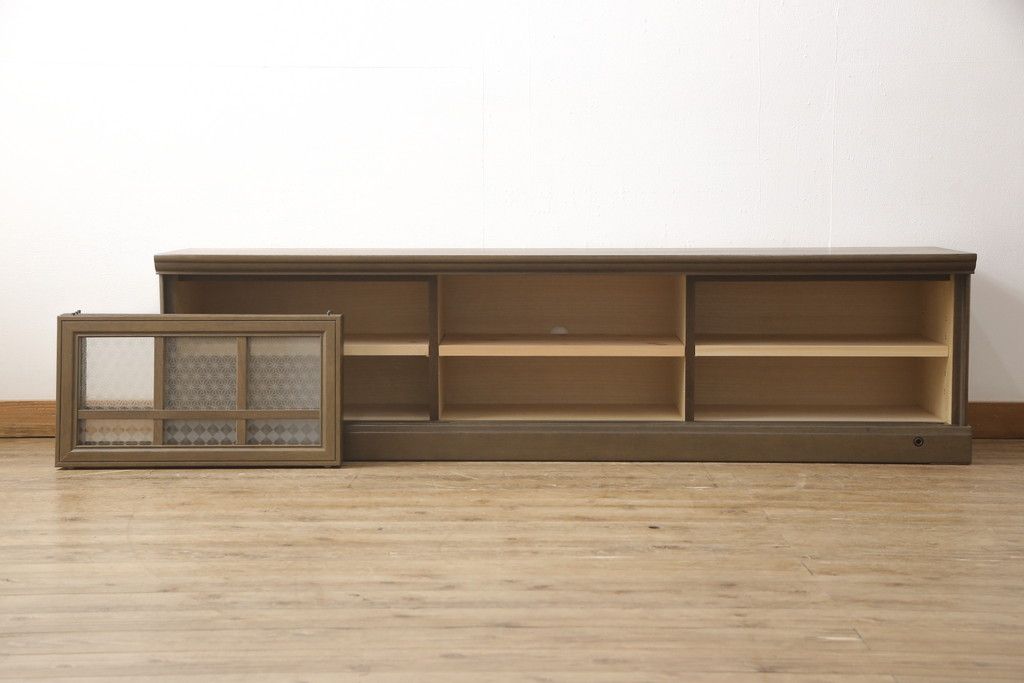 ワードローブとチェストをテレビボードにリメイク!内部に可動式の棚板を設置し、引き戸には模様入りのガラスを使用。新材は元の材に合わせた色味に仕上げ。