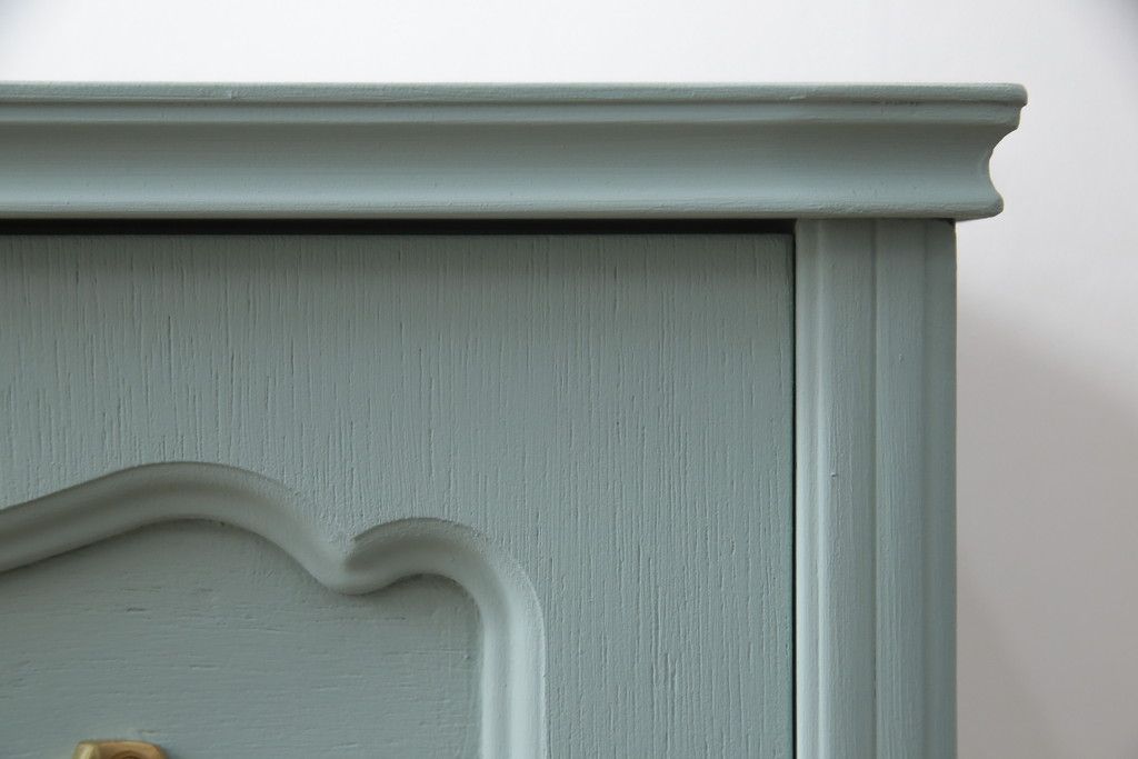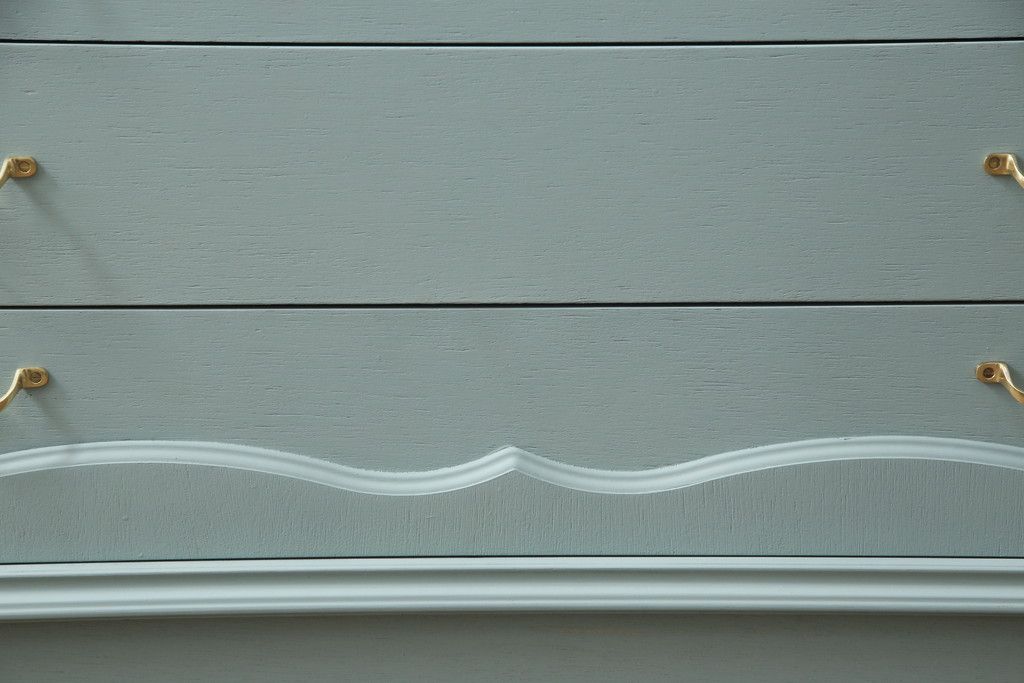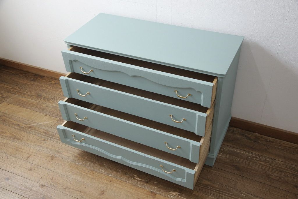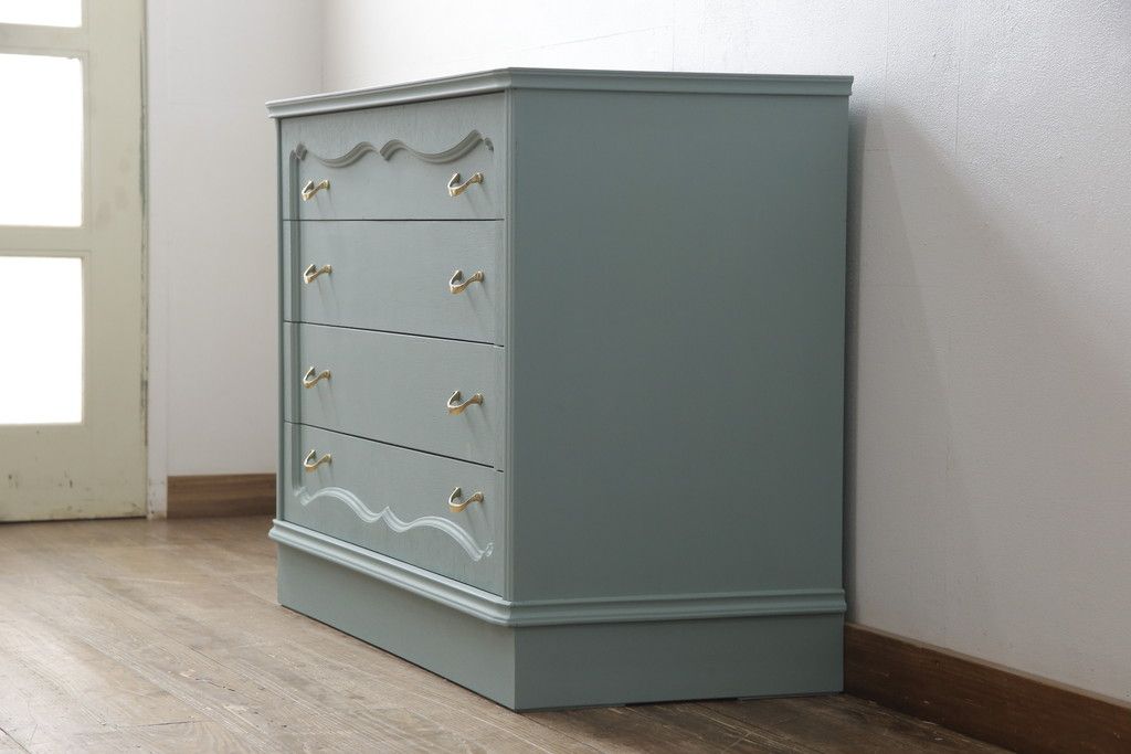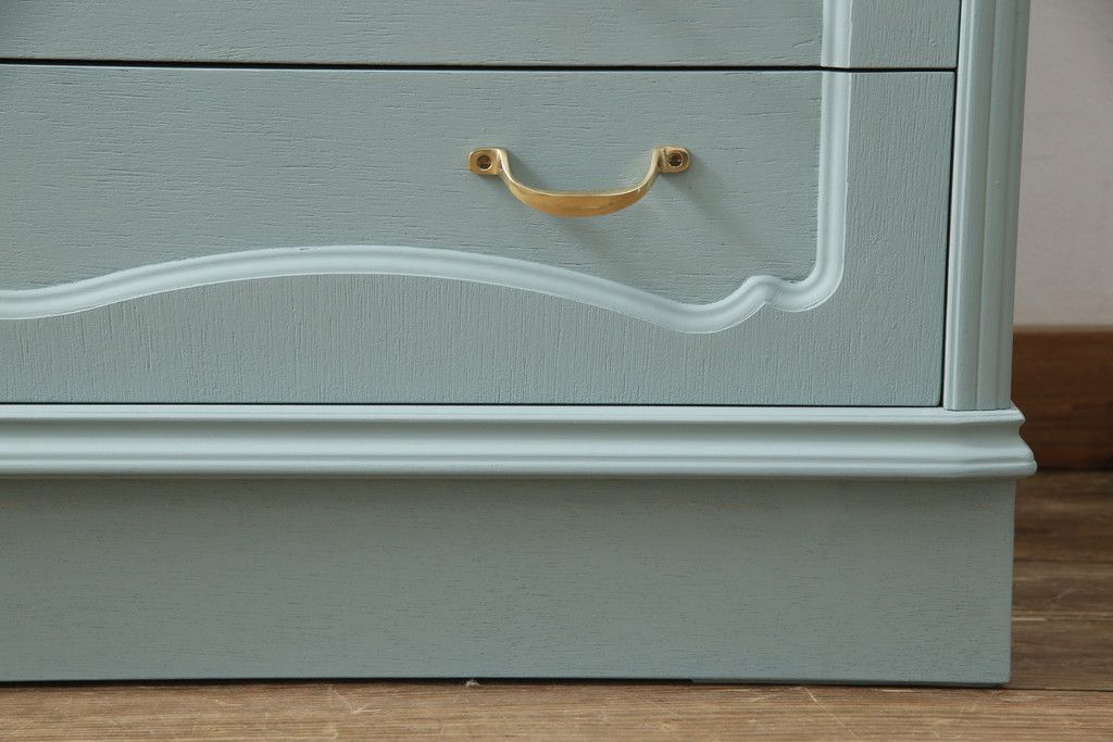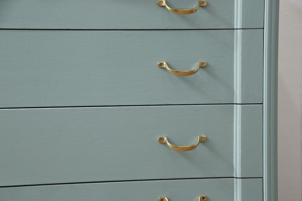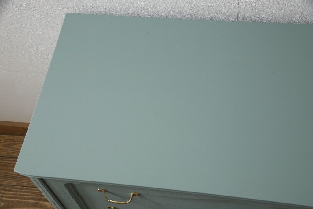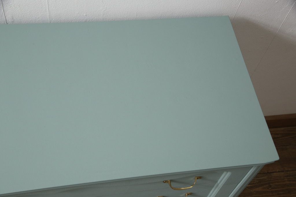 箪笥をチェストにリメイク!ヒノキ無垢材の天板を取り付け、取っ手を交換。淡い青緑にペイント仕上げ。