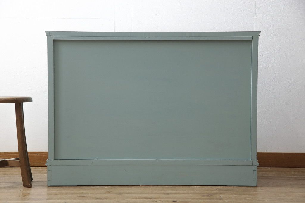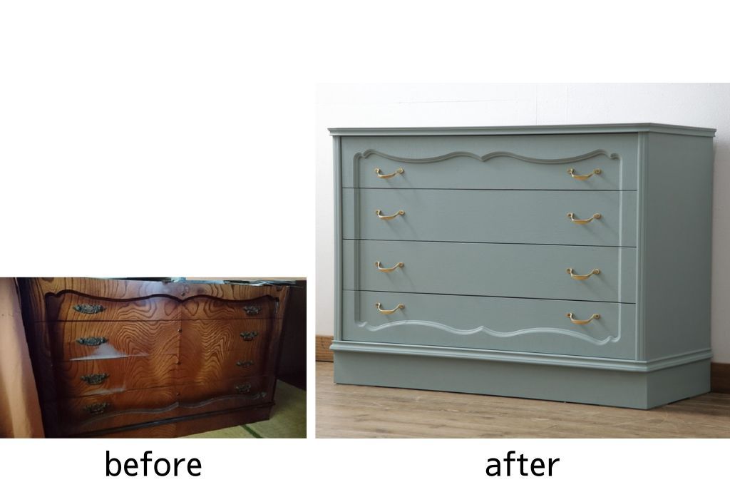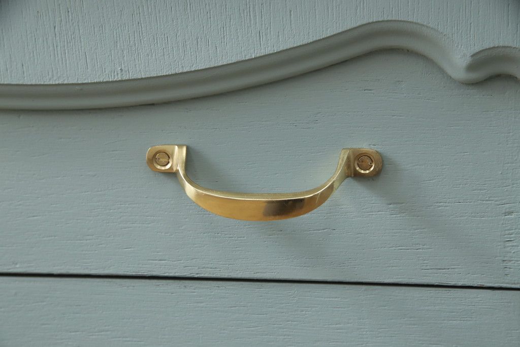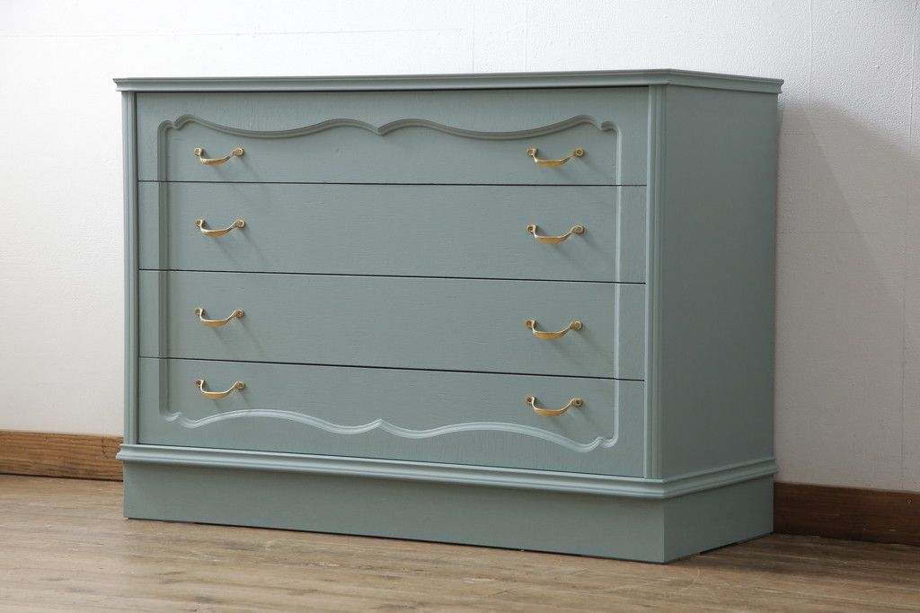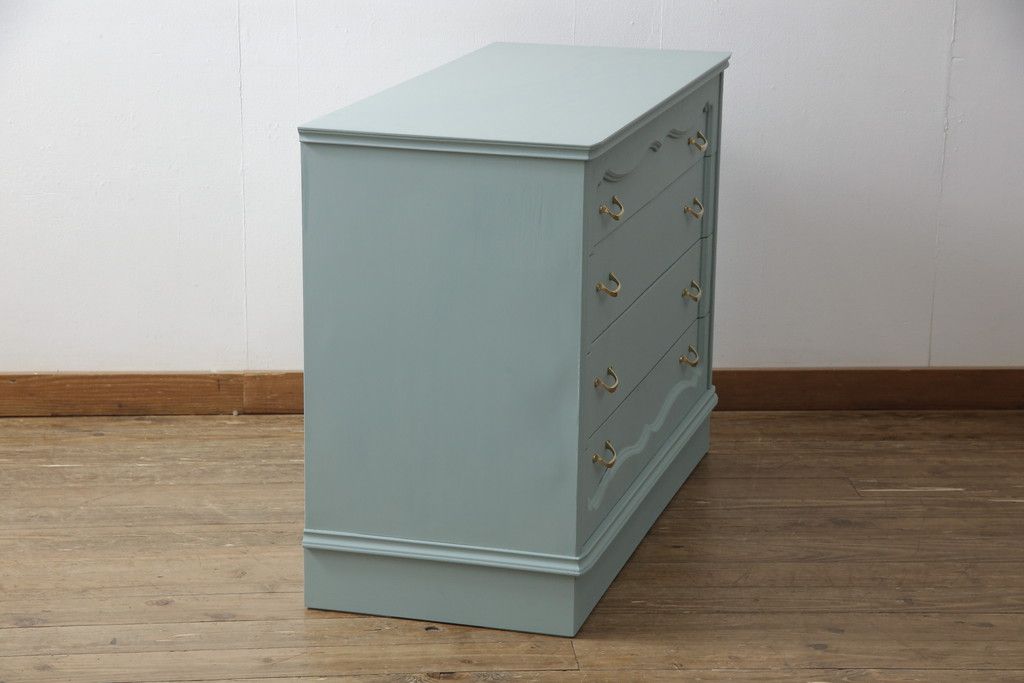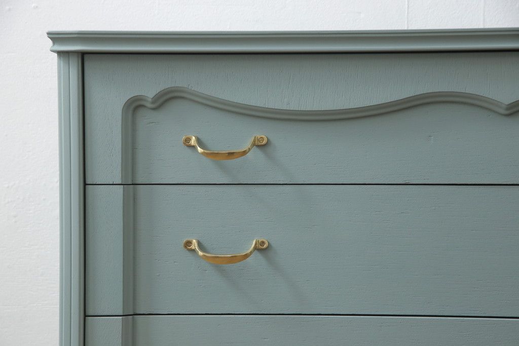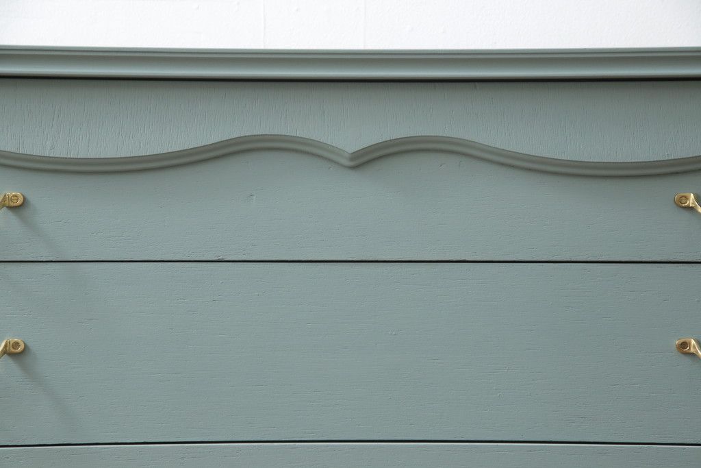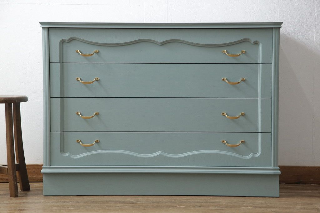 箪笥をチェストにリメイク!ヒノキ無垢材の天板を取り付け、取っ手を交換。淡い青緑にペイント仕上げ。