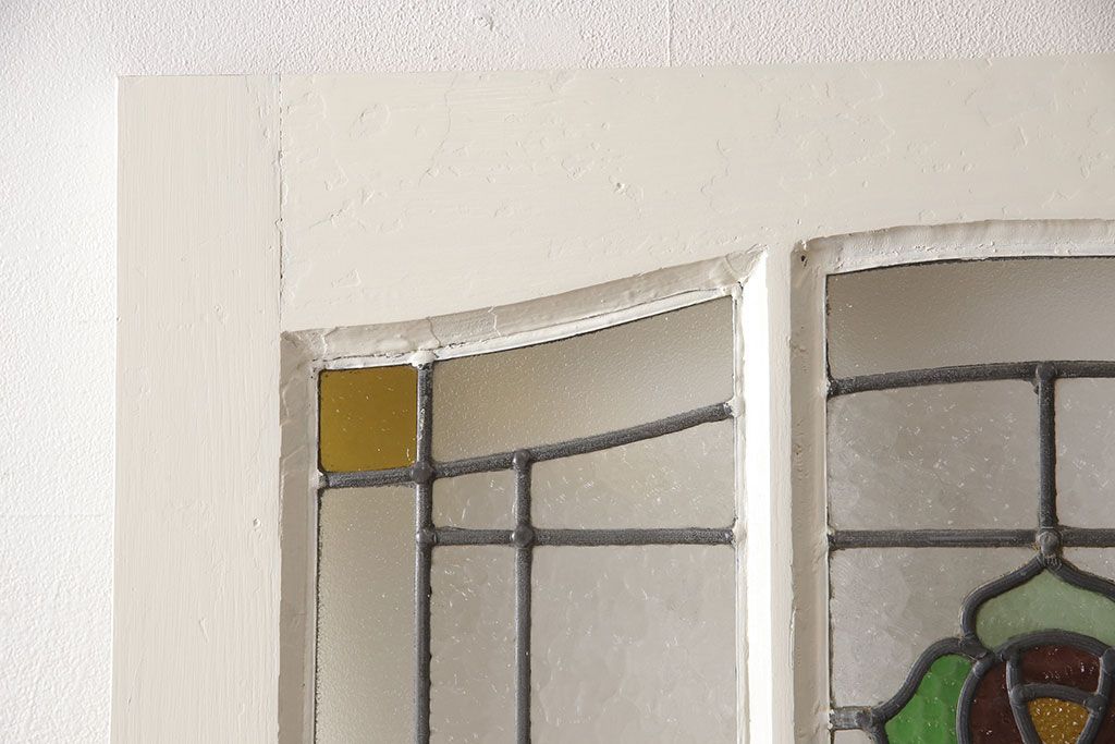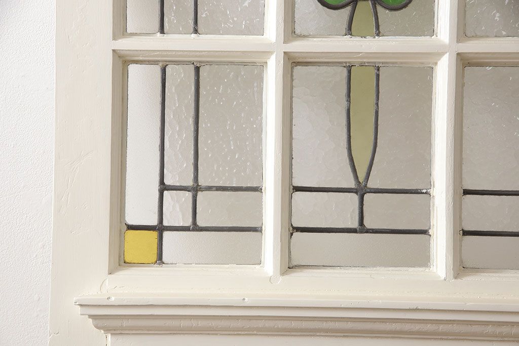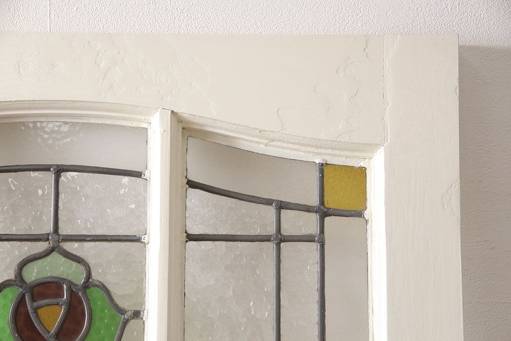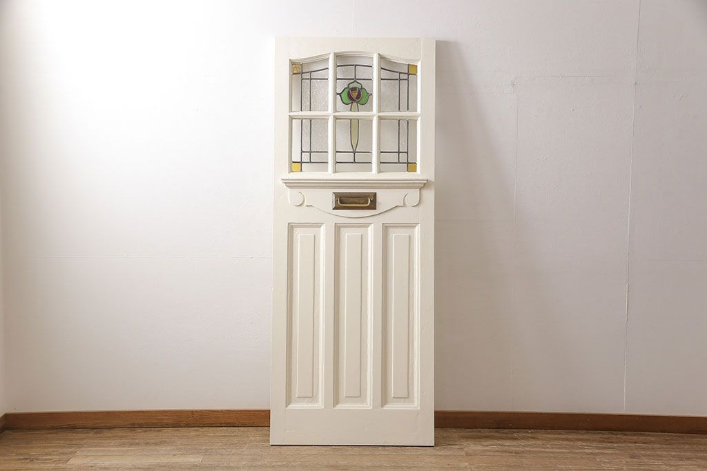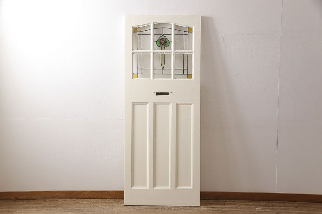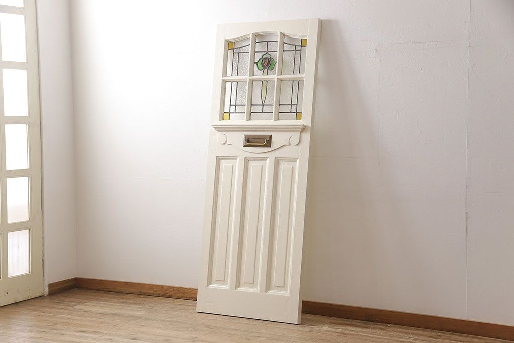 セミオーダー家具実績 > イギリスアンティークの木製ドアをリペア&カスタム!高さと幅をリサイズし、鍵の取り付け跡を埋木処理。お客様ご用意の塗料でペイント仕上げ。(扉、ステンドグラス、建具)