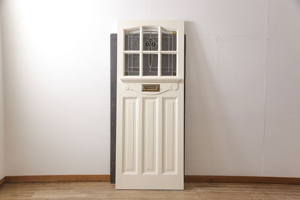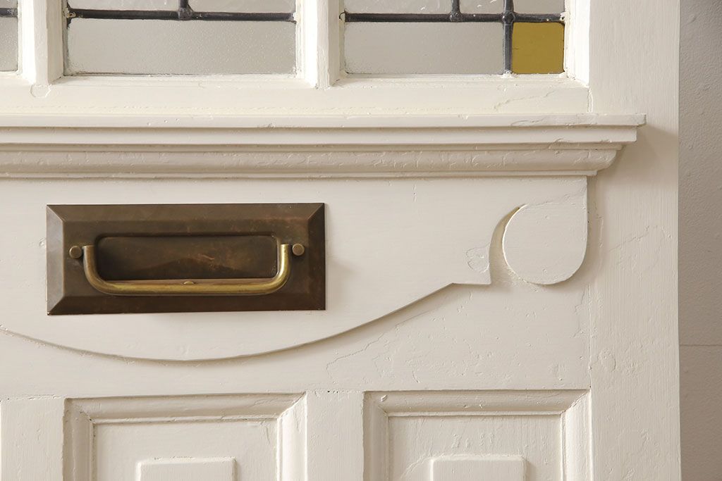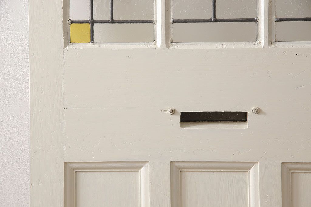 ドア・建具> 玄関ドア・玄関戸 > イギリスアンティークの木製ドアをリペア&カスタム!高さと幅をリサイズし、鍵の取り付け跡を埋木処理。お客様ご用意の塗料でペイント仕上げ。(扉、ステンドグラス、建具)