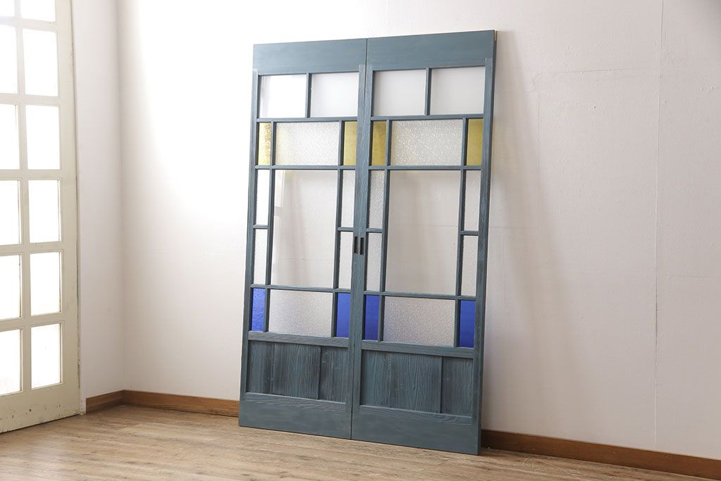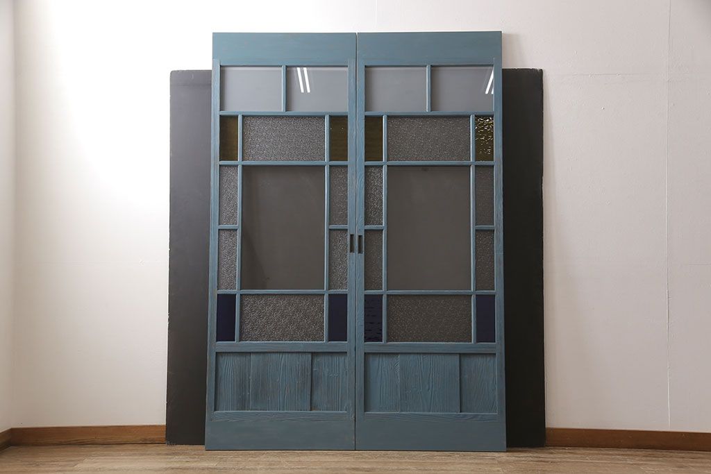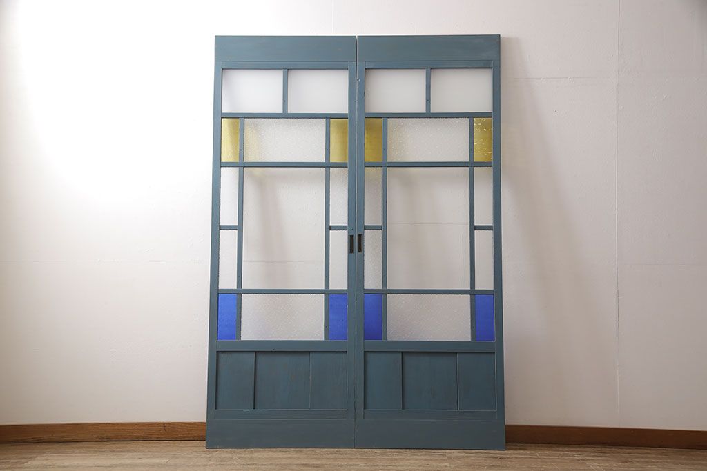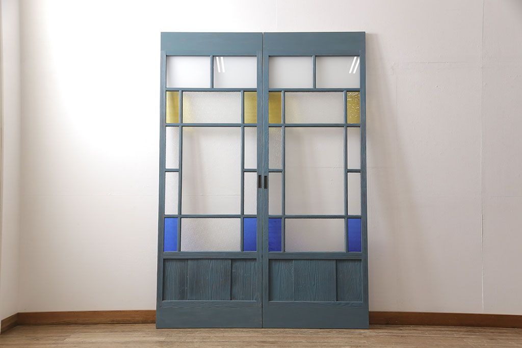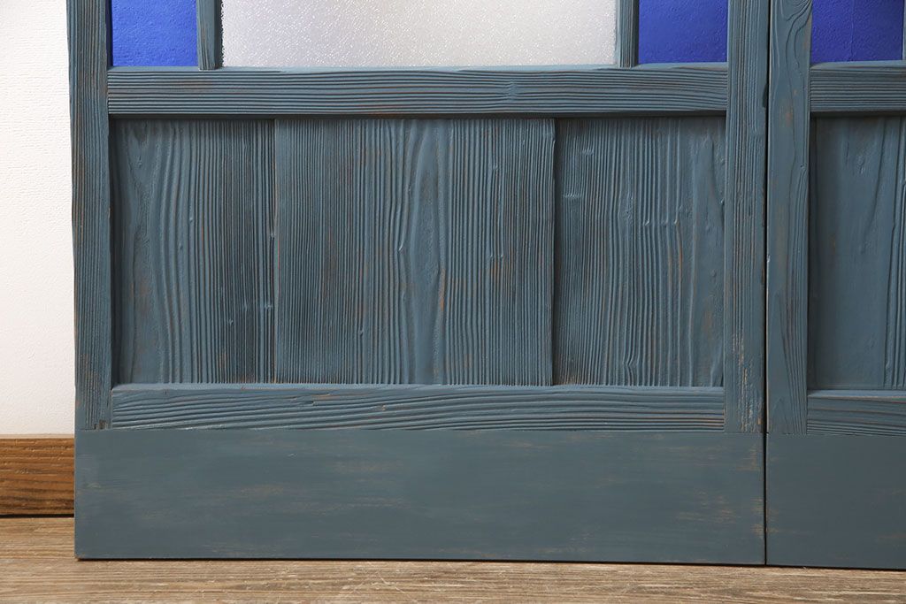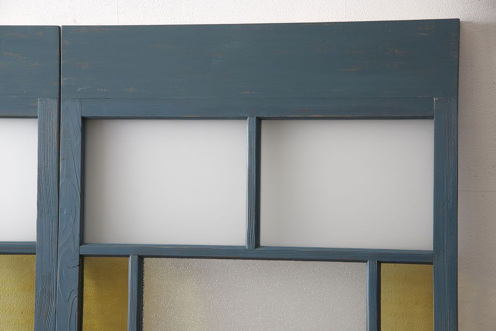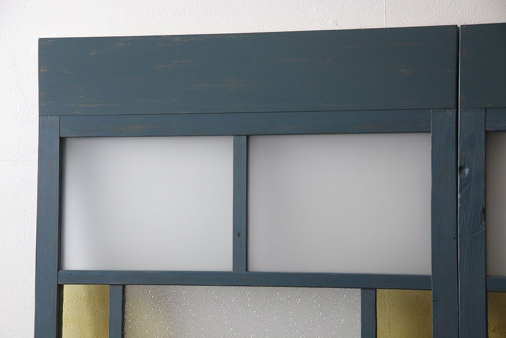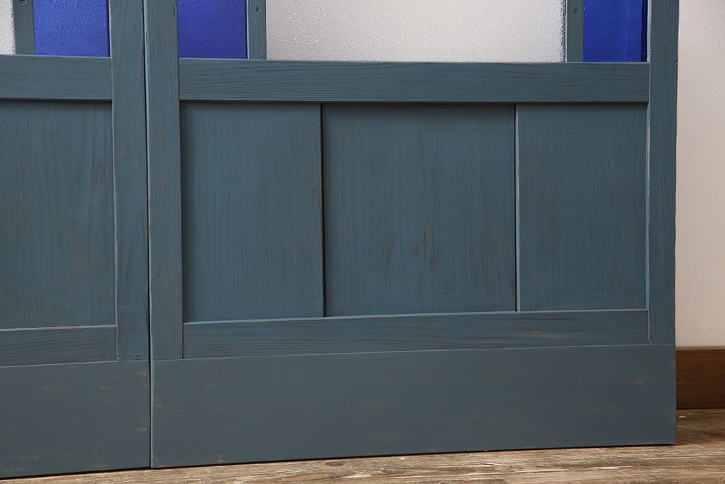 ドア・建具> 2枚・3枚セット > 昭和初期のガラス戸2枚をリペア&カスタム!高さと幅をリサイズし、吊り戸仕様に変更。現状に合わせてくすんだ青色にペイント仕上げ。(引き戸、建具、色ガラス)