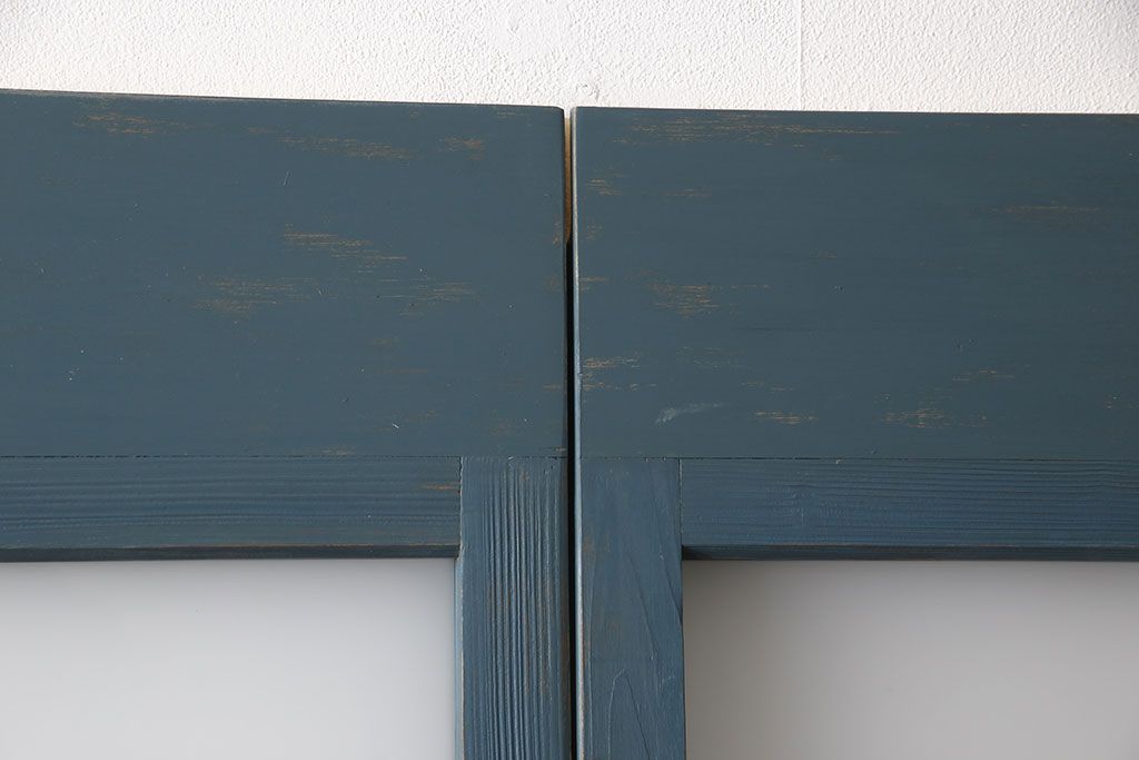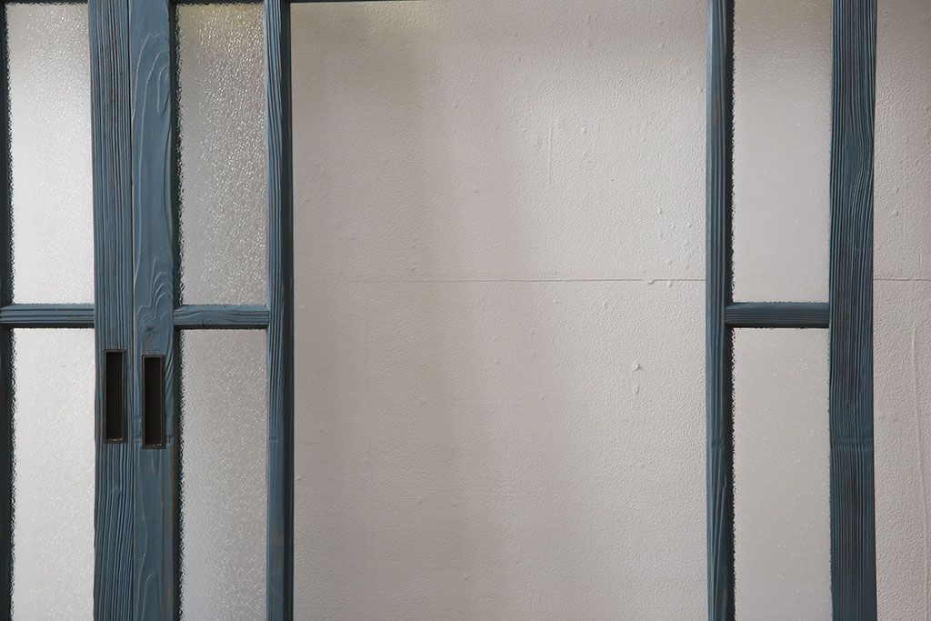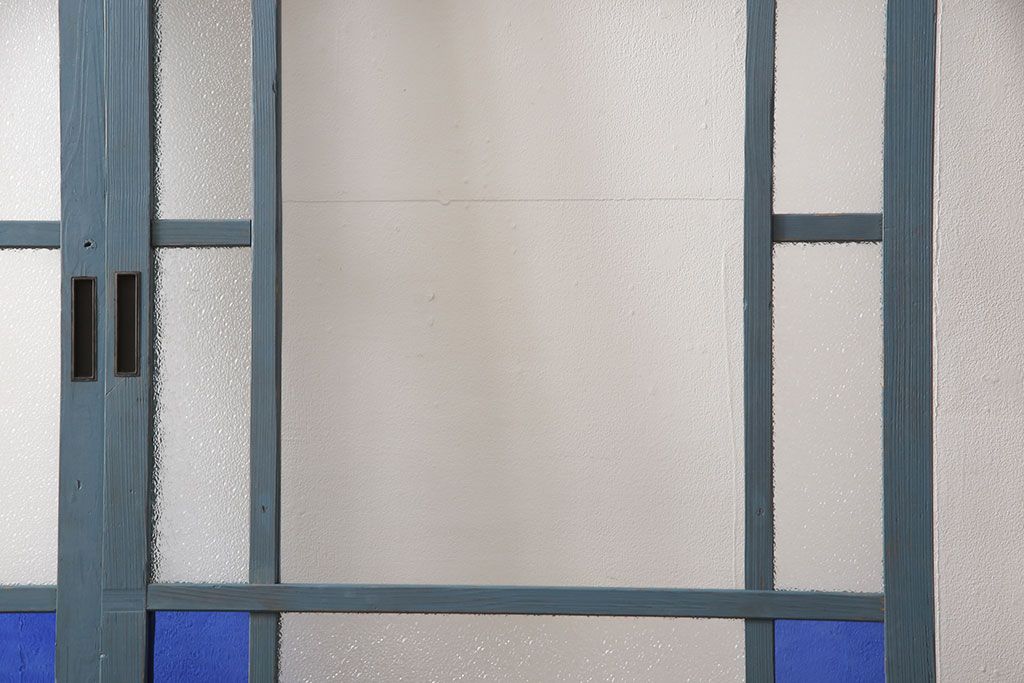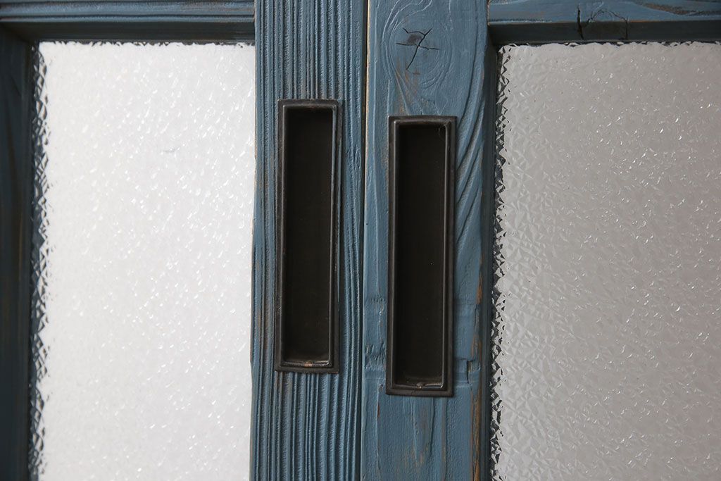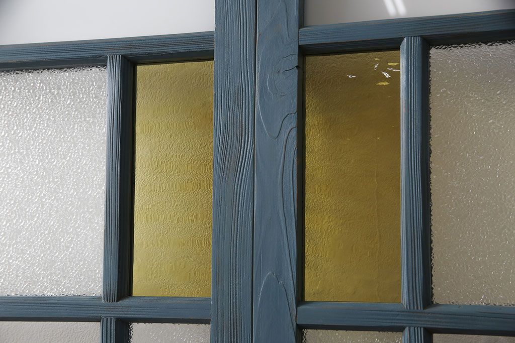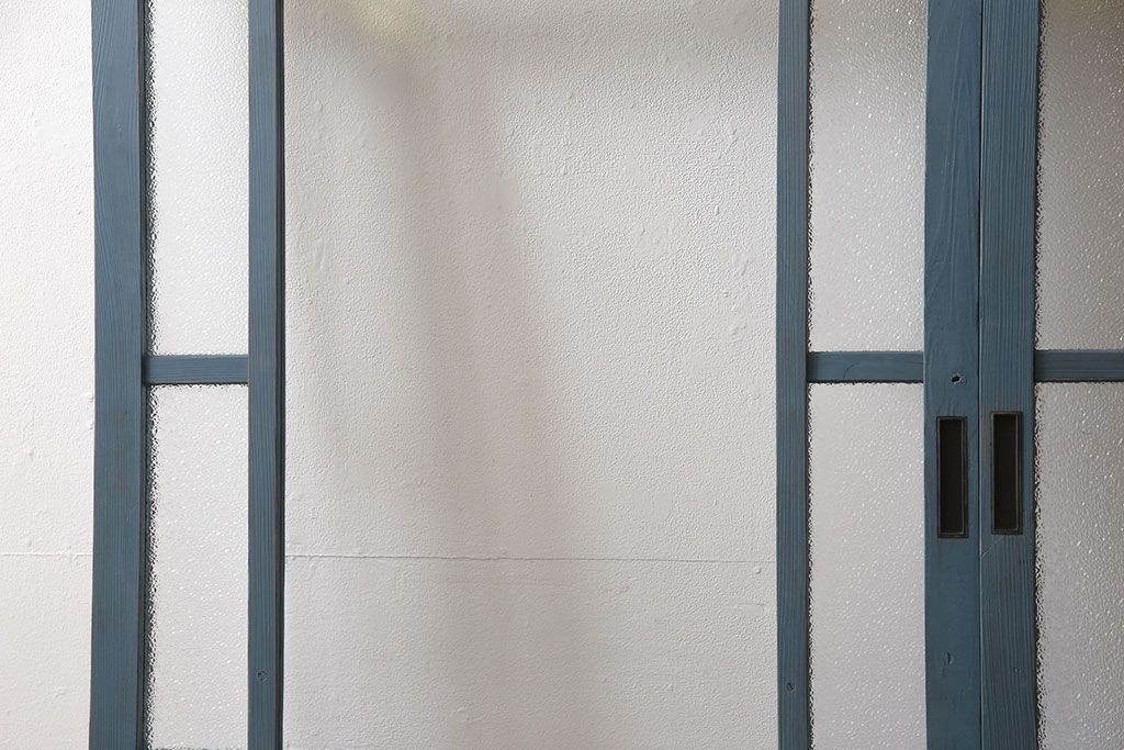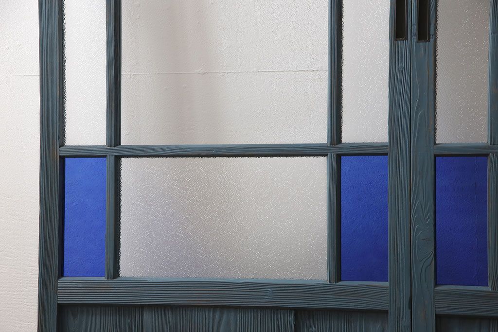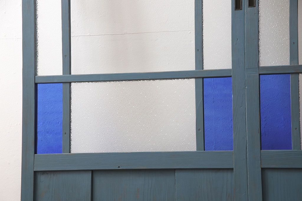 ドア・建具> ガラス戸 > 昭和初期のガラス戸2枚をリペア&カスタム!高さと幅をリサイズし、吊り戸仕様に変更。現状に合わせてくすんだ青色にペイント仕上げ。(引き戸、建具、色ガラス)