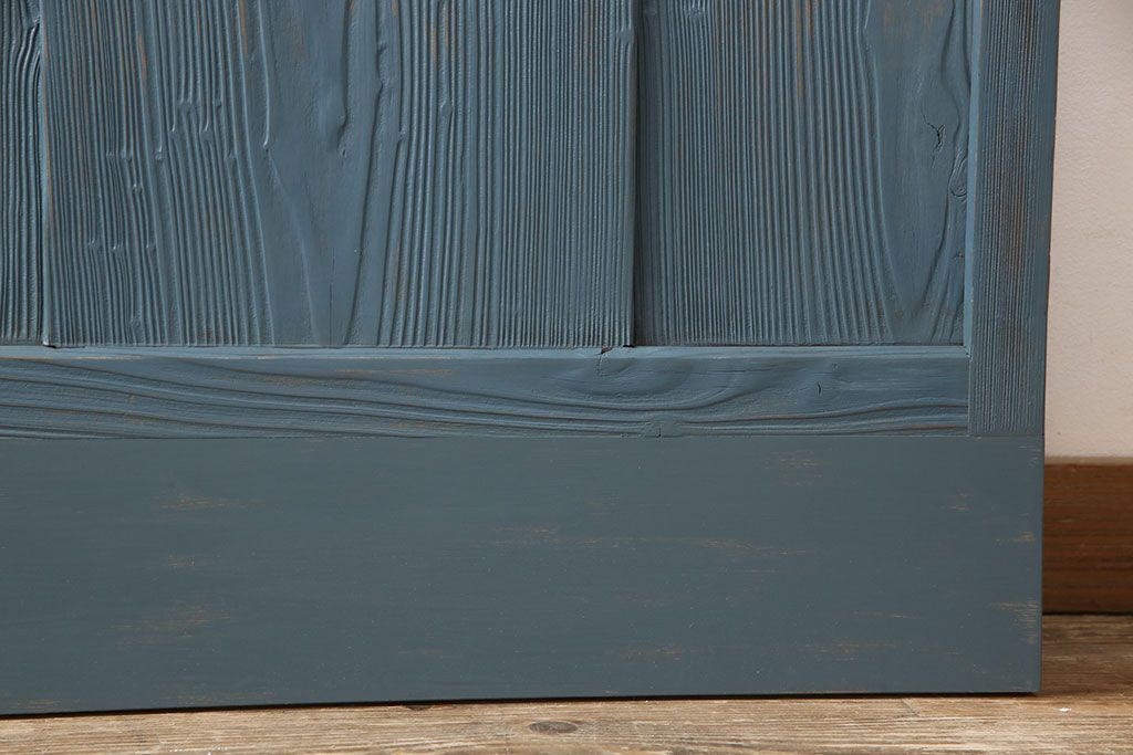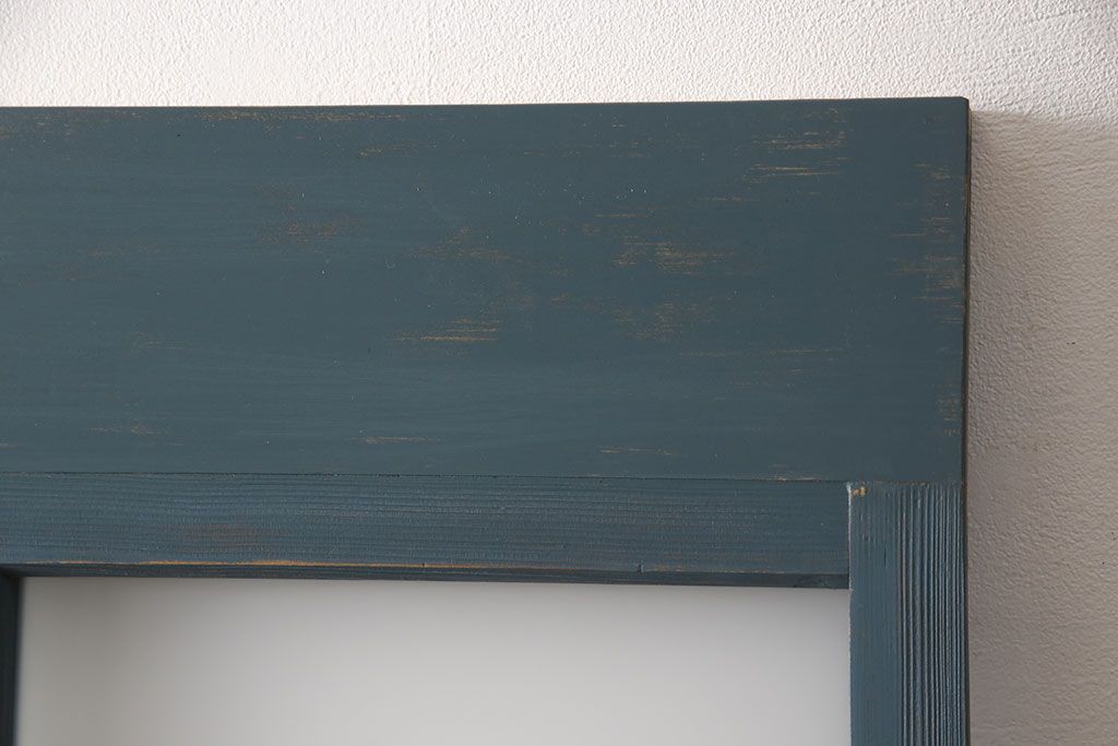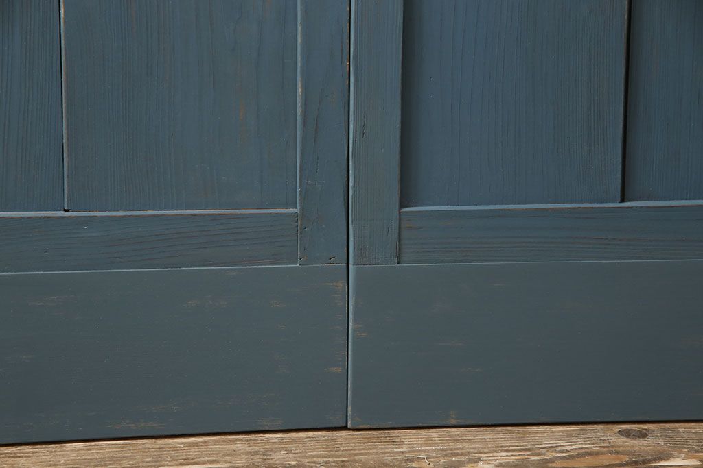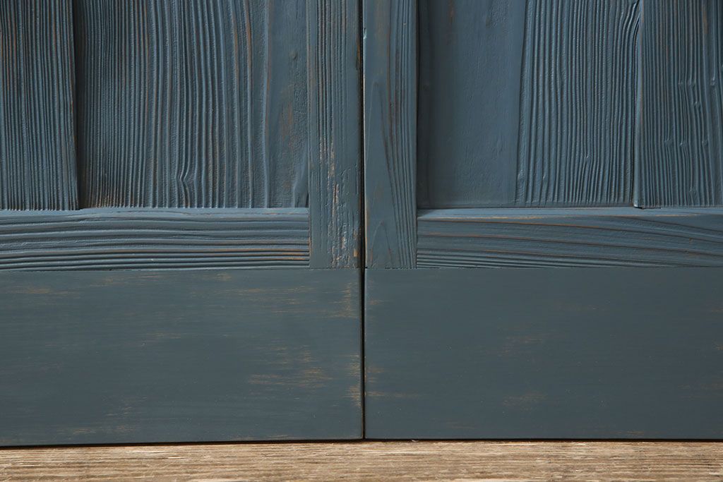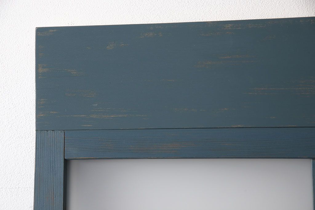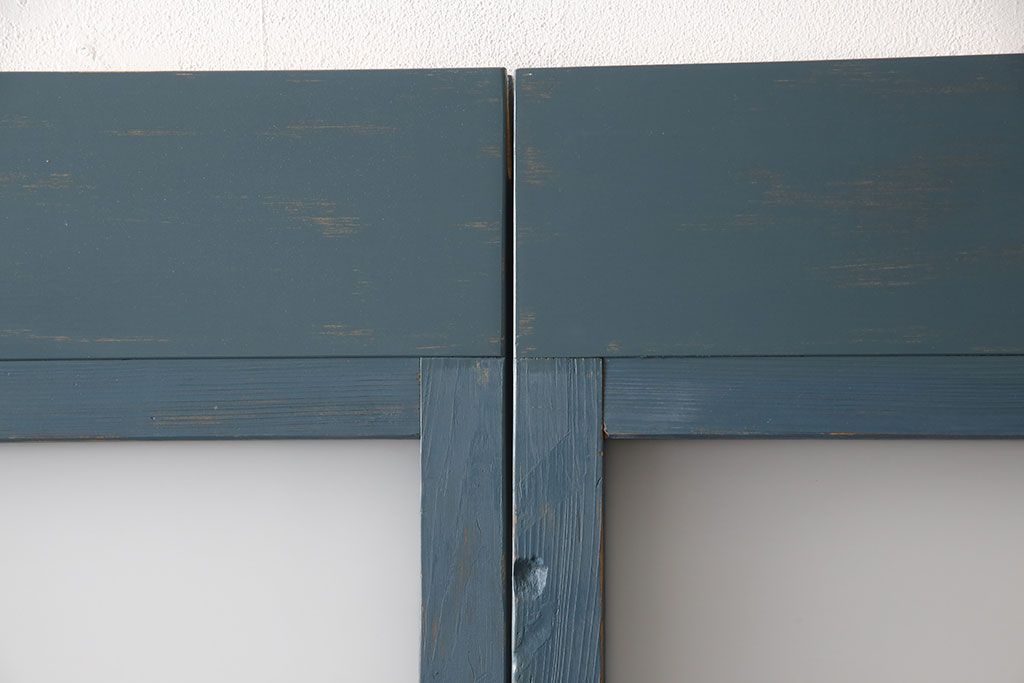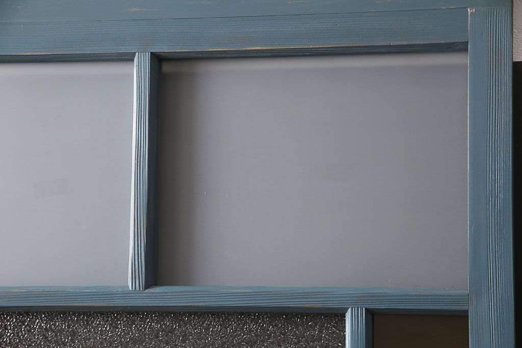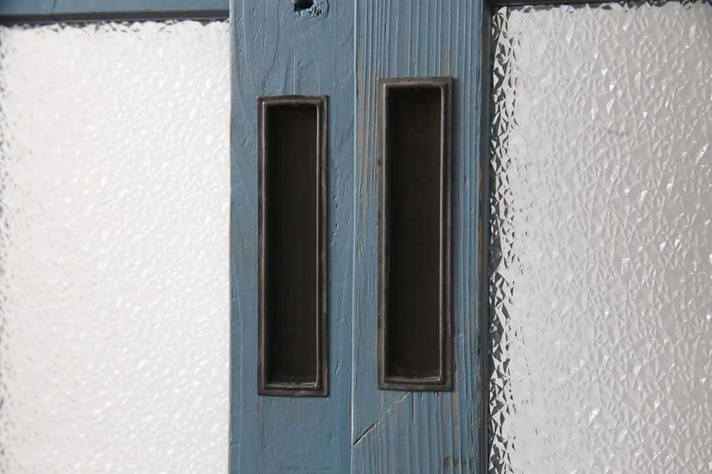 ドア・建具> ガラス戸 > 昭和初期のガラス戸2枚をリペア&カスタム!高さと幅をリサイズし、吊り戸仕様に変更。現状に合わせてくすんだ青色にペイント仕上げ。(引き戸、建具、色ガラス)