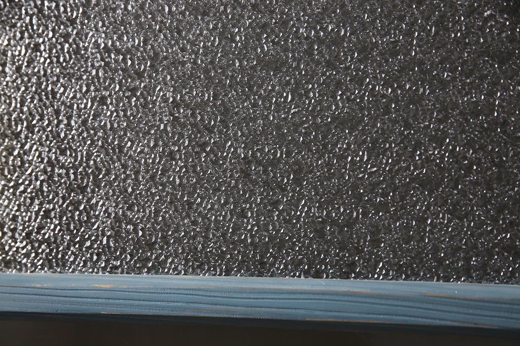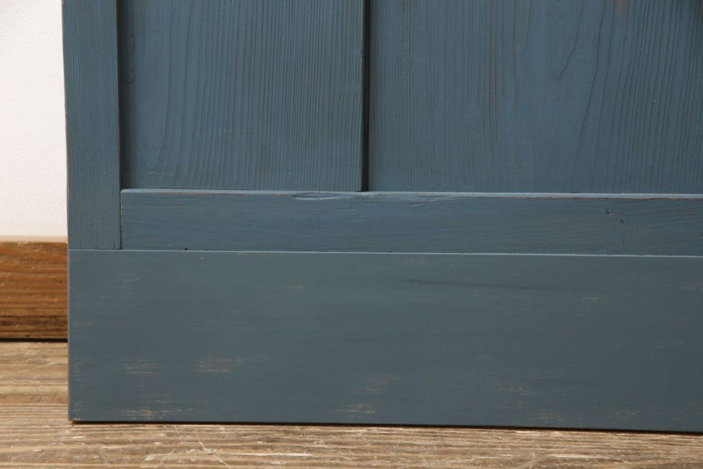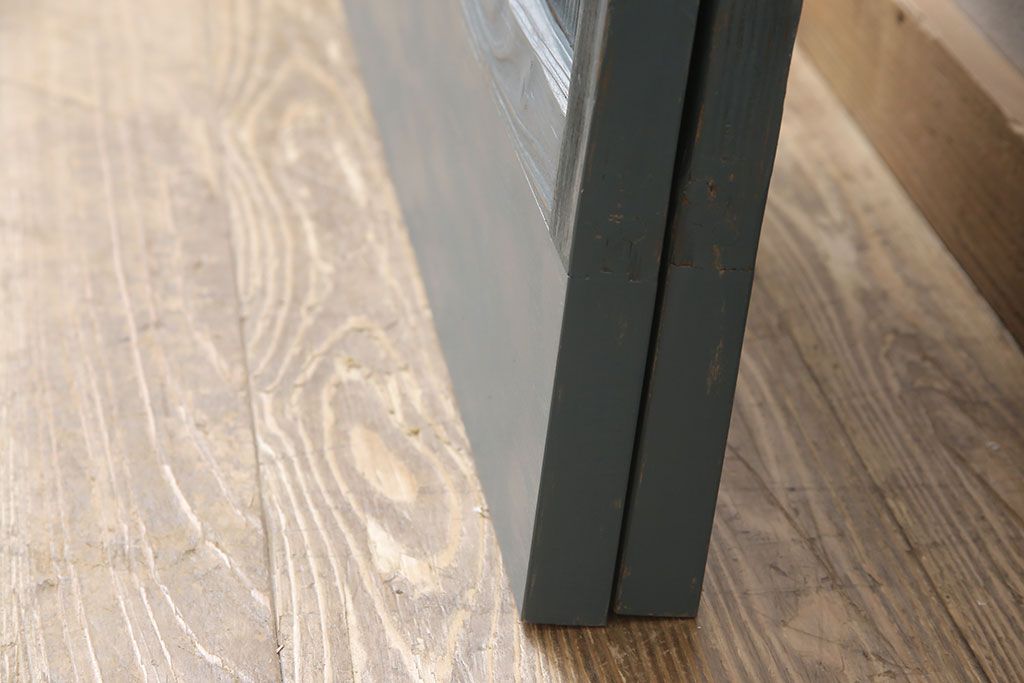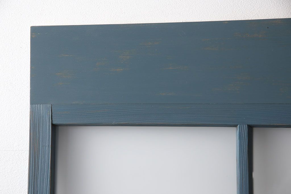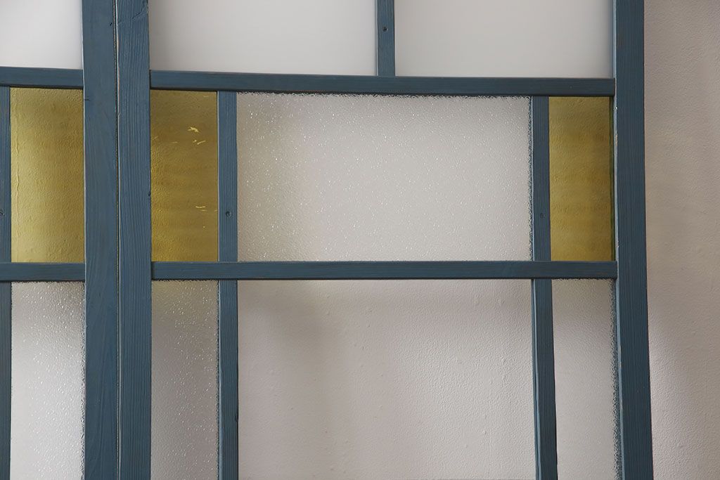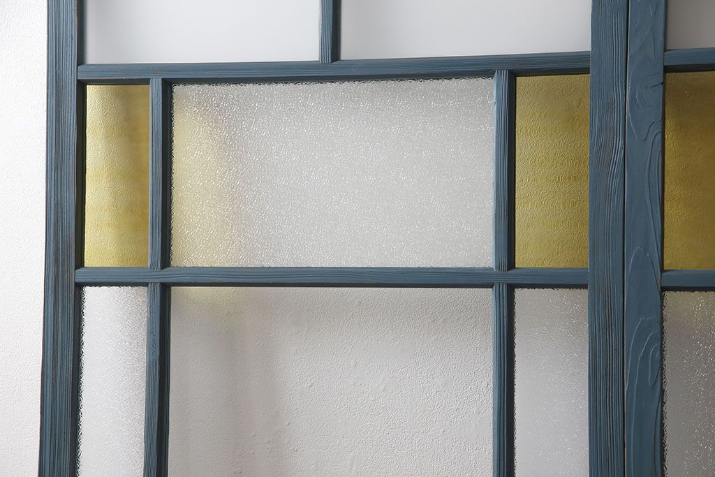 セミオーダー家具実績 > 昭和初期のガラス戸2枚をリペア&カスタム!高さと幅をリサイズし、吊り戸仕様に変更。現状に合わせてくすんだ青色にペイント仕上げ。(引き戸、建具、色ガラス)