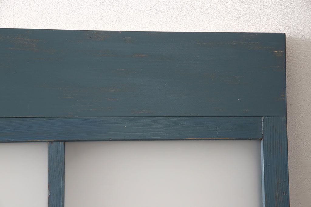 昭和初期のガラス戸2枚をリペア&カスタム!高さと幅をリサイズし、吊り戸仕様に変更。現状に合わせてくすんだ青色にペイント仕上げ。(引き戸、建具、色ガラス)