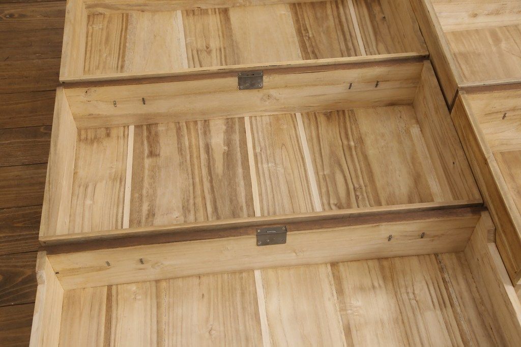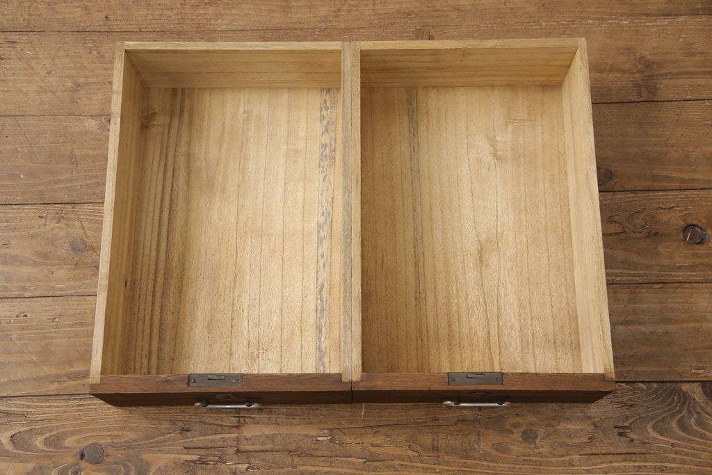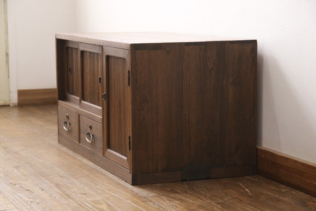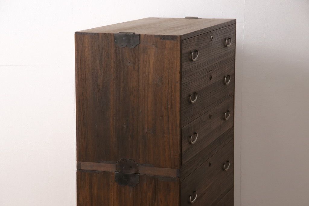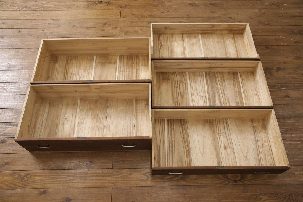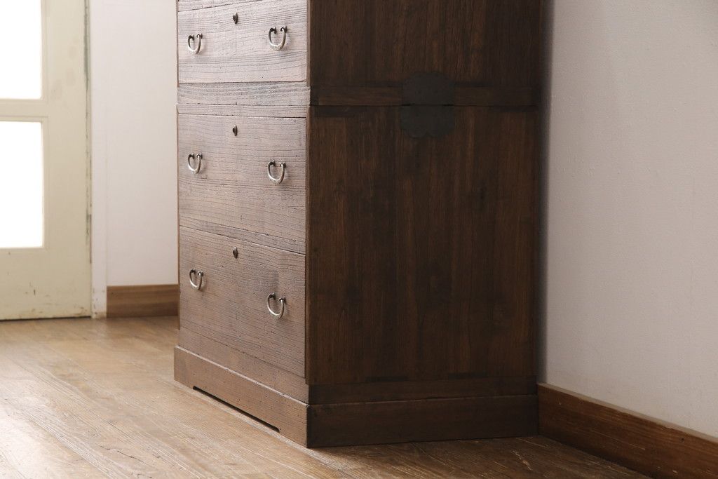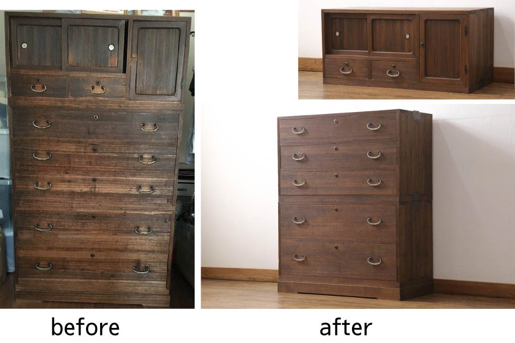 3段重ね桐箪笥をテレビボードとチェストにリメイク!上段は天板を補強しテレビボードに。中段・下段は重ねチェストに。いずれもオーク系で着色仕上げ。