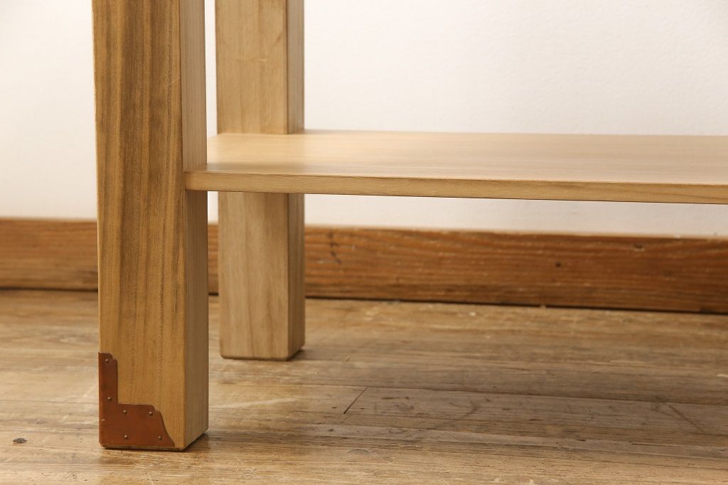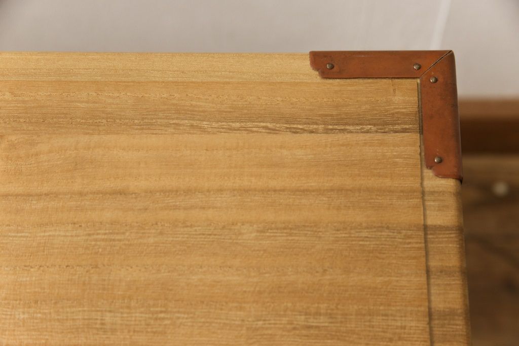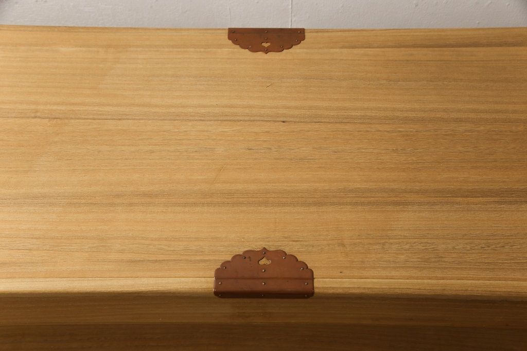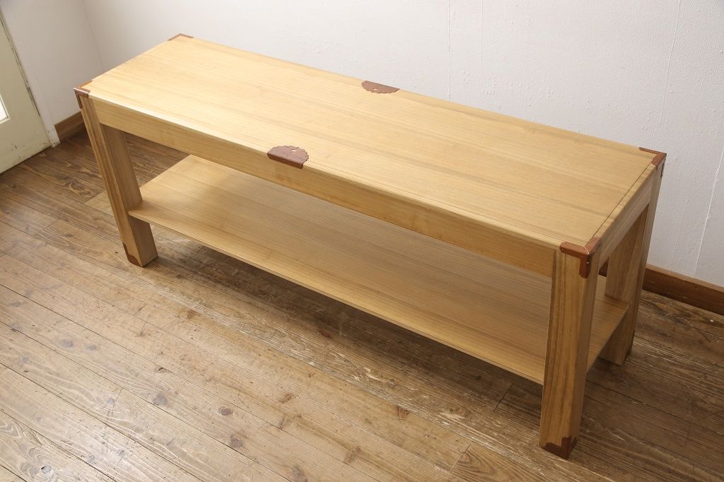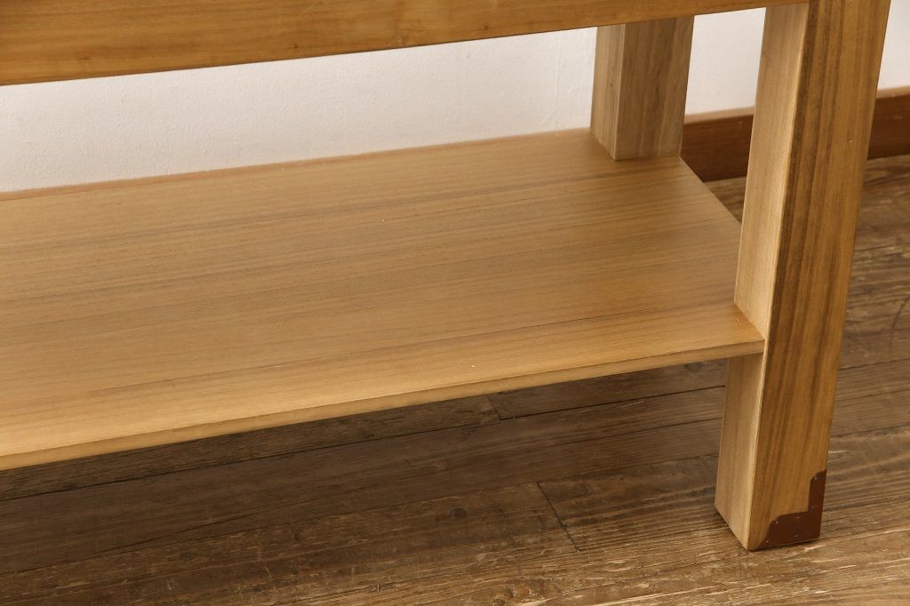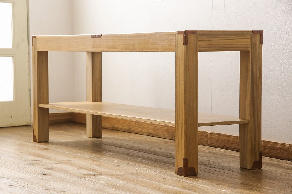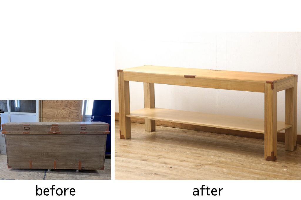 長持をテーブルにリメイク!脚は長持の材料を剥ぎ合わせて制作、天板には蓋部分に取り付けられていた金具を移設。棚板を取り付けて、汚れを洗浄しウレタン塗装仕上げに。