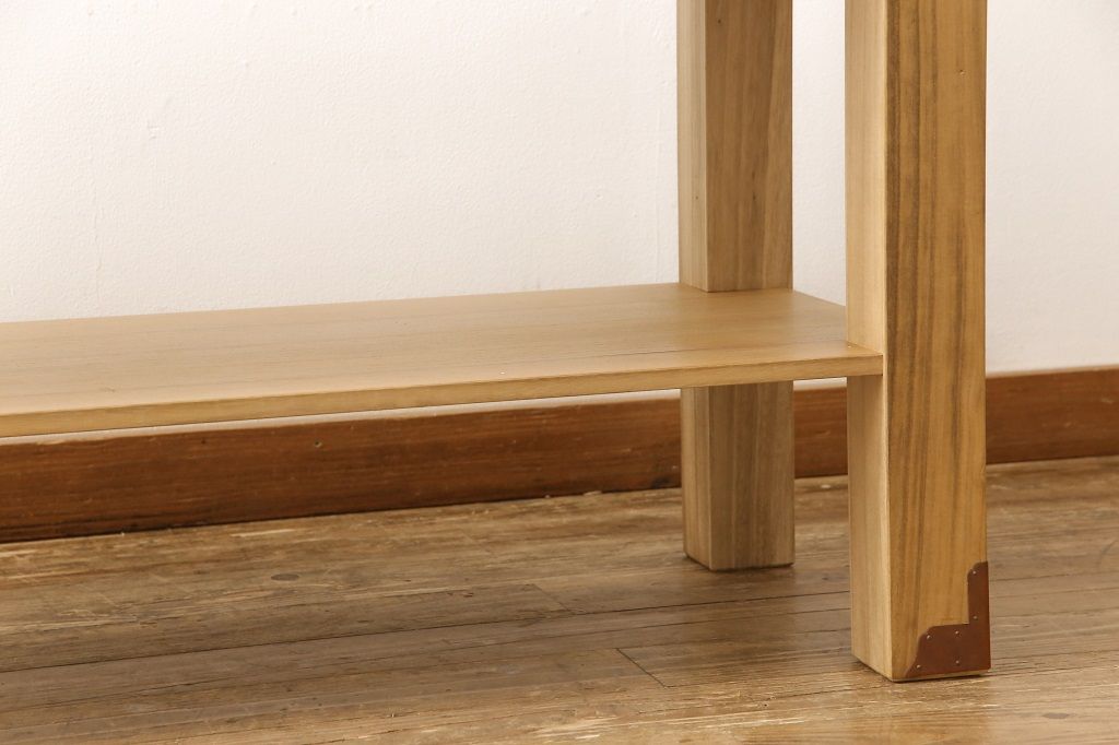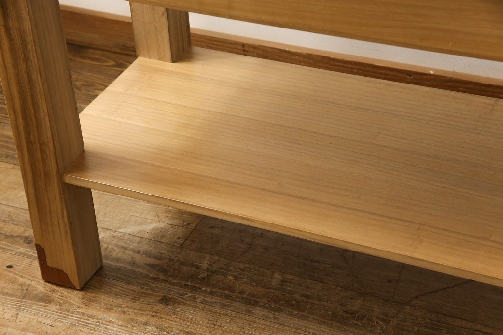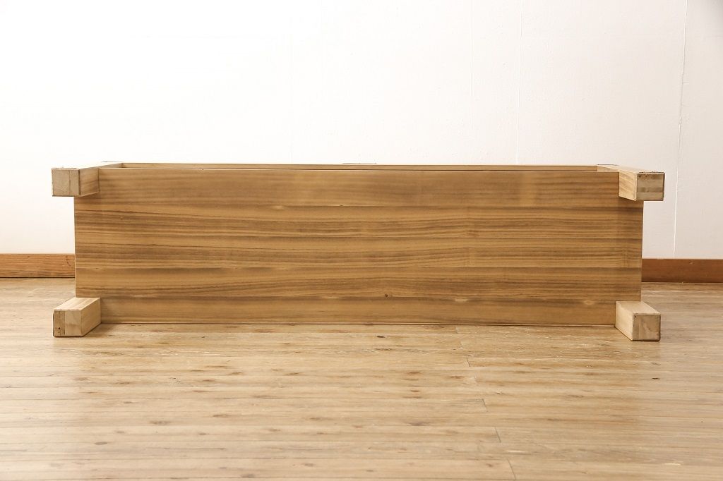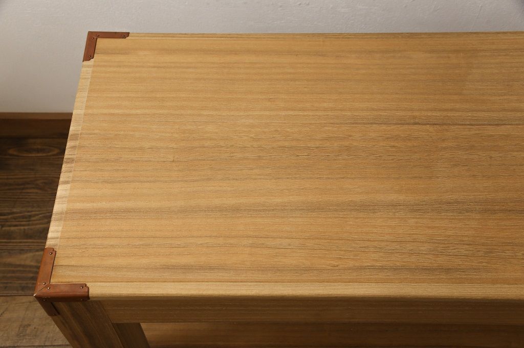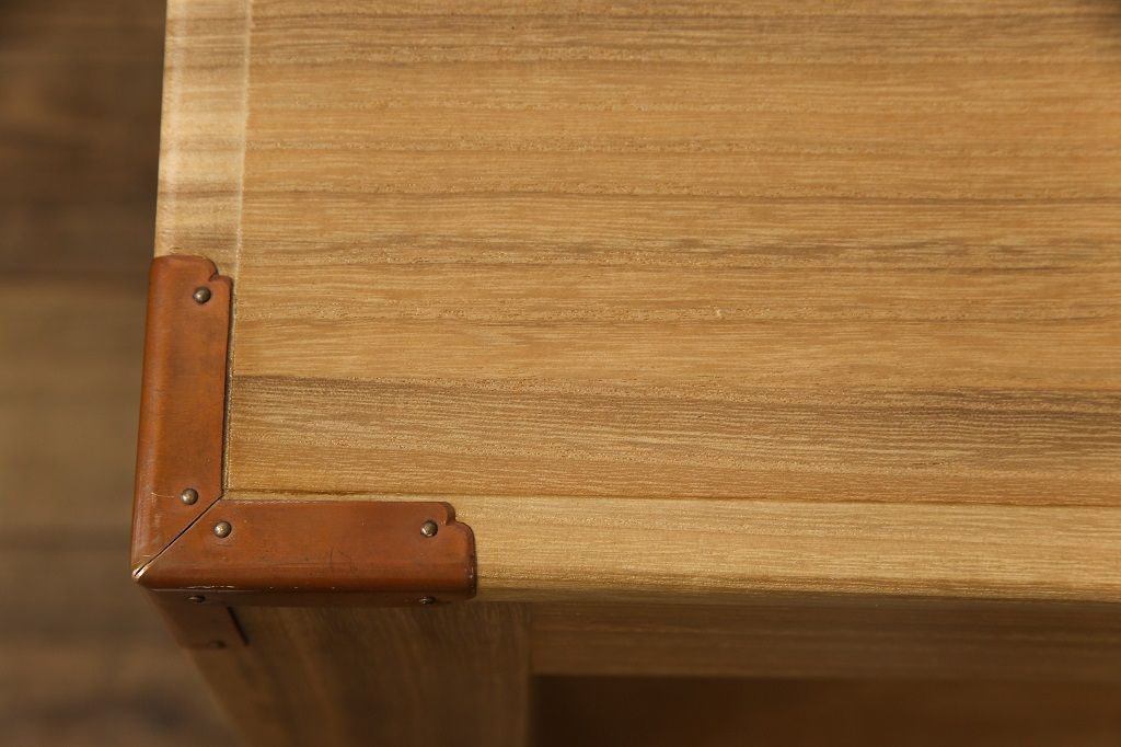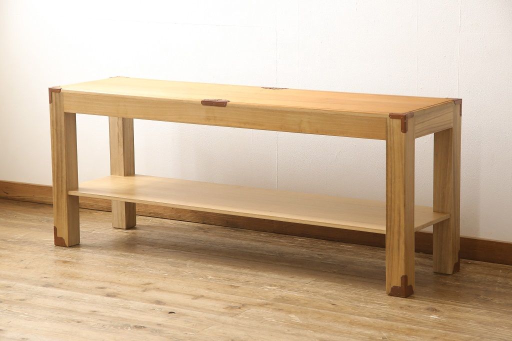 長持をテーブルにリメイク!脚は長持の材料を剥ぎ合わせて制作、天板には蓋部分に取り付けられていた金具を移設。棚板を取り付けて、汚れを洗浄しウレタン塗装仕上げに。
