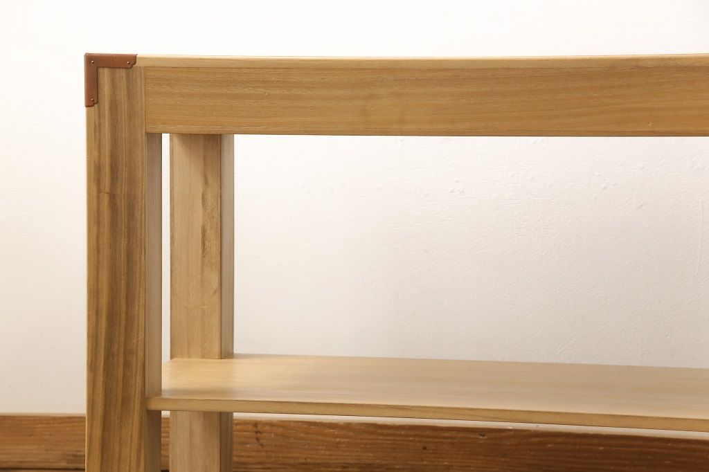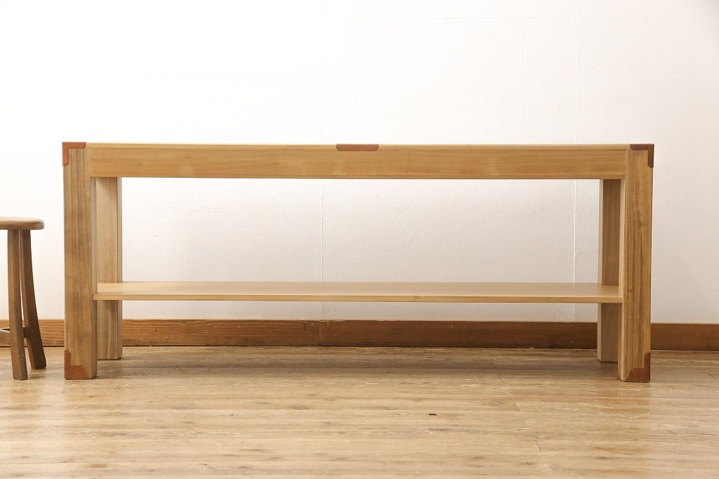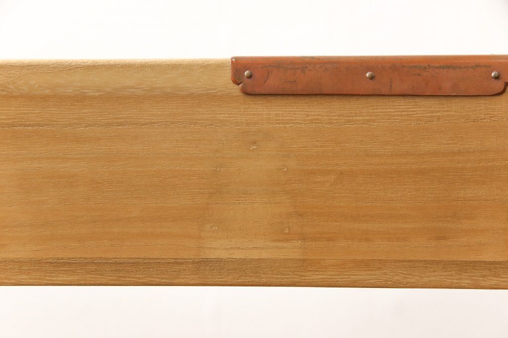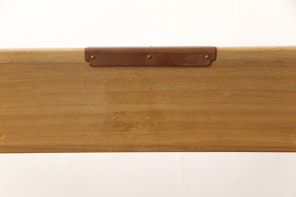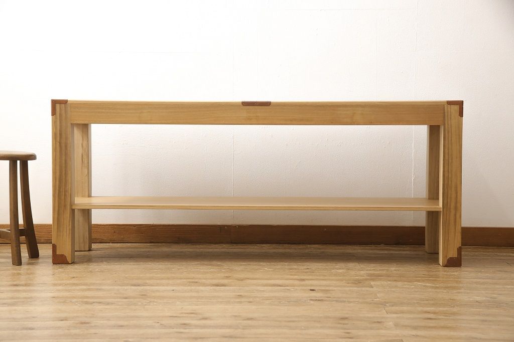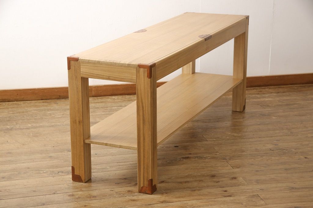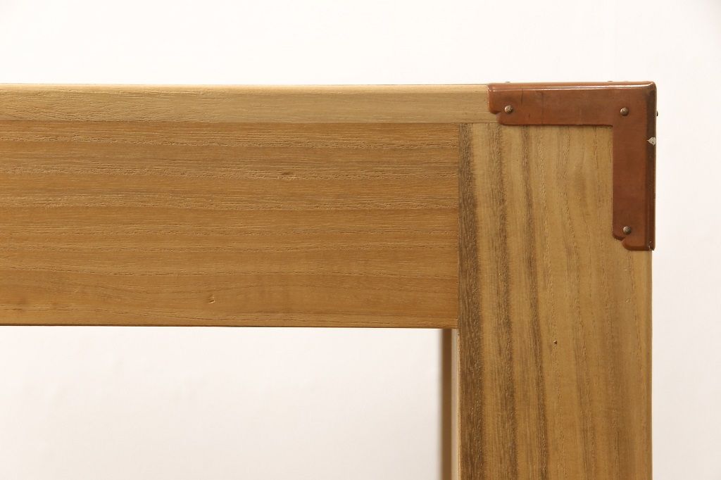 長持をテーブルにリメイク!脚は長持の材料を剥ぎ合わせて制作、天板には蓋部分に取り付けられていた金具を移設。棚板を取り付けて、汚れを洗浄しウレタン塗装仕上げに。