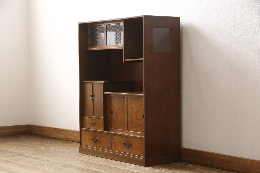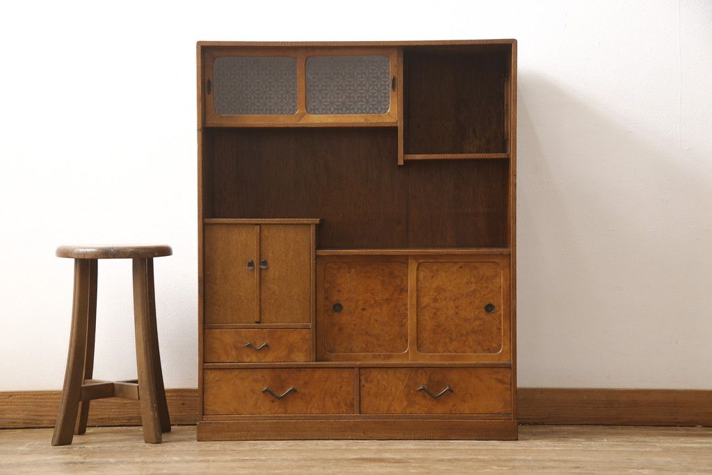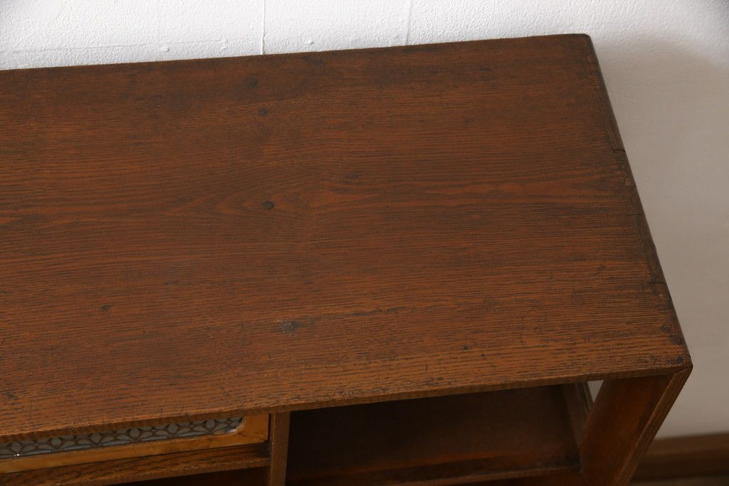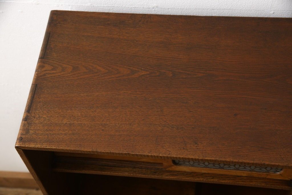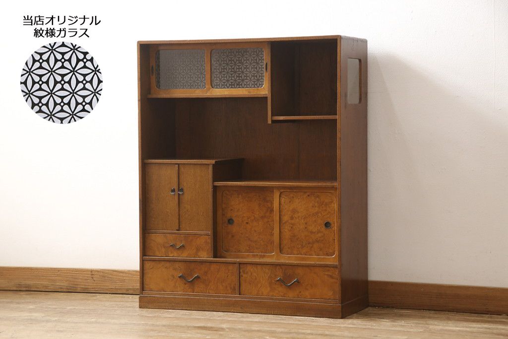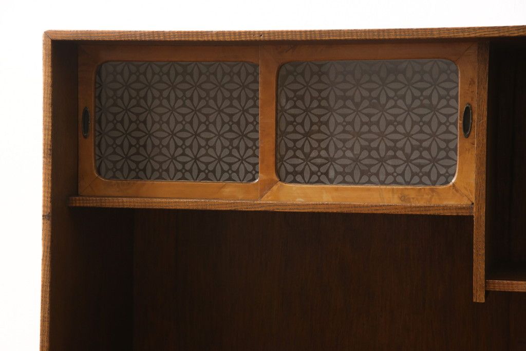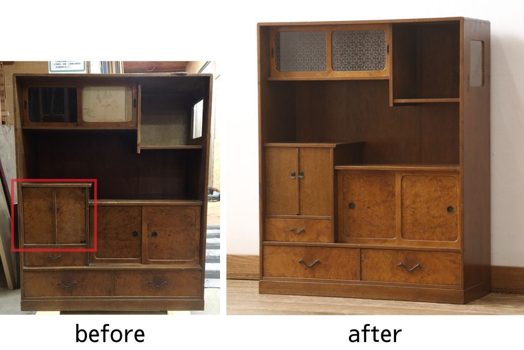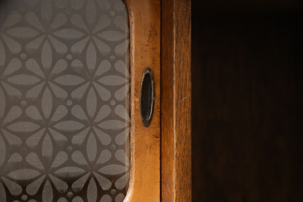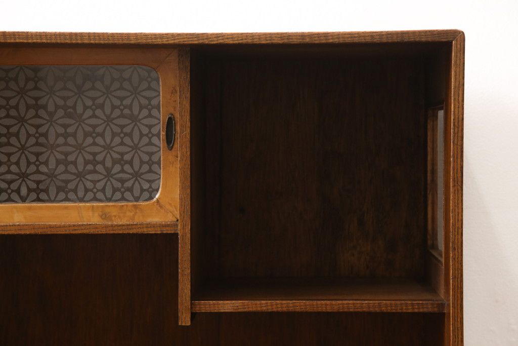茶棚を綺麗に再生!高品質リペアを施し、引き違い戸に花柄ガラスを取り付け。上部の戸当たりは取り除き、現状の色味を活かした塗装仕上げ。