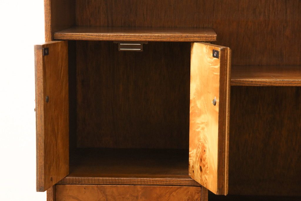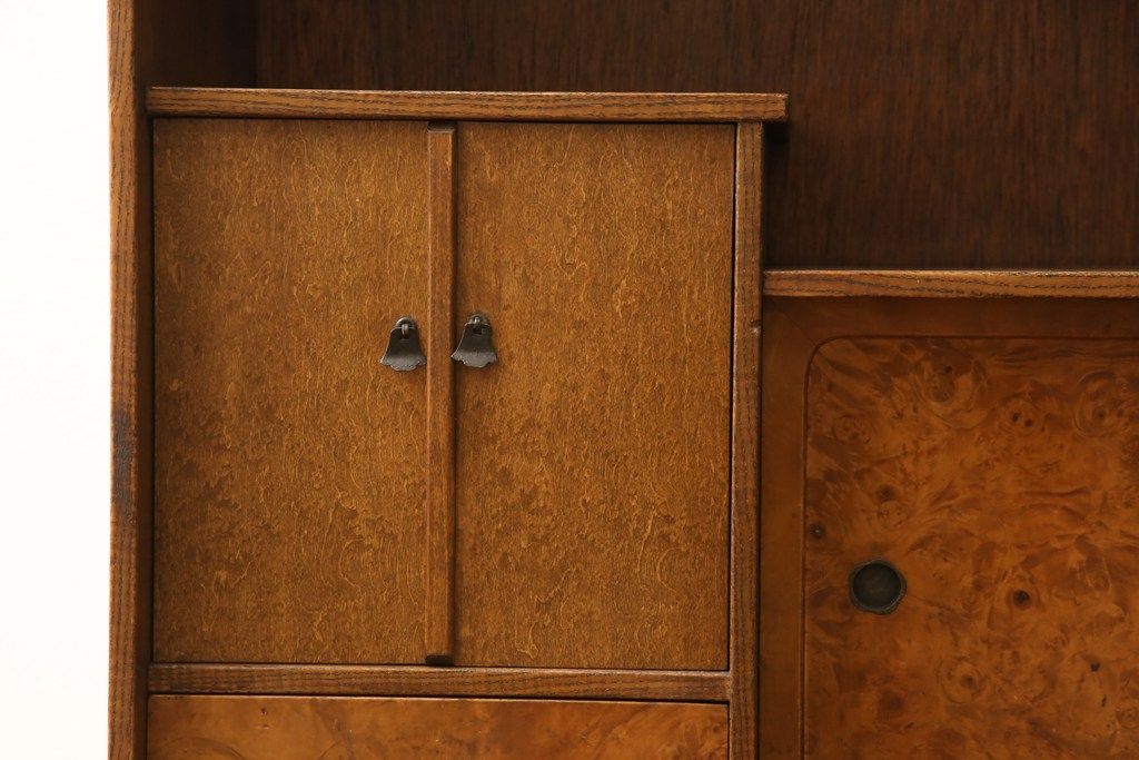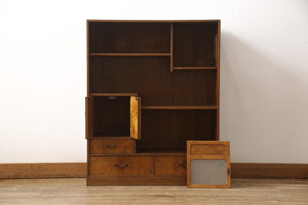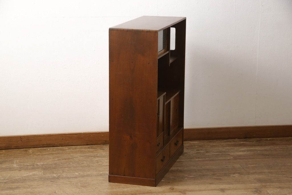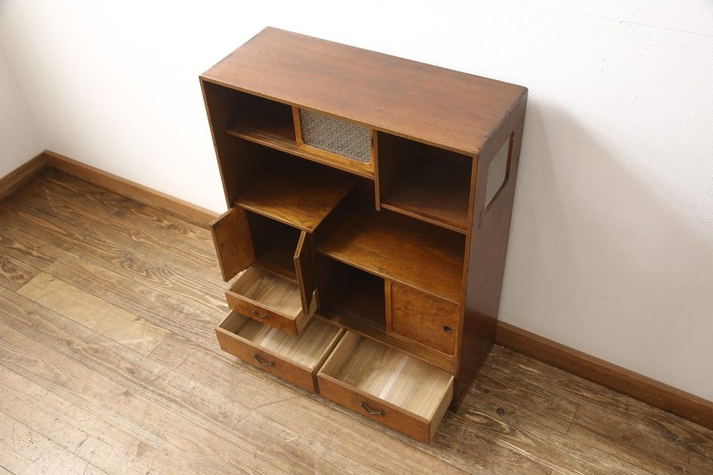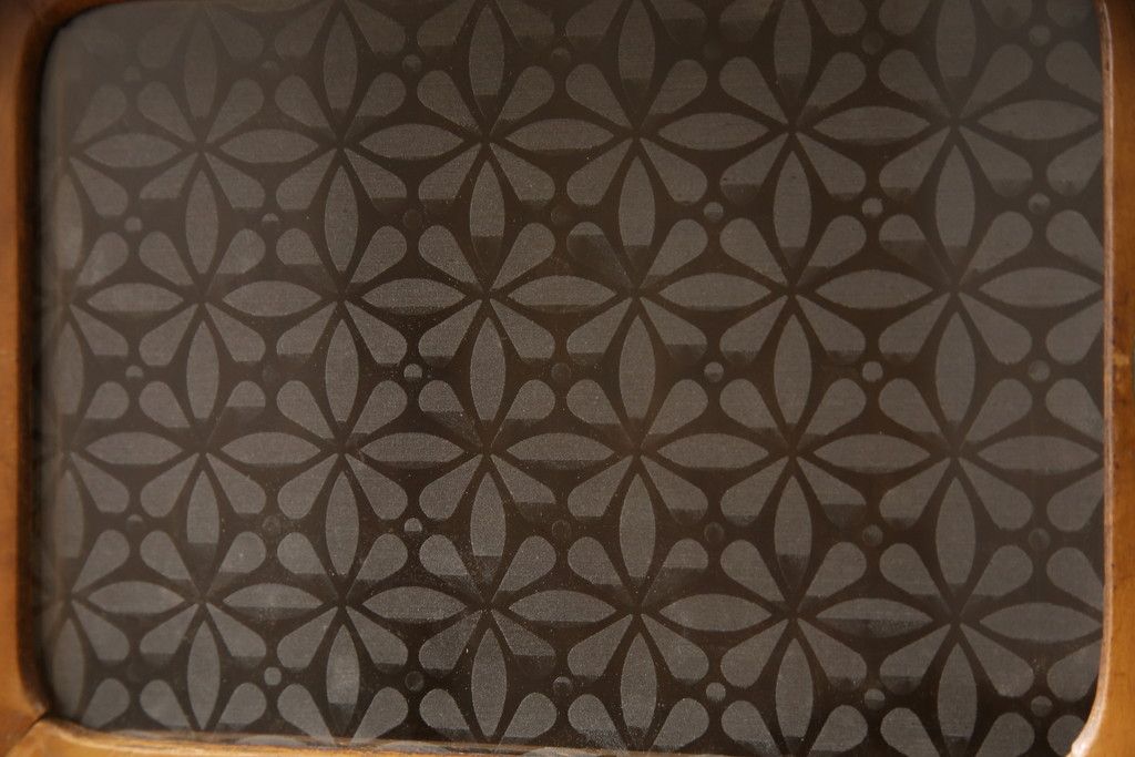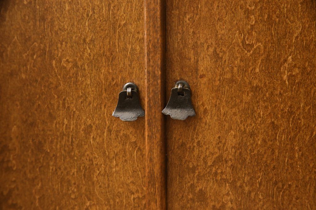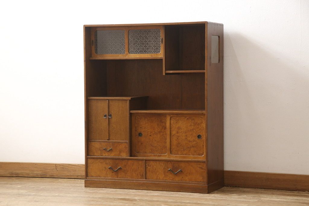 茶棚を綺麗に再生!高品質リペアを施し、引き違い戸に花柄ガラスを取り付け。上部の戸当たりは取り除き、現状の色味を活かした塗装仕上げ。