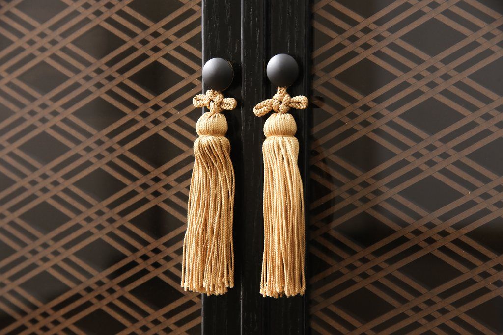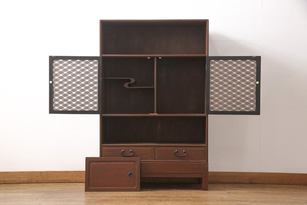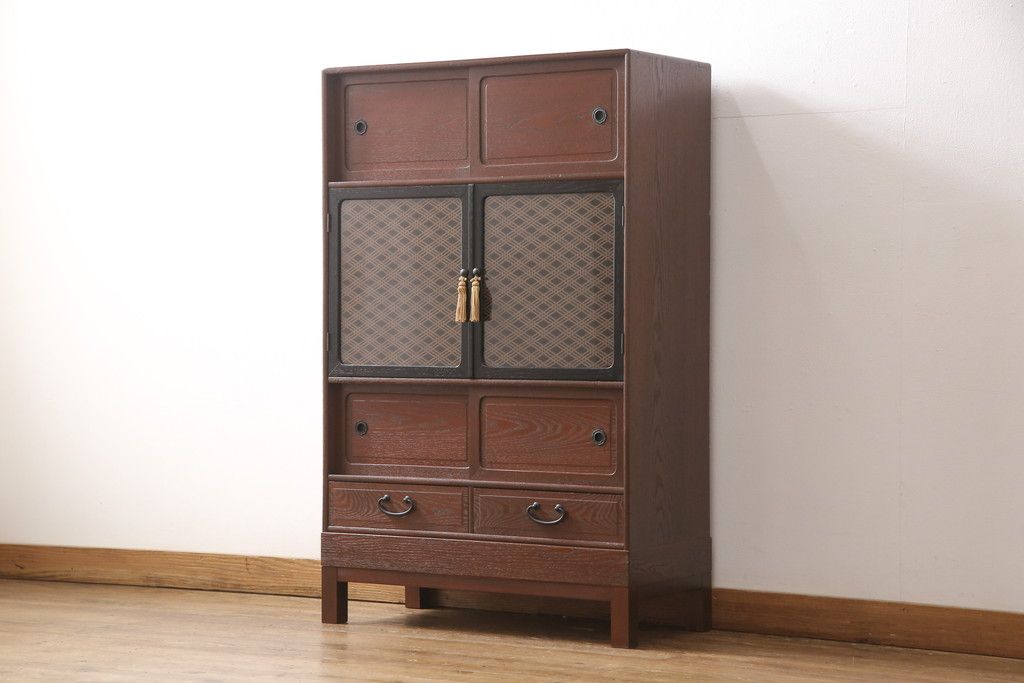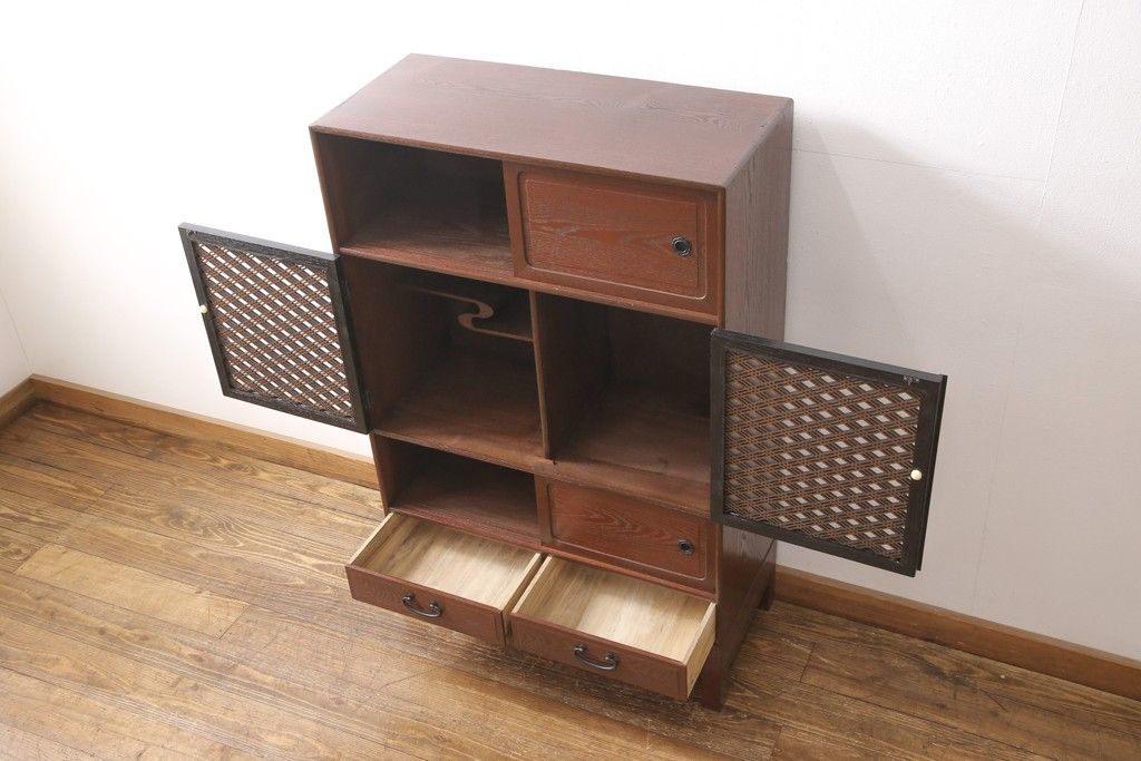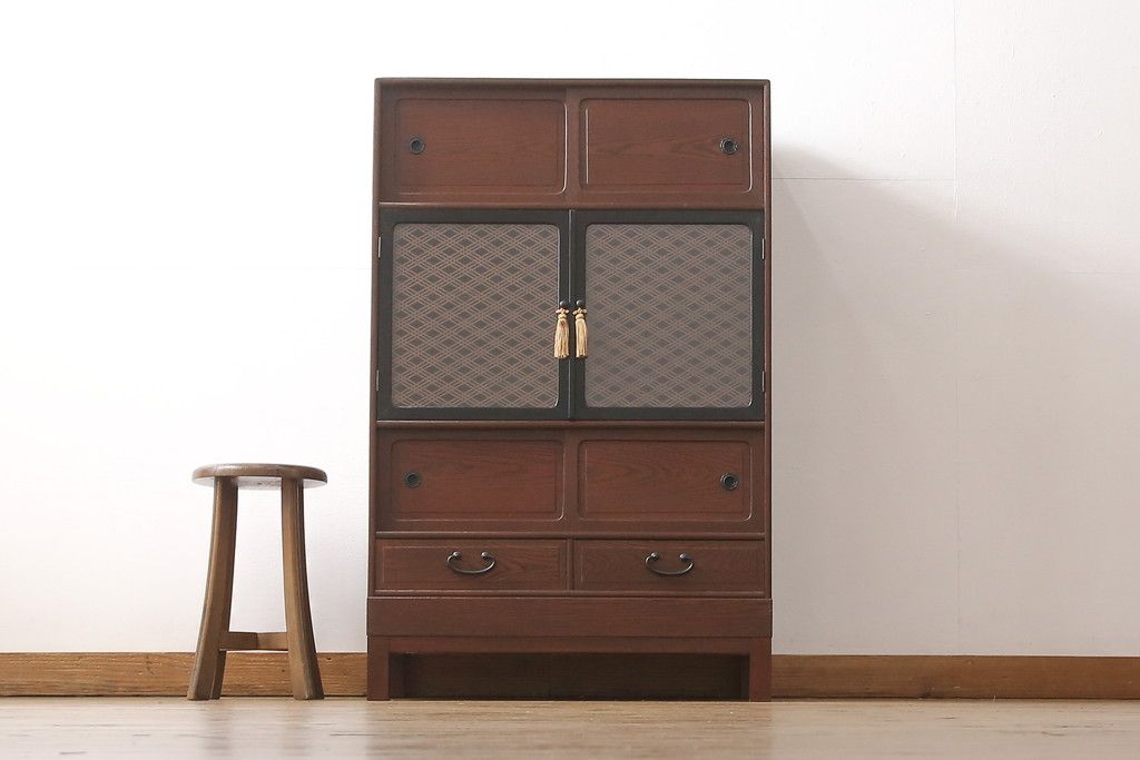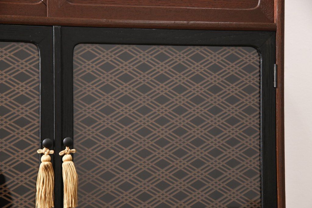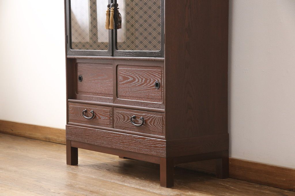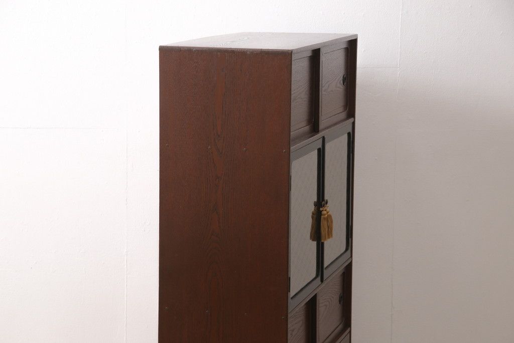 お手持ちの家具・建具リメイク実績 > 茶箪笥を使いやすくリメイク!ガラス戸がある段を、組子ガラス入りの観音扉仕様の棚に変更。扉に房付きの取っ手を取り付け。他の取っ手や引き手を交換し、脚を取り付け。既存の塗装は剥離し、深みのある赤色に着色仕上げ。