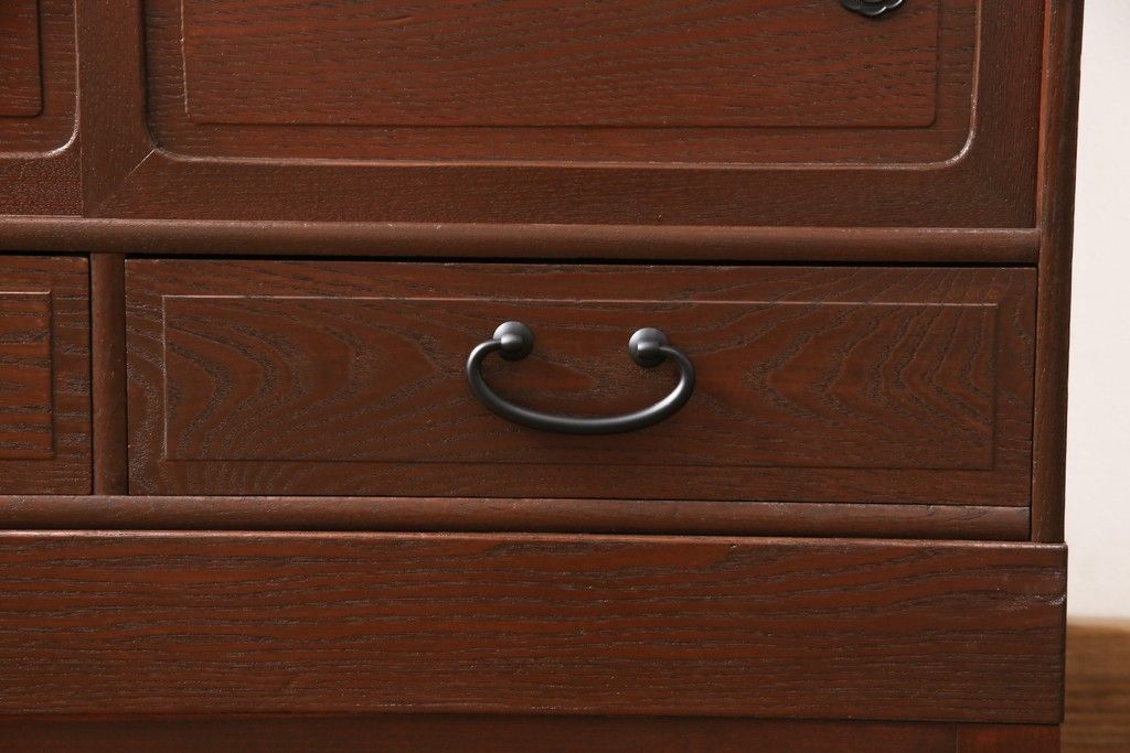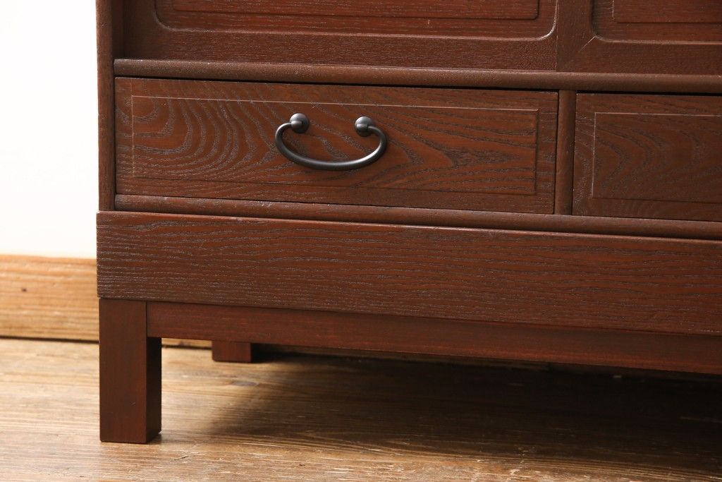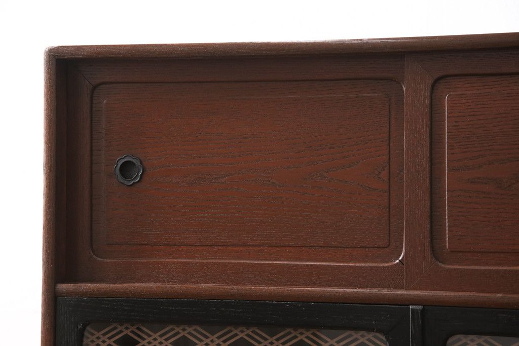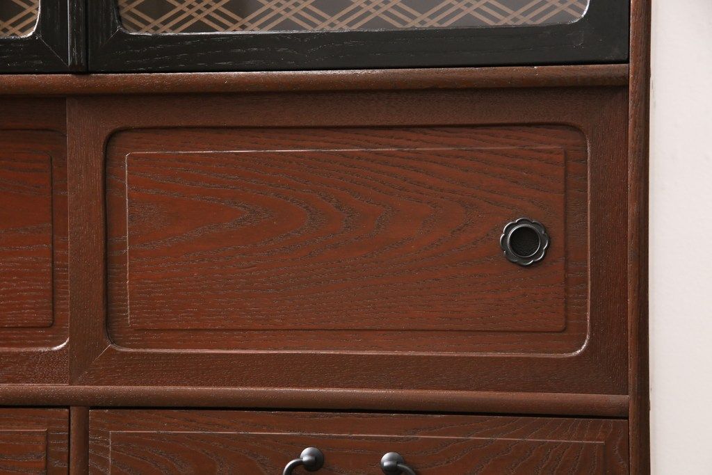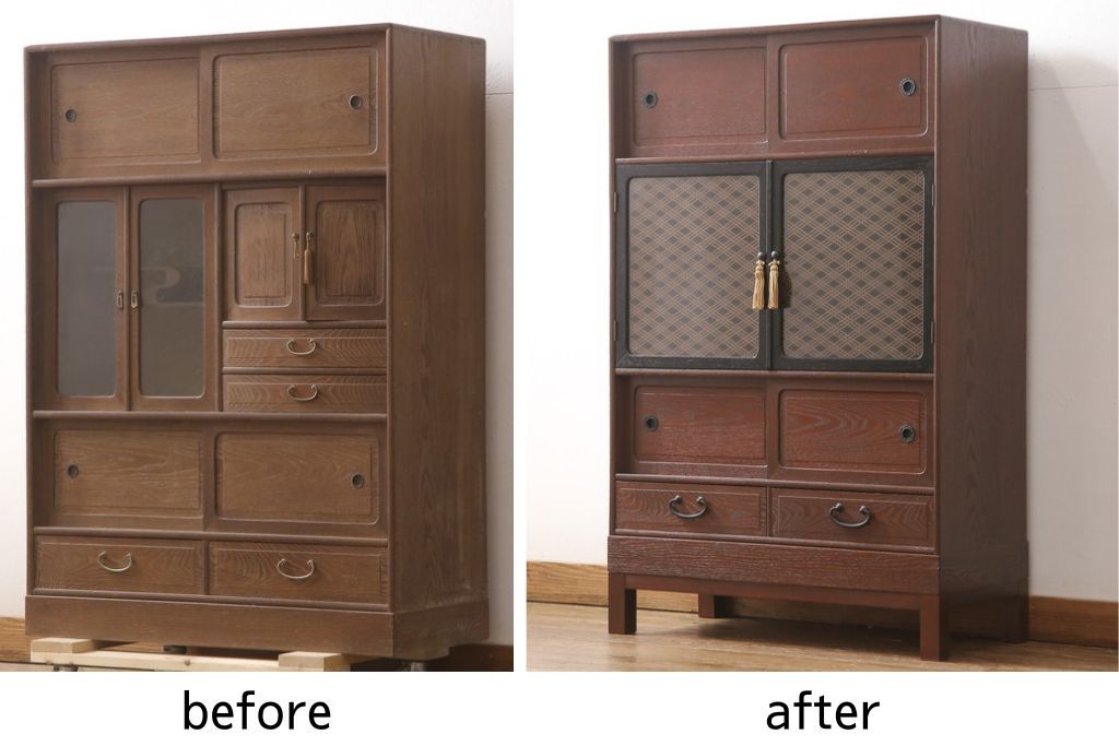 茶箪笥を使いやすくリメイク!ガラス戸がある段を、組子ガラス入りの観音扉仕様の棚に変更。扉に房付きの取っ手を取り付け。他の取っ手や引き手を交換し、脚を取り付け。既存の塗装は剥離し、深みのある赤色に着色仕上げ。