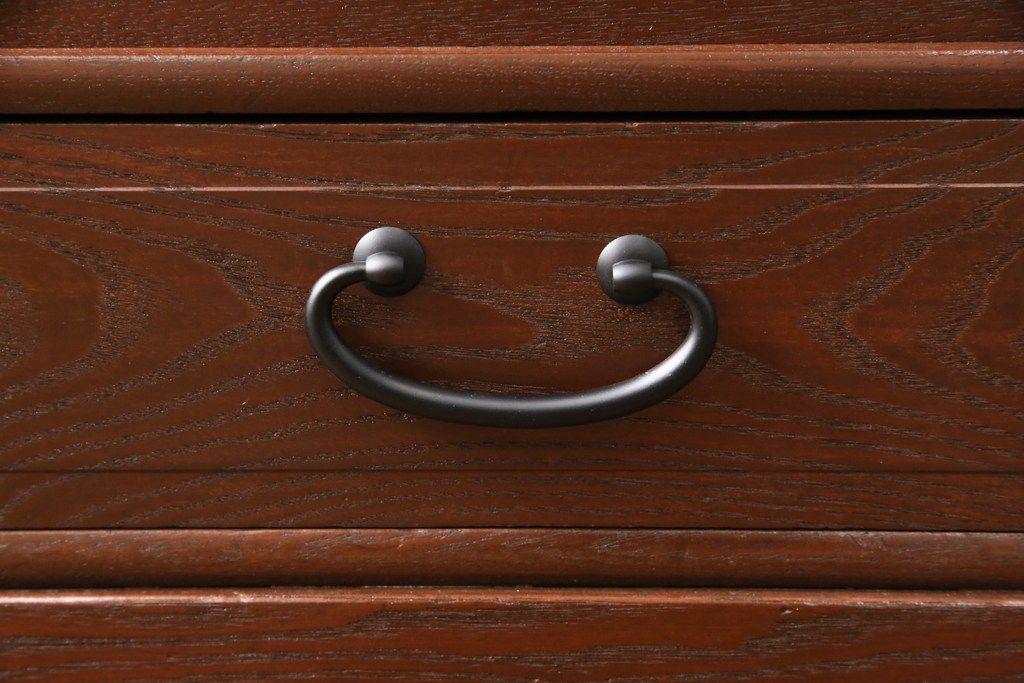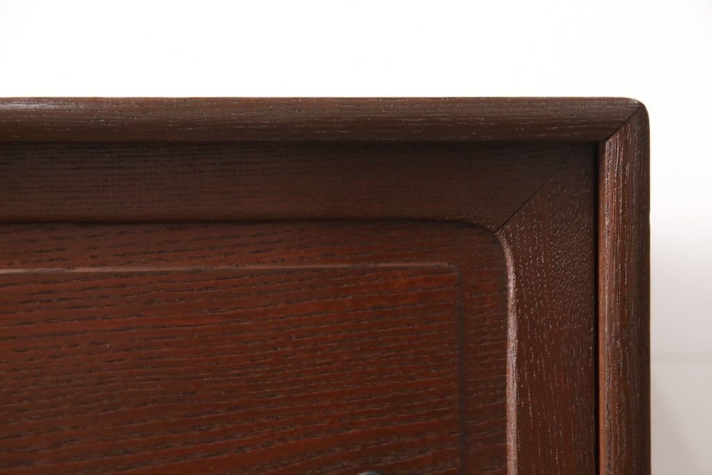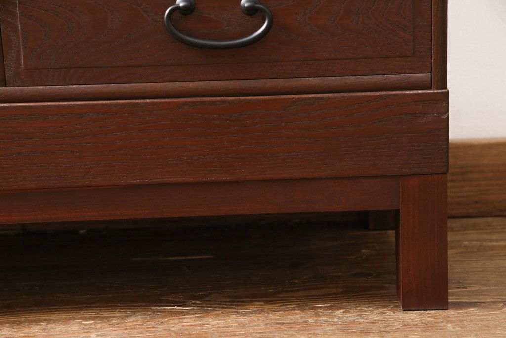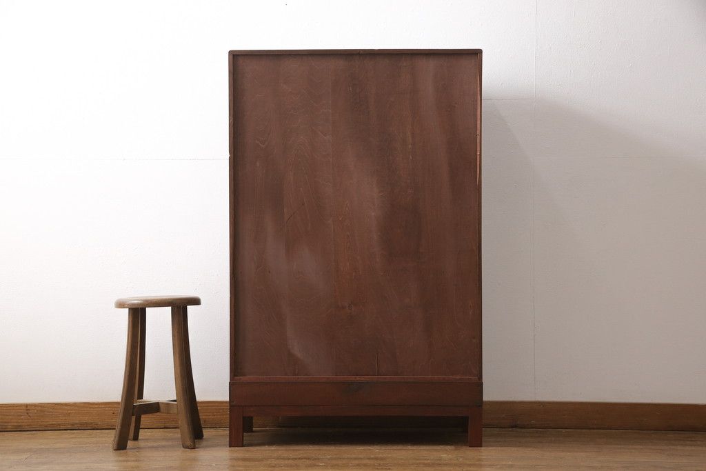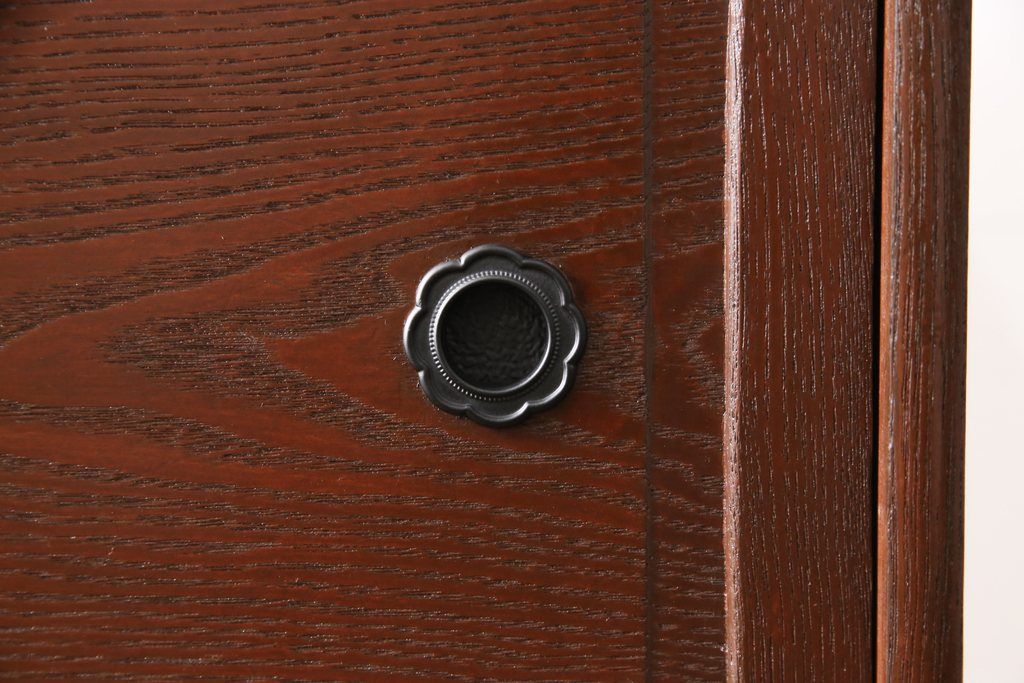茶箪笥を使いやすくリメイク!ガラス戸がある段を、組子ガラス入りの観音扉仕様の棚に変更。扉に房付きの取っ手を取り付け。他の取っ手や引き手を交換し、脚を取り付け。既存の塗装は剥離し、深みのある赤色に着色仕上げ。