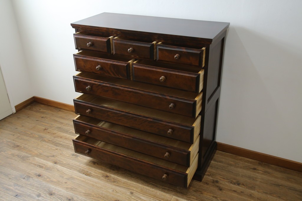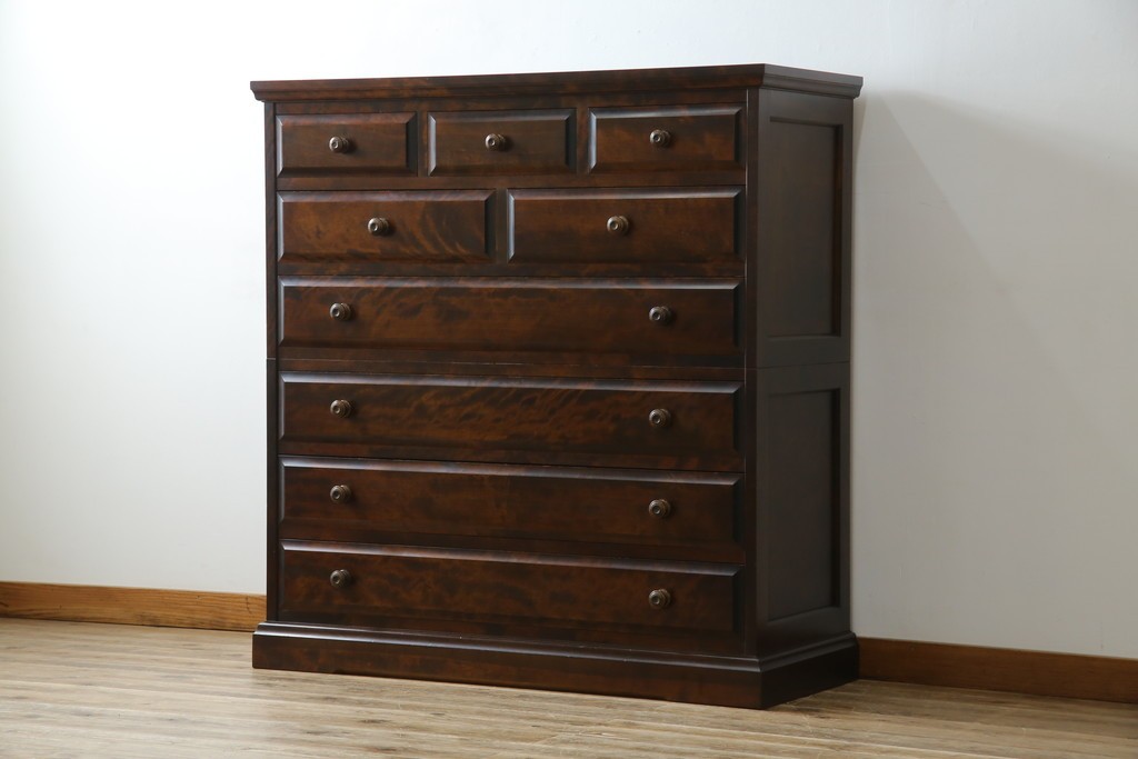 安らぎとぬくもり溢れる天然の木によって生み出される質感と、末永く使える作りの良さで人気の北海道民芸家具の整理タンスです。