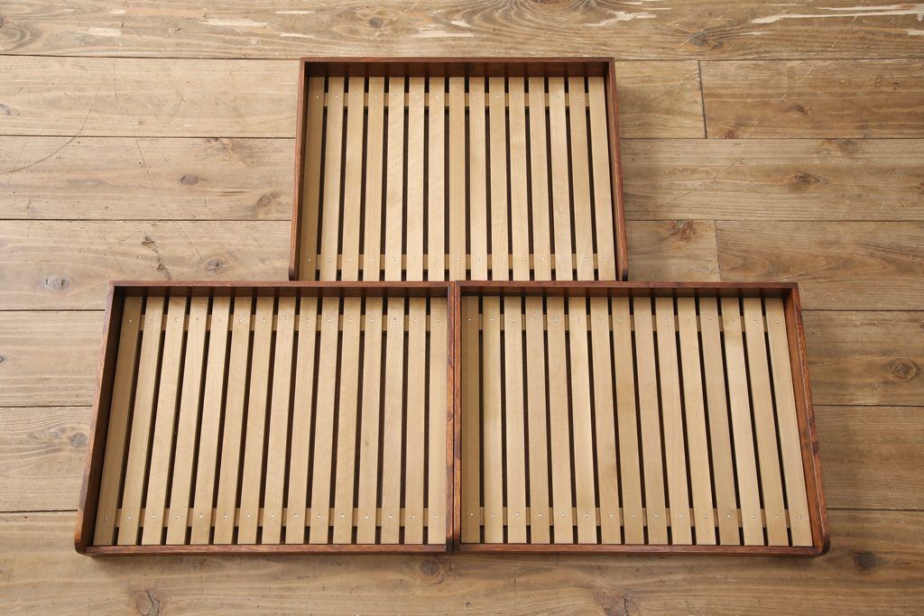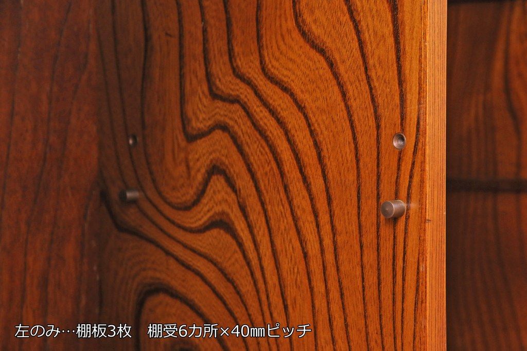 棚板は取り外しできます。棚板は3枚あります。棚受けは6ヶ所、40mmピッチで調整できます。棚幅サイズのものが1枚の作りです。