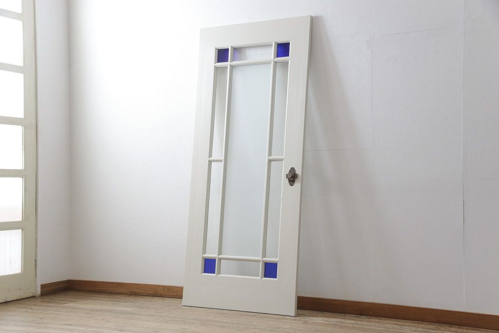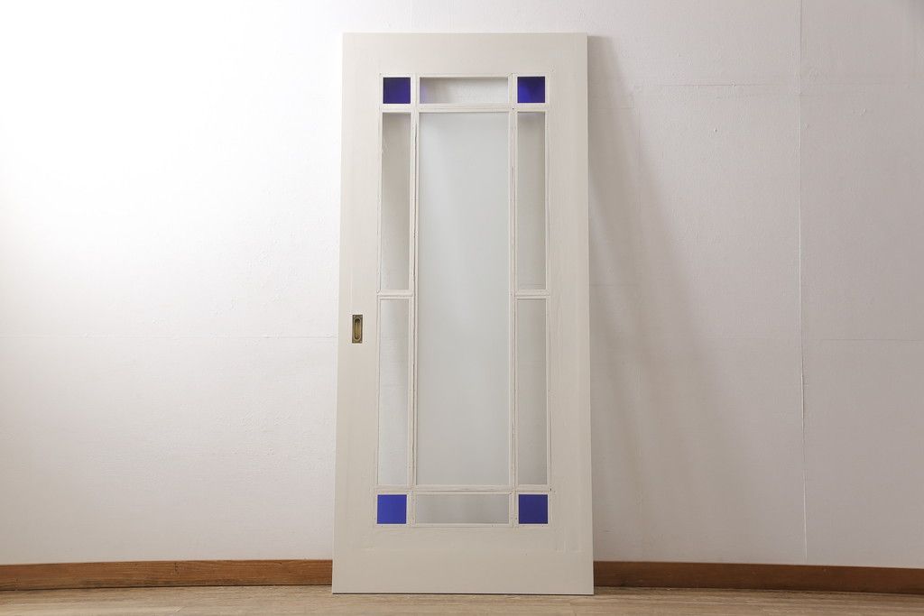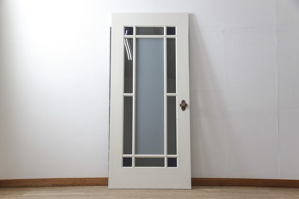 木製ドアをリペア&カスタム!リサイズし、中央ガラスをすりガラスに差し替え。既存のドアレバーを取り外して埋木処理し、アンティークの引手金具を取り付け。本体をアンティークホワイトでペイント仕上げ。(扉、建具)