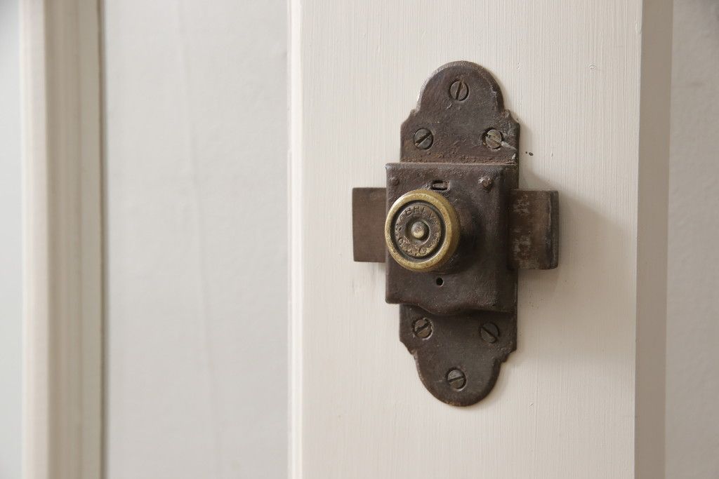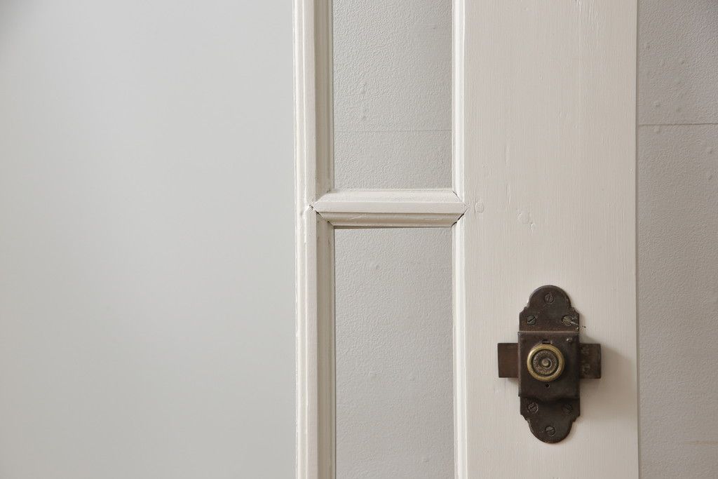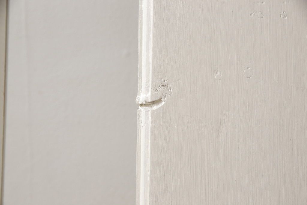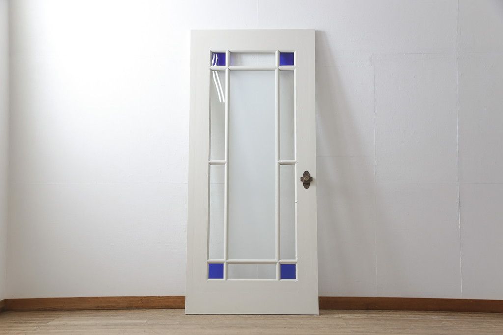 ドア・建具> ガラス戸 > 木製ドアをリペア&カスタム!リサイズし、中央ガラスをすりガラスに差し替え。既存のドアレバーを取り外して埋木処理し、アンティークの引手金具を取り付け。本体をアンティークホワイトでペイント仕上げ。(扉、建具)