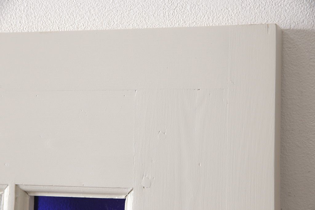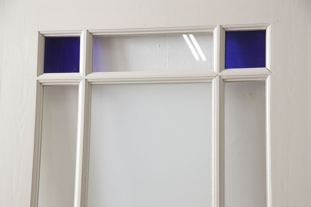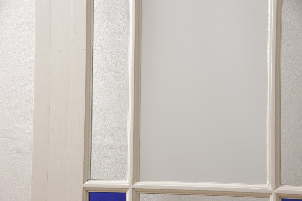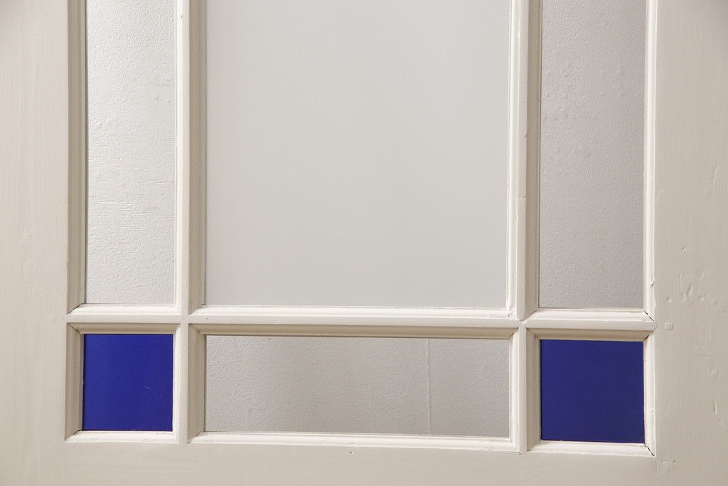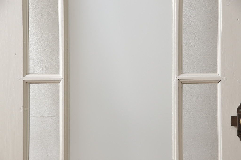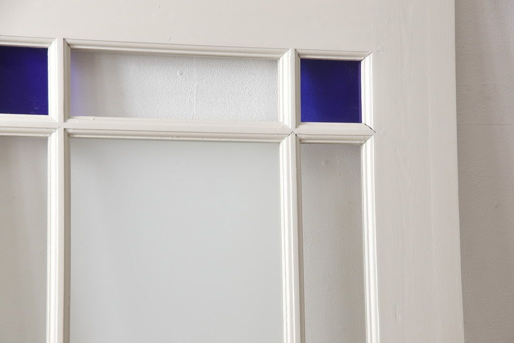 ドア・建具> ドア・扉 > 木製ドアをリペア&カスタム!リサイズし、中央ガラスをすりガラスに差し替え。既存のドアレバーを取り外して埋木処理し、アンティークの引手金具を取り付け。本体をアンティークホワイトでペイント仕上げ。(扉、建具)