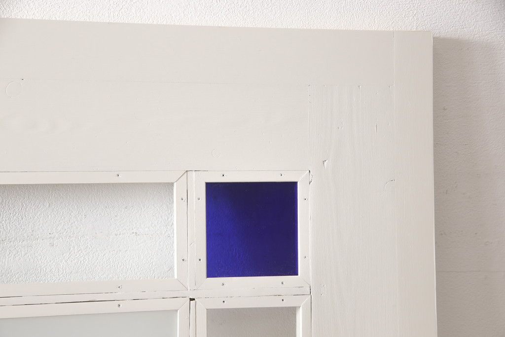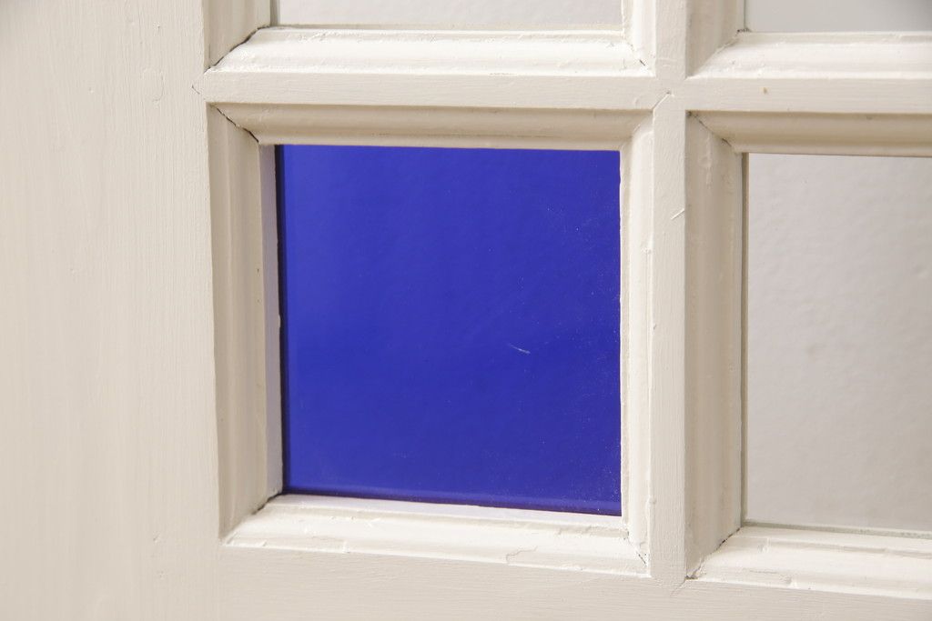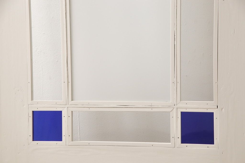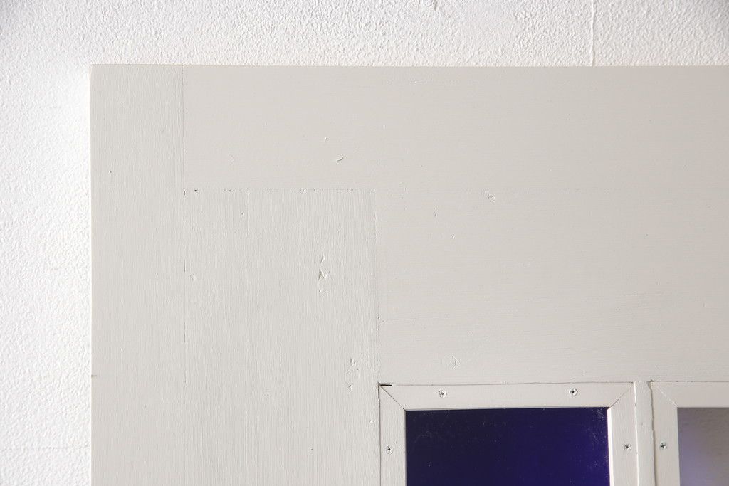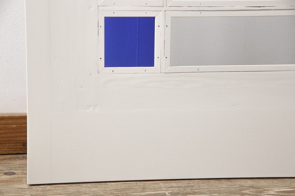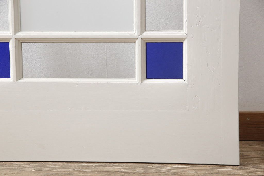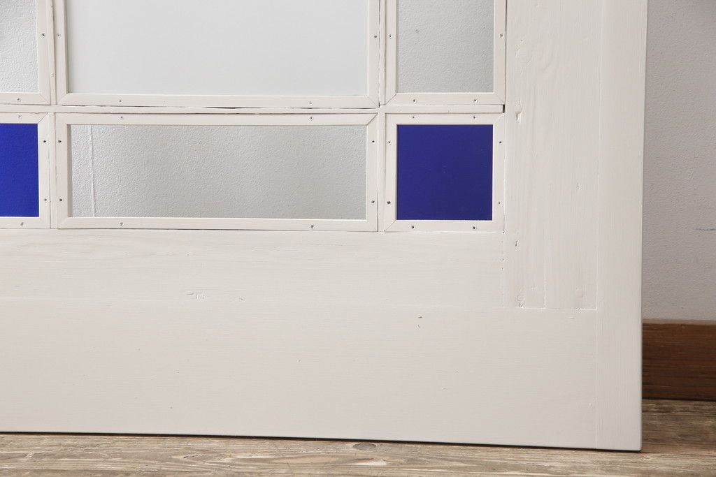 ドア・建具> ドア・扉 > 木製ドアをリペア&カスタム!リサイズし、中央ガラスをすりガラスに差し替え。既存のドアレバーを取り外して埋木処理し、アンティークの引手金具を取り付け。本体をアンティークホワイトでペイント仕上げ。(扉、建具)