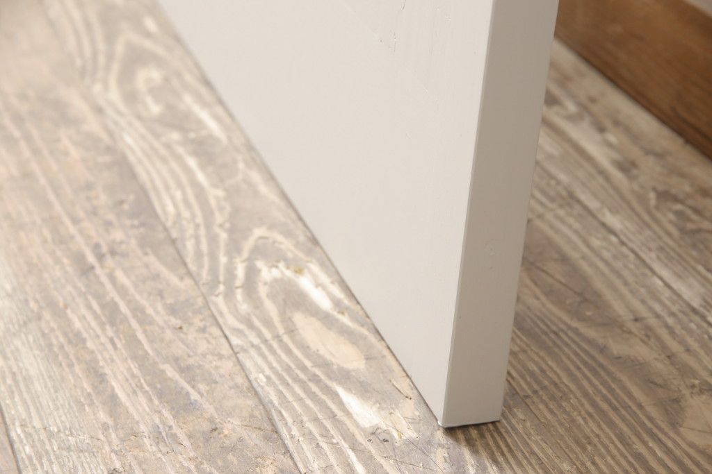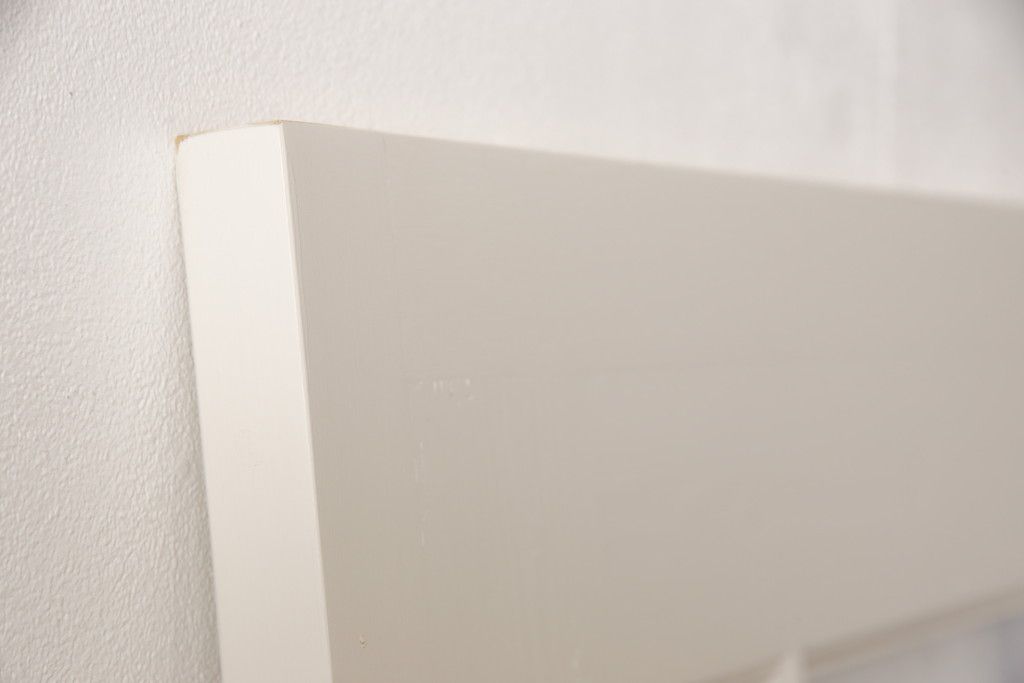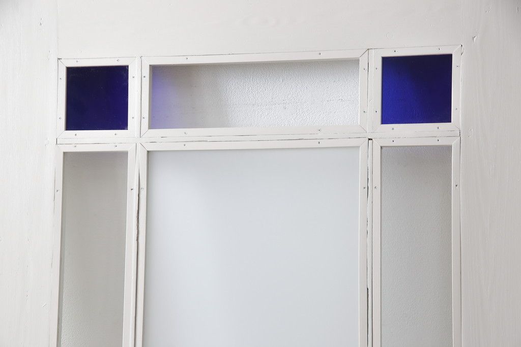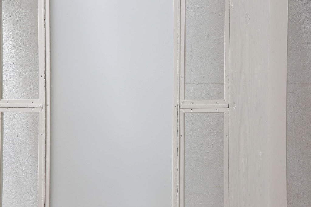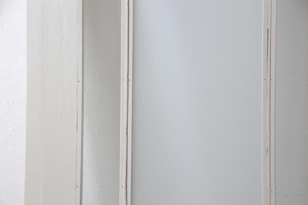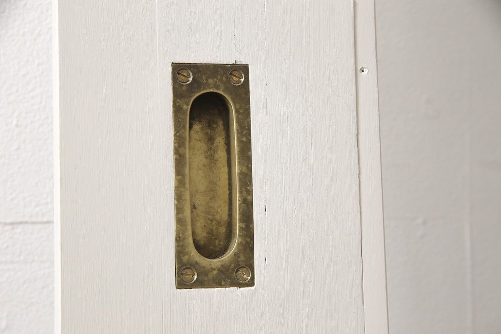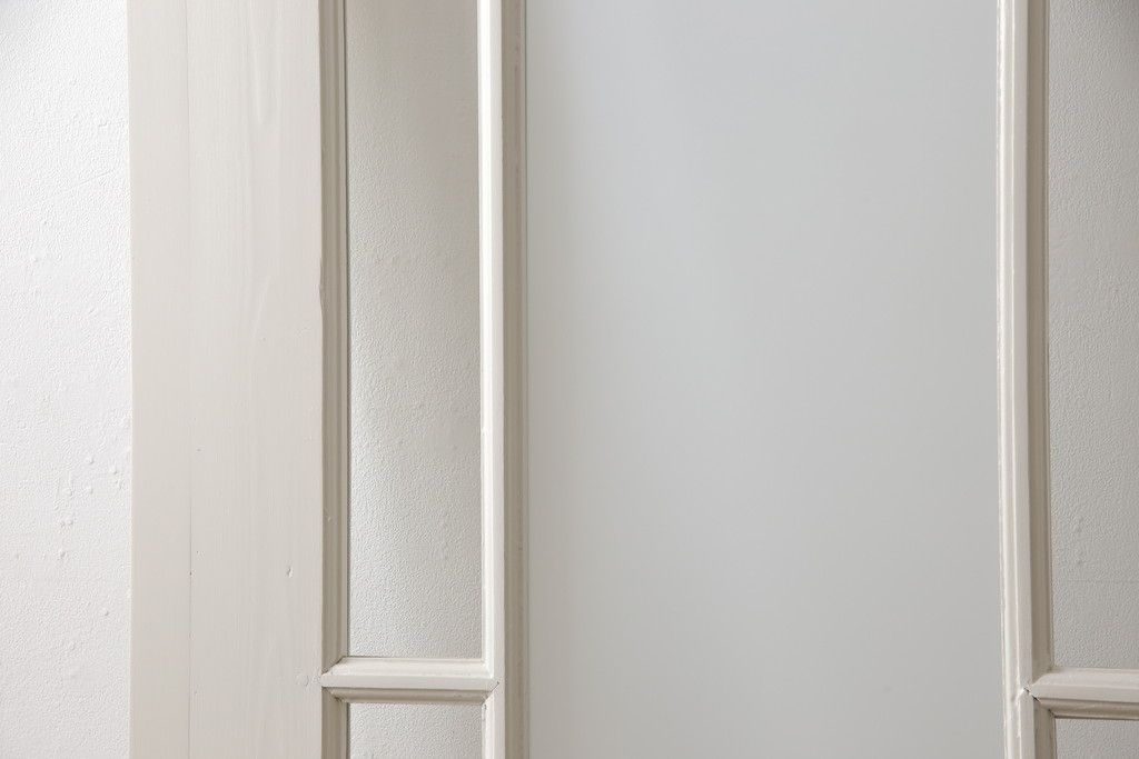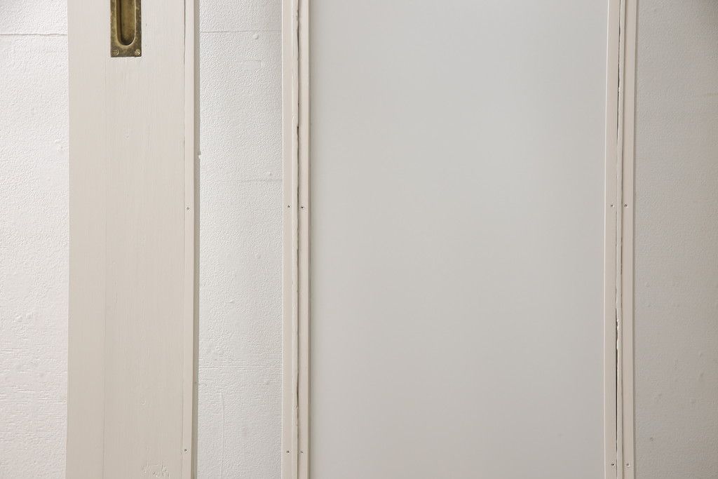 セミオーダー家具実績 > 木製ドアをリペア&カスタム!リサイズし、中央ガラスをすりガラスに差し替え。既存のドアレバーを取り外して埋木処理し、アンティークの引手金具を取り付け。本体をアンティークホワイトでペイント仕上げ。(扉、建具)