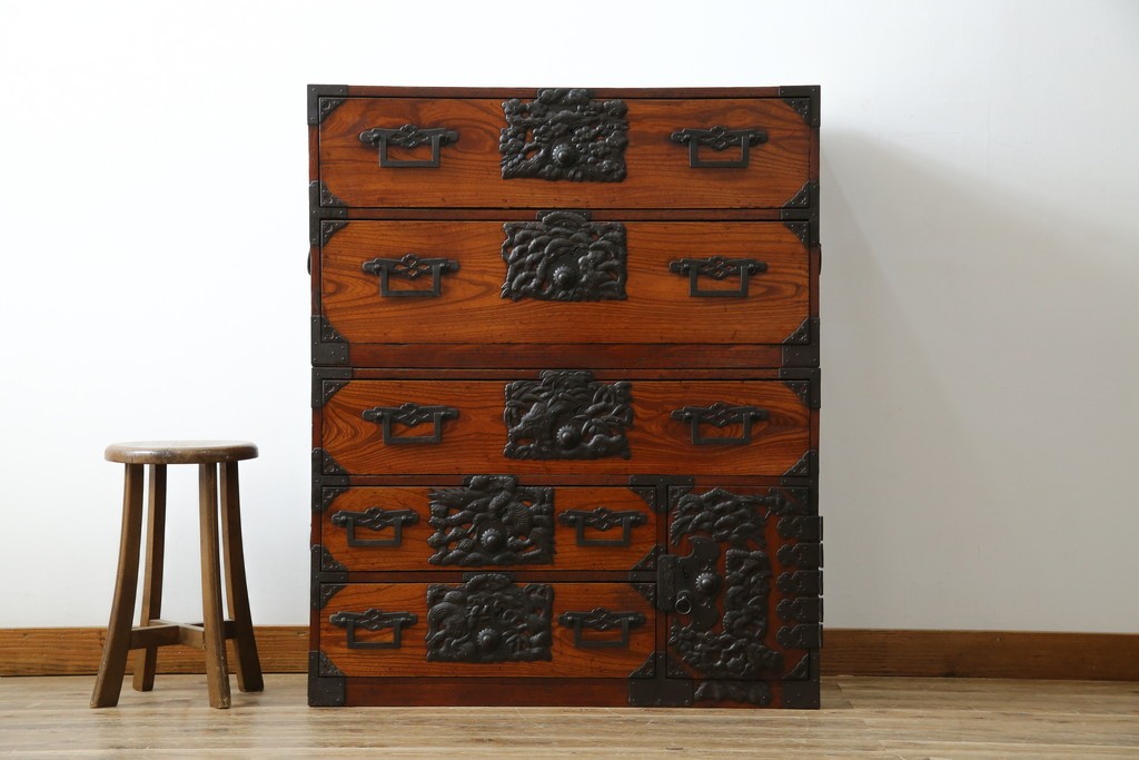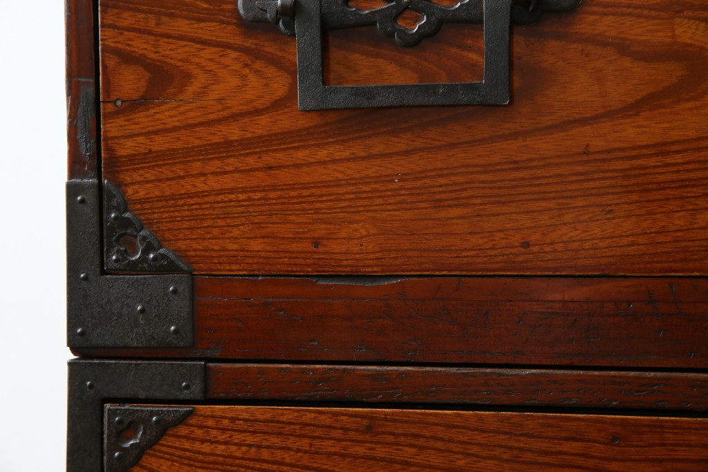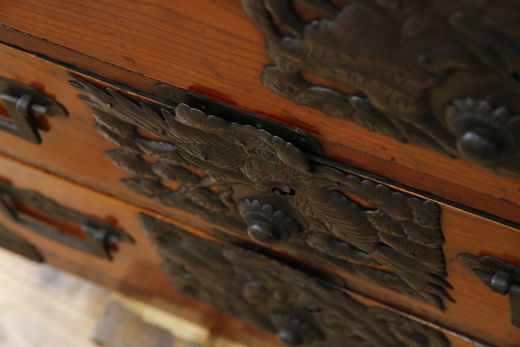 和箪笥> 				衣装箪笥				> 和製アンティーク 前面欅(ケヤキ)材 立派な打ち出し金具 五丁引き 重厚感ある佇まいが魅力的な庄内箪笥 (R-059246)