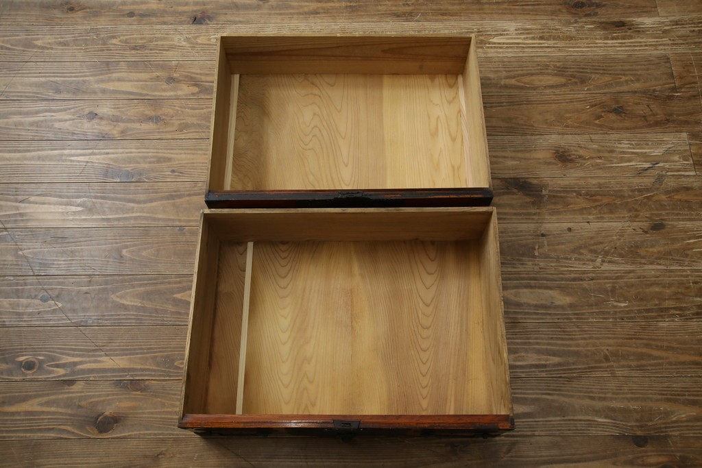 通常、重ね箪笥は「4丁引き」と呼ばれる錠前金具が付いた引き出しが4杯備わった型が一般的ですがこちらのお品は5杯備わった「5丁引き」の珍しいつくりです。