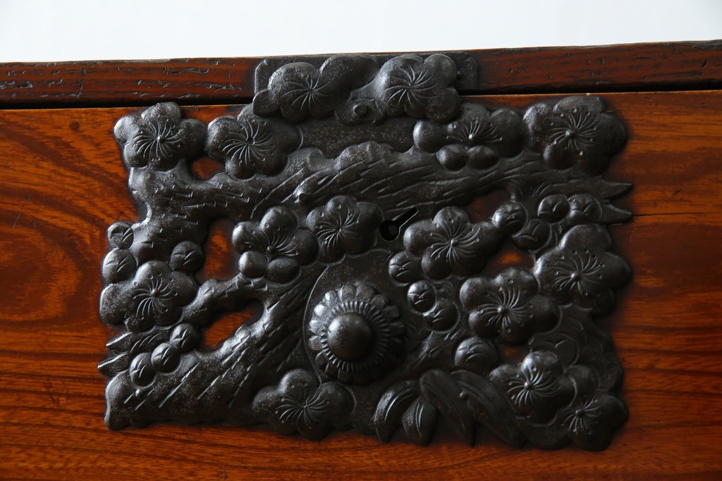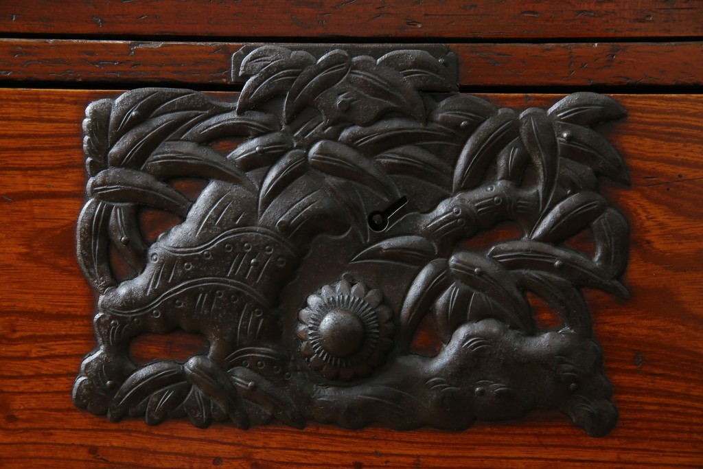 松竹梅や鶴亀の縁起物の意匠が施されている重厚な打ち出し金具が目を引きますね。