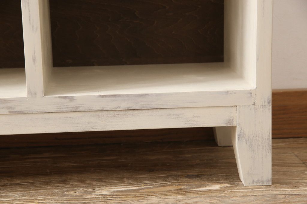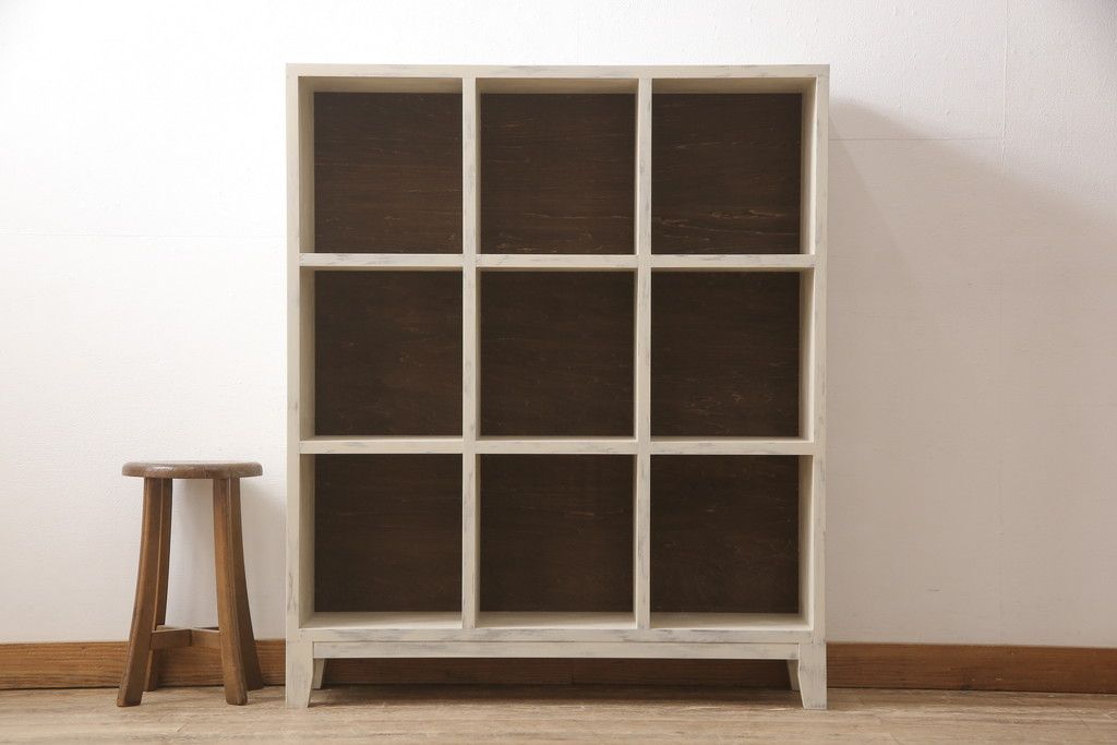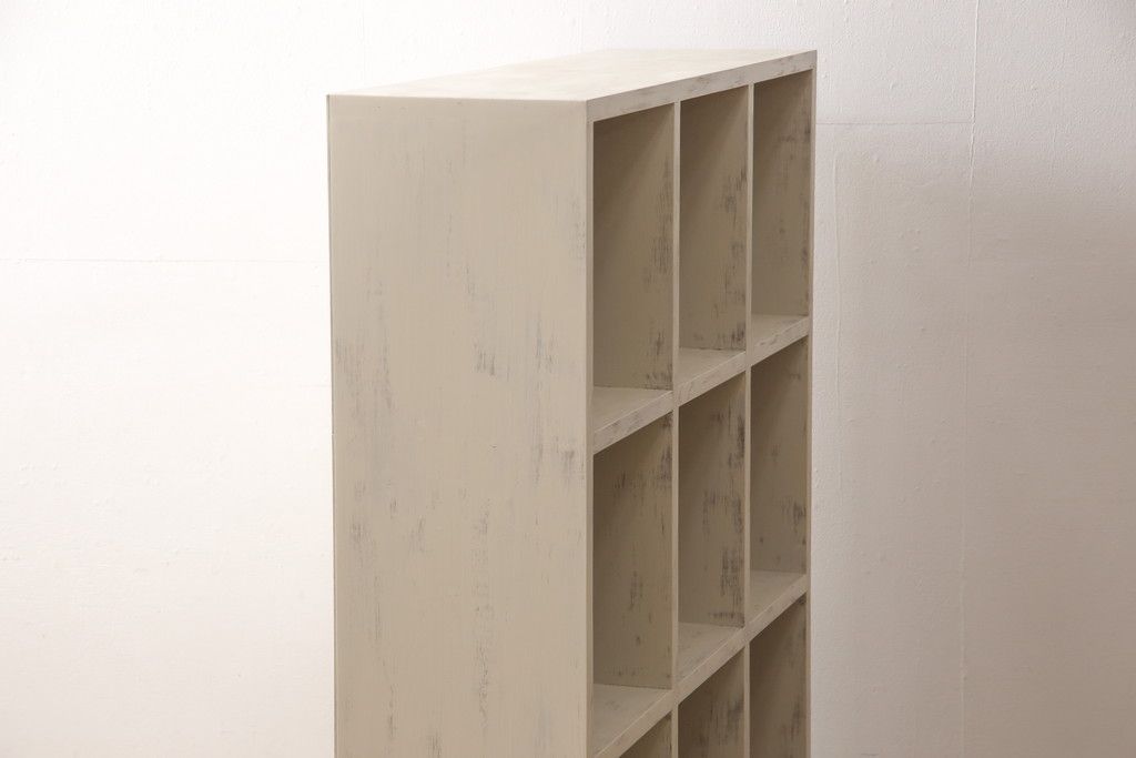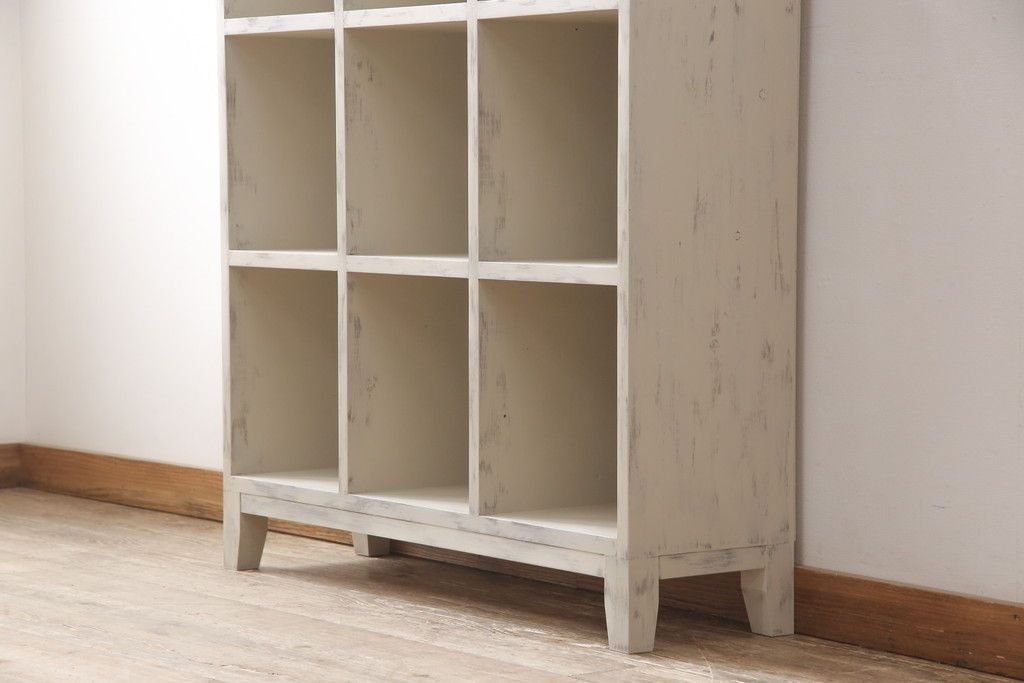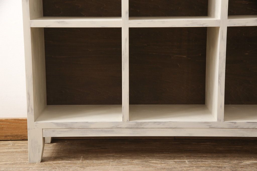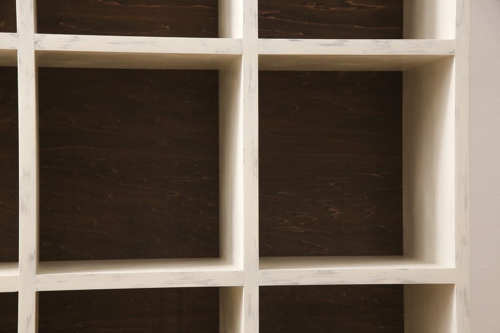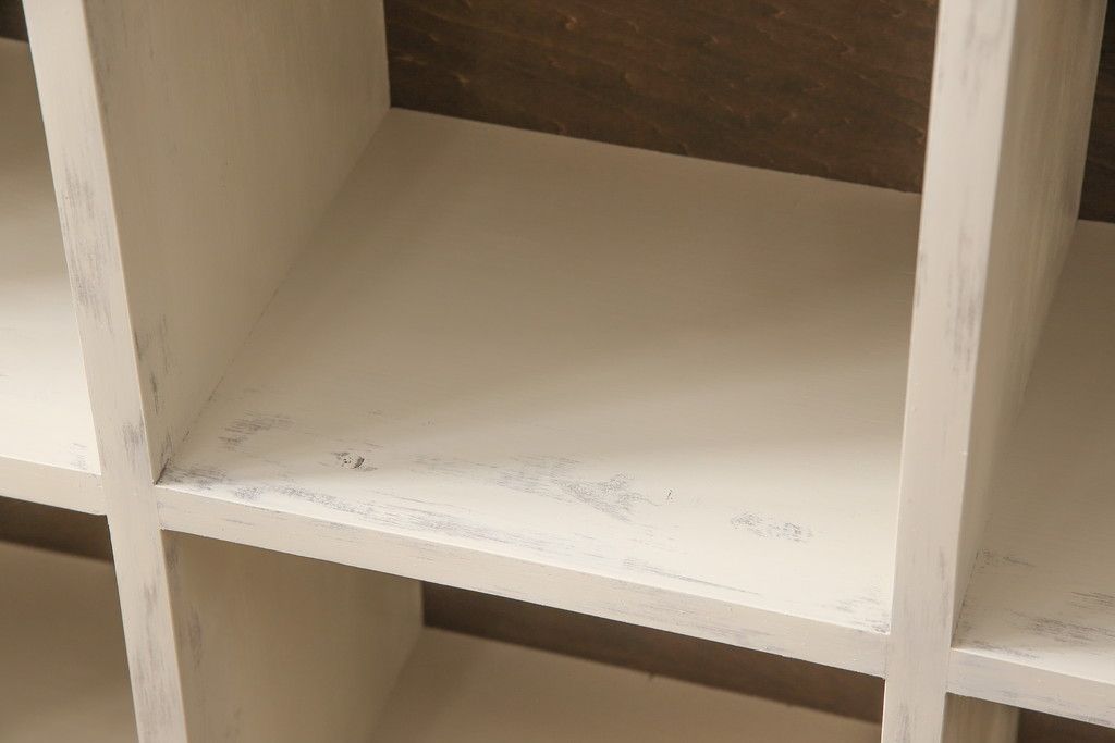マス目棚を新規製作!木製脚を取り付け、アンティークホワイトで着色。エイジング加工を施し仕上げ。(飾り棚、収納棚、本棚、オープンラック)