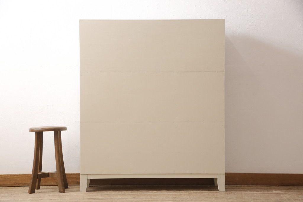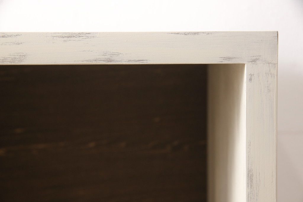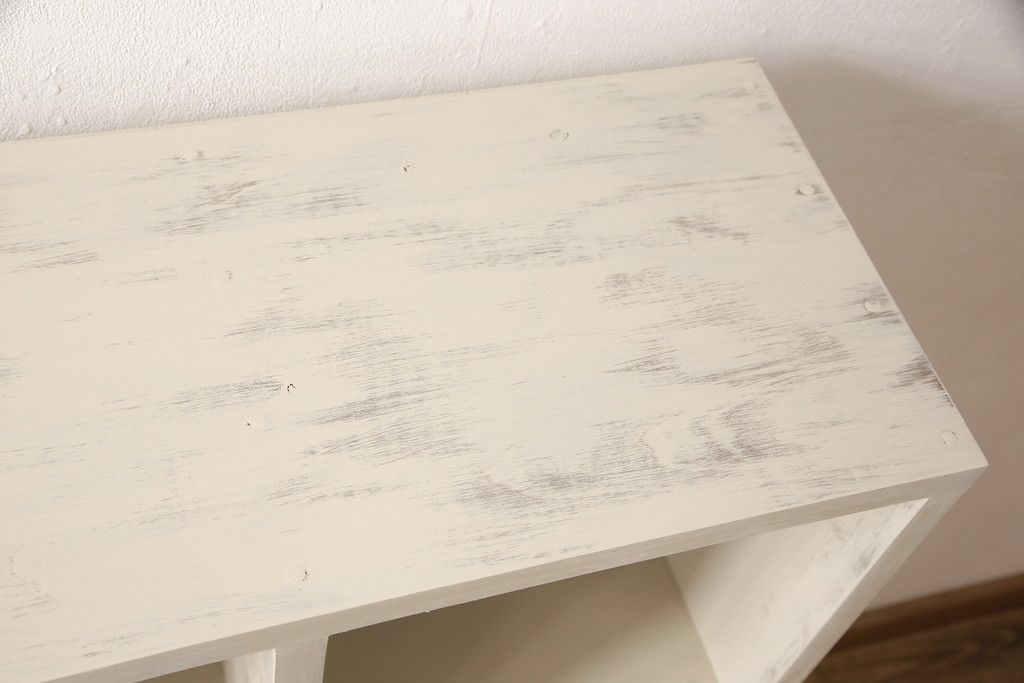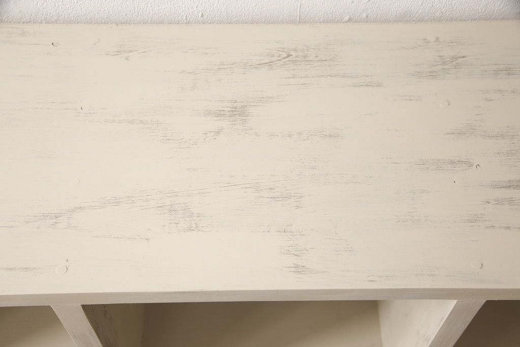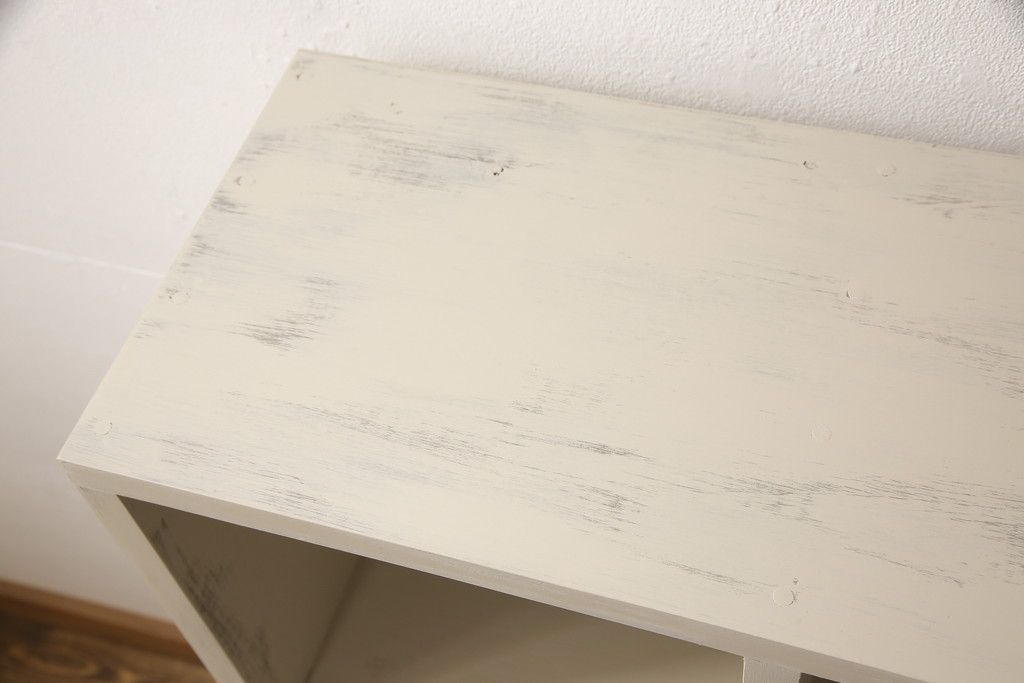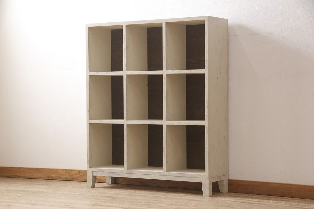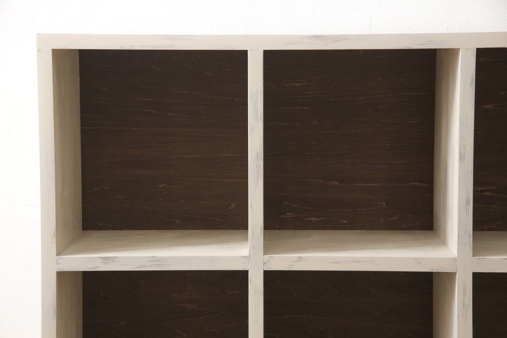 マス目棚を新規製作!木製脚を取り付け、アンティークホワイトで着色。エイジング加工を施し仕上げ。(飾り棚、収納棚、本棚、オープンラック)