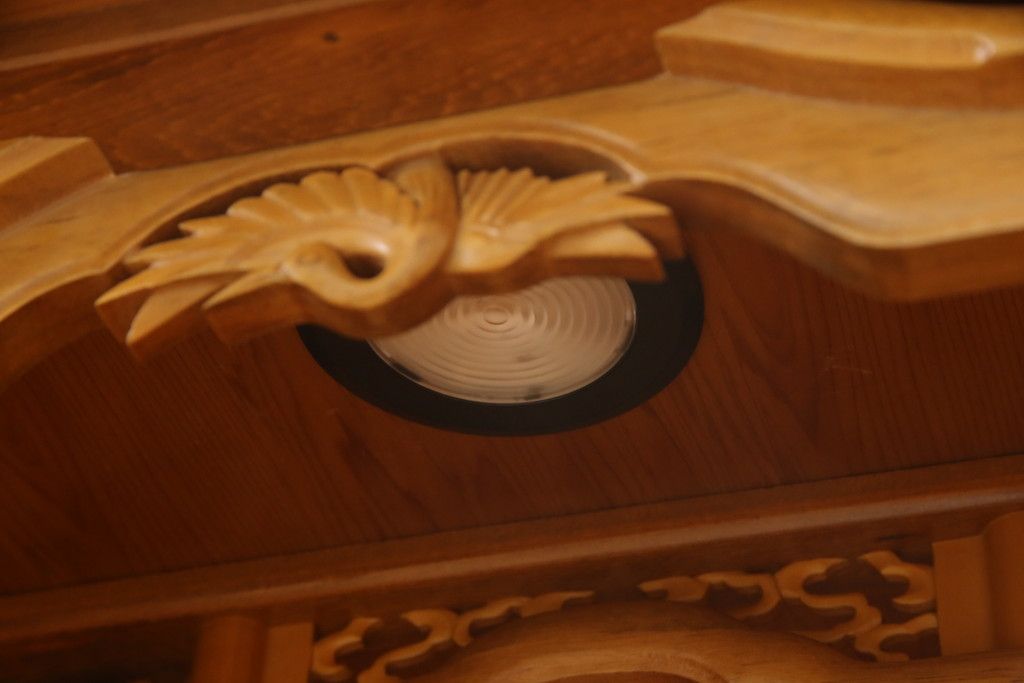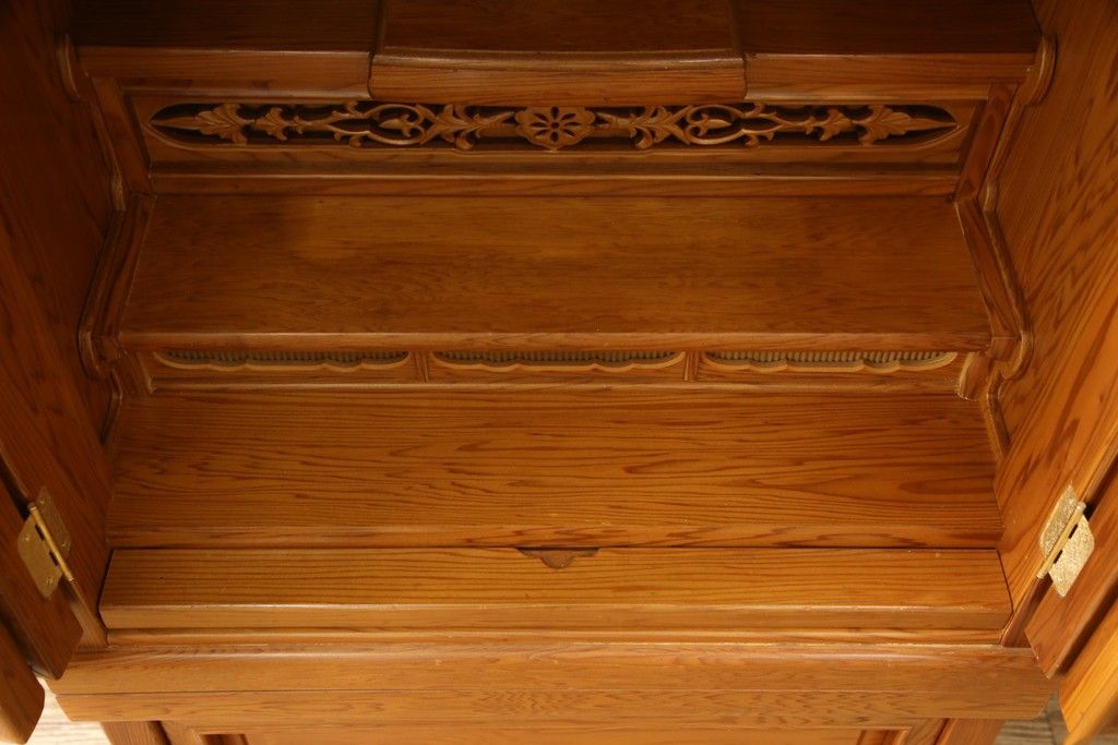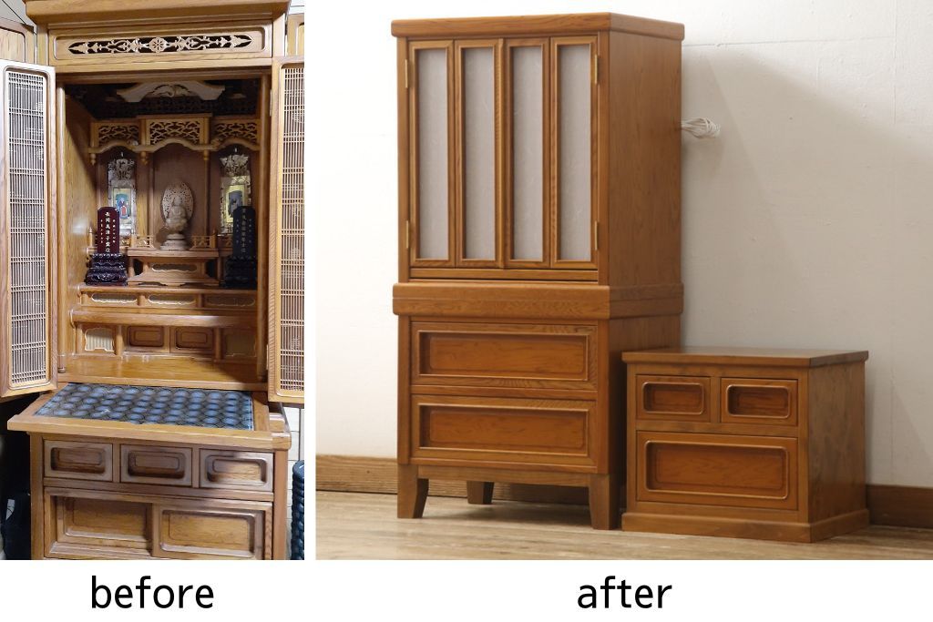 お仏壇を小型仏壇と小引き出しにリメイク!指定サイズにリサイズし、小型仏壇の上段にはアクリルワーロンの4枚戸を設置。下段には引き出し2杯と脚を取り付け。元の扉1枚と引き出しを活用し、小引き出しに。