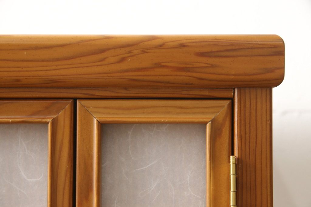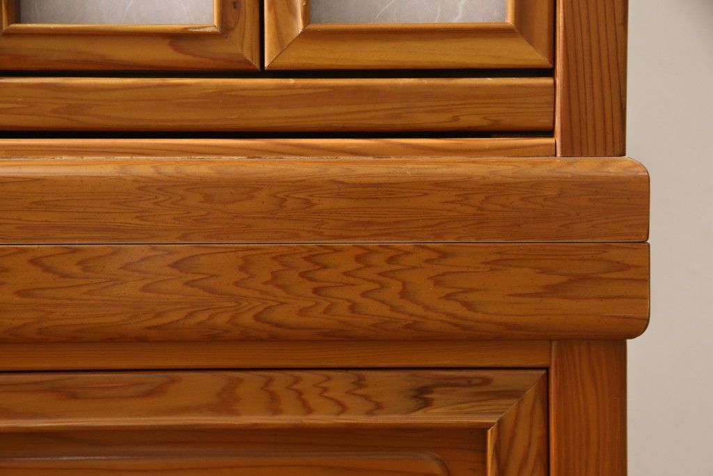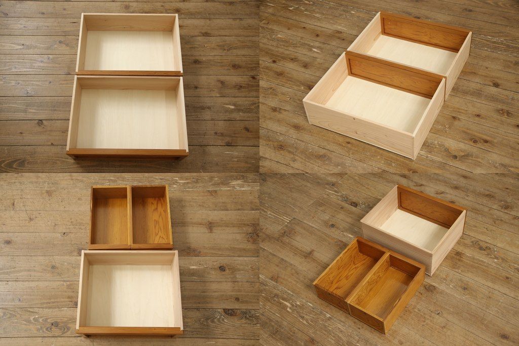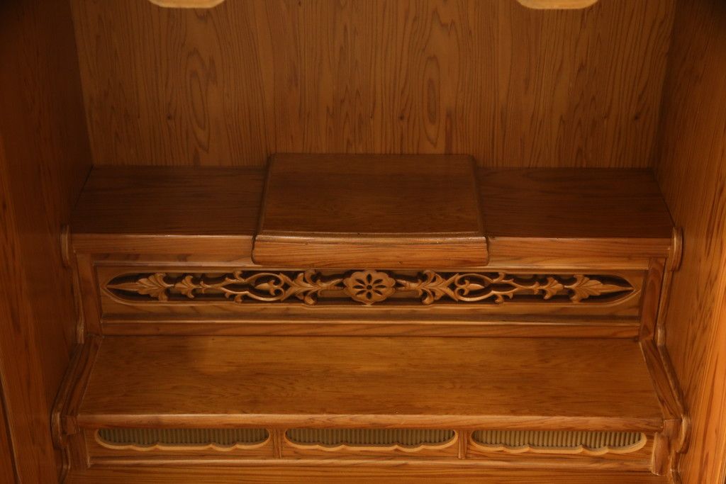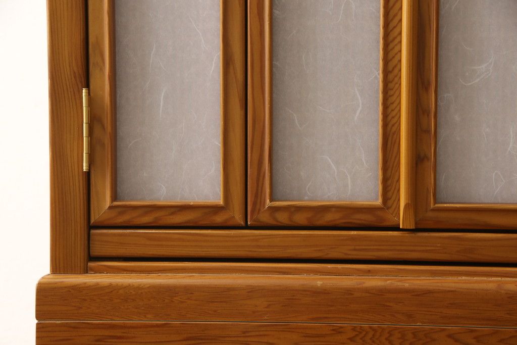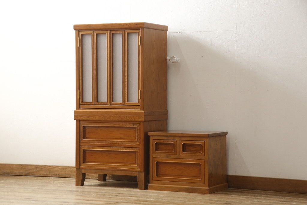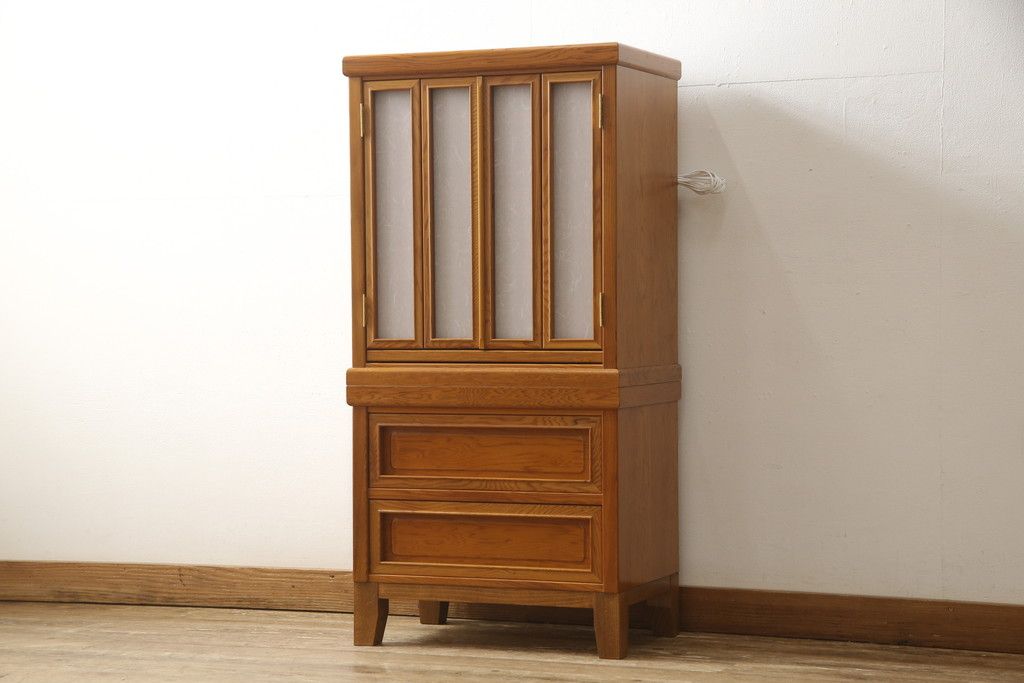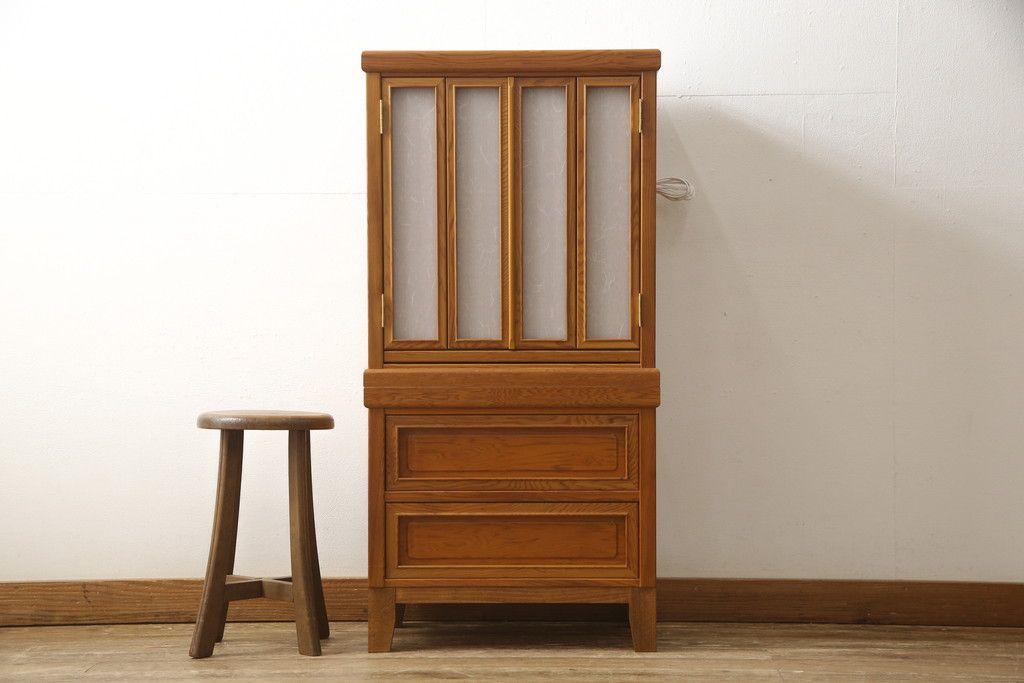 ラフジュ工房> お手持ちの家具・建具リメイク実績> 仏壇リメイク実績 > お仏壇を小型仏壇と小引き出しにリメイク!指定サイズにリサイズし、小型仏壇の上段にはアクリルワーロンの4枚戸を設置。下段には引き出し2杯と脚を取り付け。元の扉1枚と引き出しを活用し、小引き出しに。