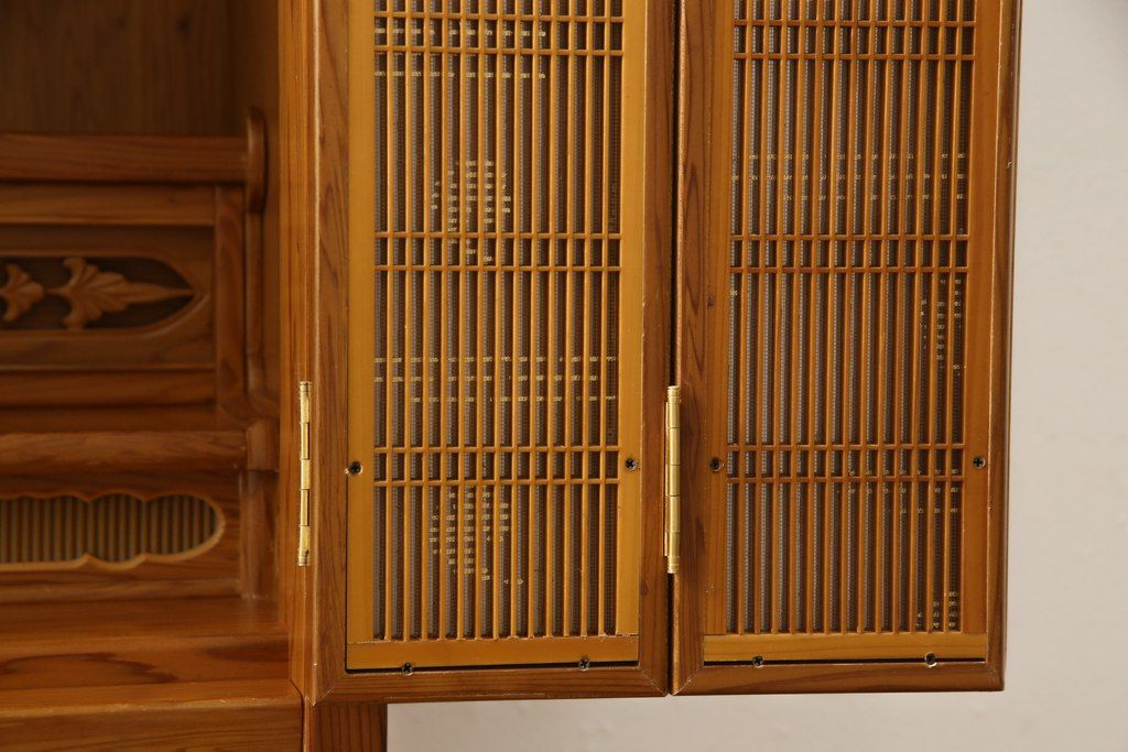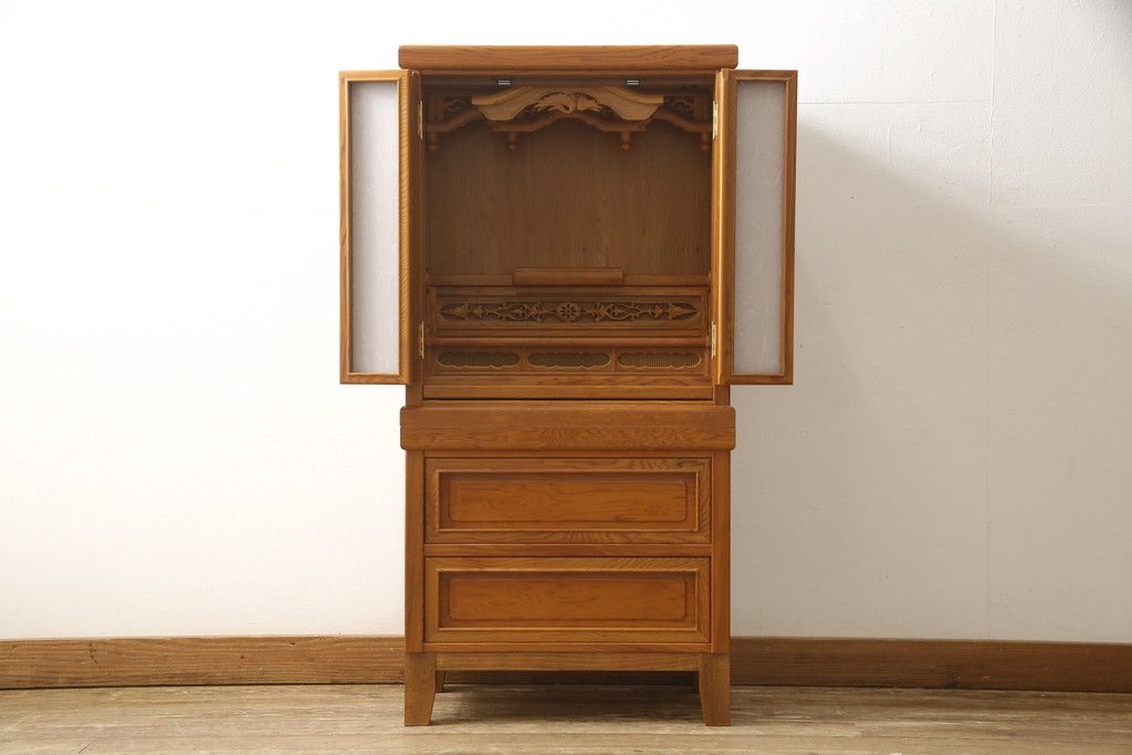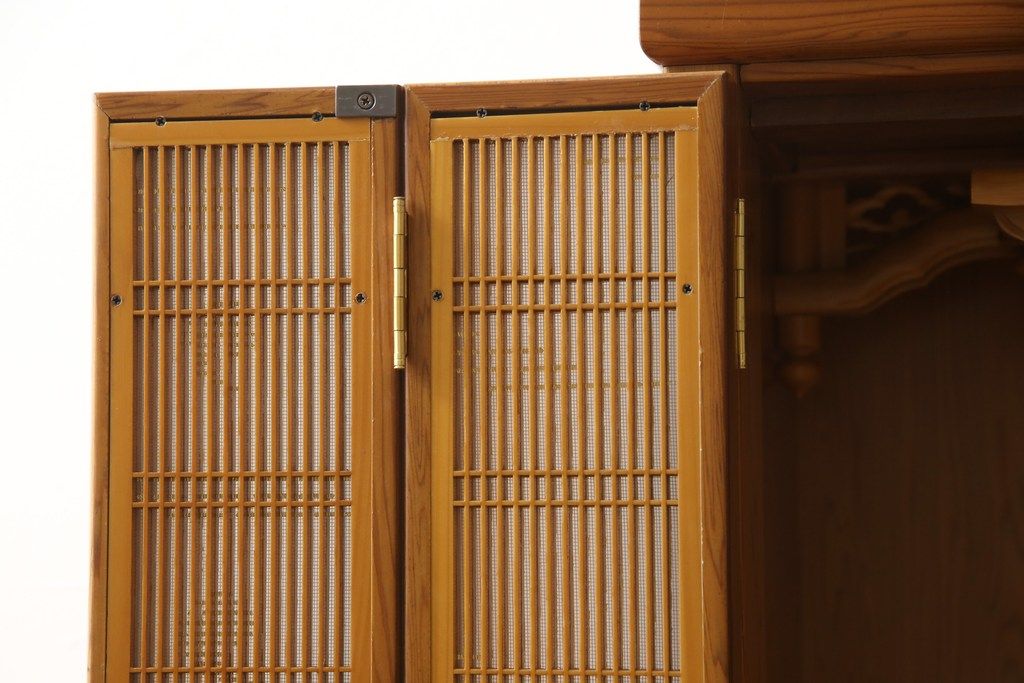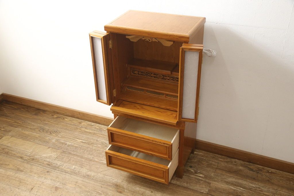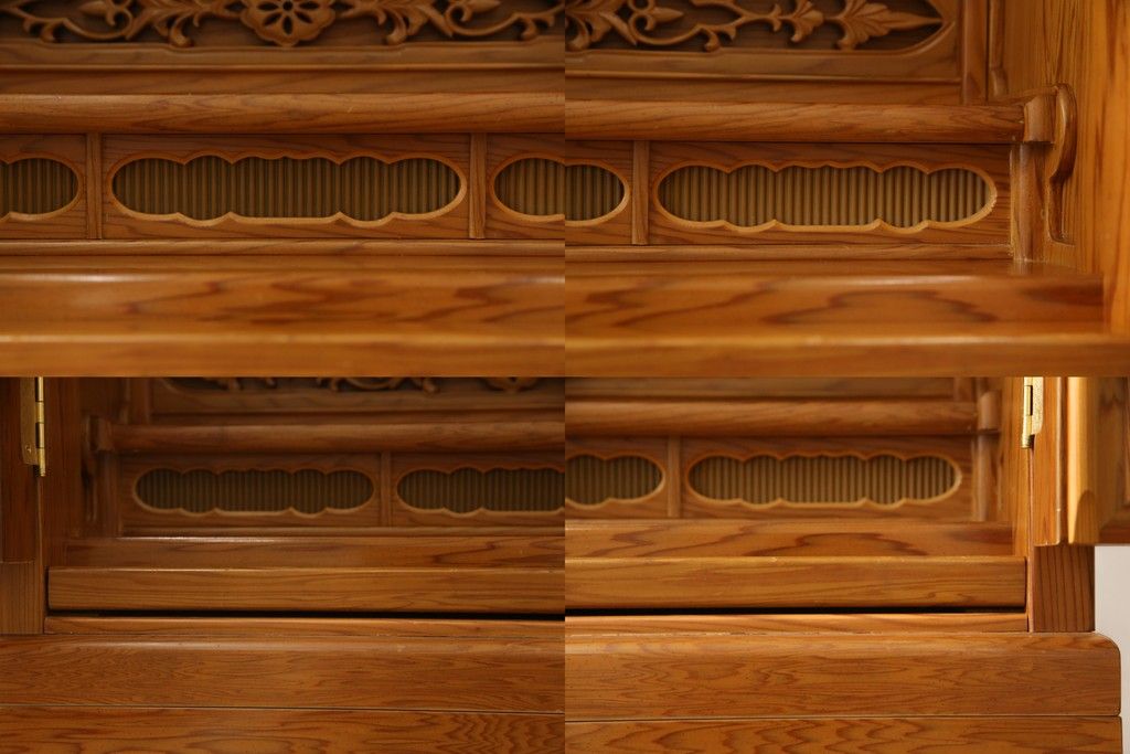 ラフジュ工房> 仏壇 > お仏壇を小型仏壇と小引き出しにリメイク!指定サイズにリサイズし、小型仏壇の上段にはアクリルワーロンの4枚戸を設置。下段には引き出し2杯と脚を取り付け。元の扉1枚と引き出しを活用し、小引き出しに。