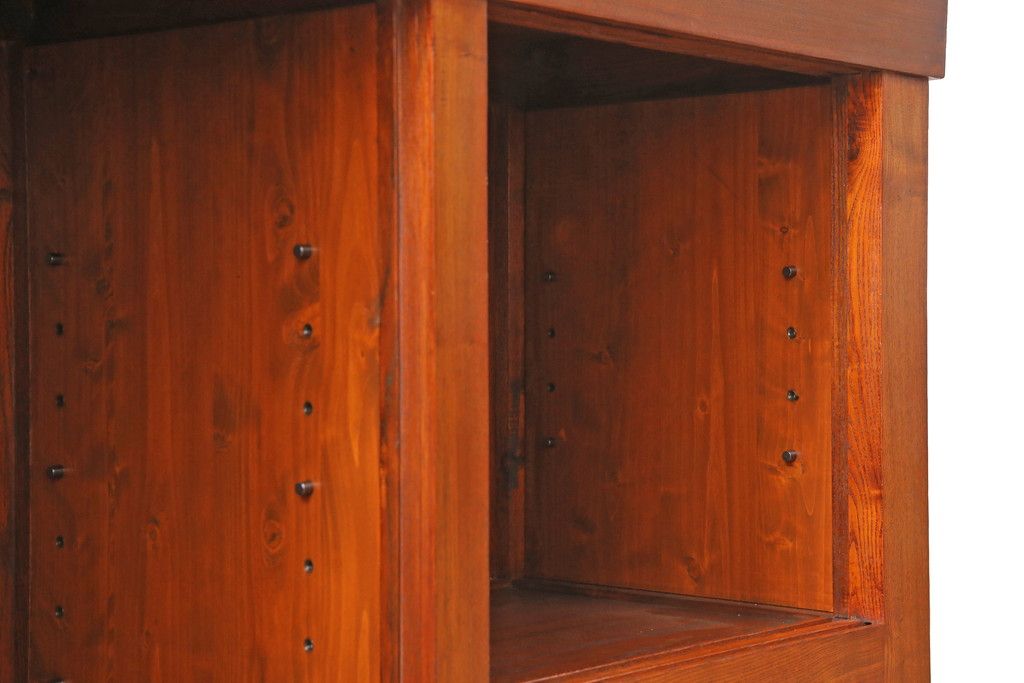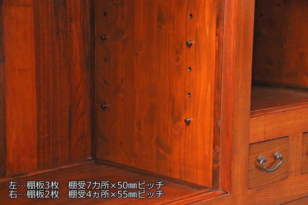 棚板は取り外しできます。左の棚板は3枚あります。棚受けは7ヶ所、50mmピッチで調整できます。右の棚板は2枚あります。棚受けは4ヶ所、55mmピッチで調整できます。棚幅サイズのものが1枚の作りです。