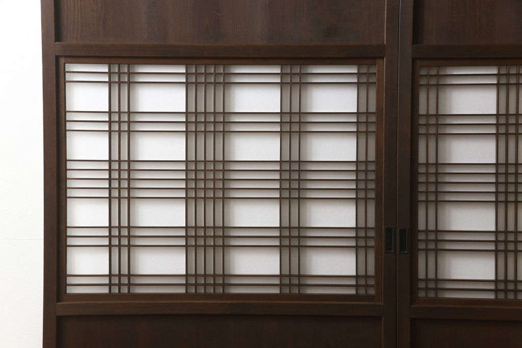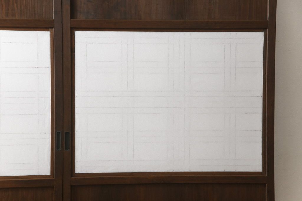 ドア・建具> 障子戸 > 障子帯戸2枚セットをリペア&カスタム!リサイズし、戸車・引手金具を取り付け。障子はプラスチック障子に張り替え。現状に近い色味に着色仕上げ。(引き戸)