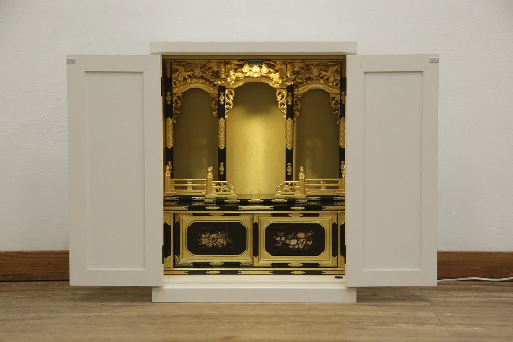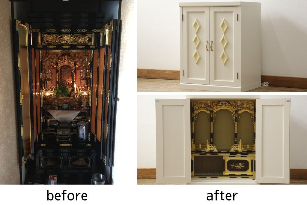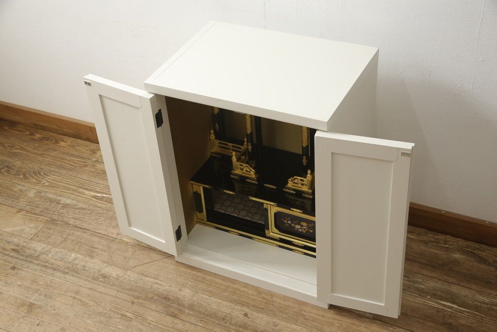 仏壇 > お仏壇をコンパクトにリメイク!指定サイズにリサイズし、本体扉は洋風の開き戸仕様に。内部の装飾はそのまま活用。扉のひし形飾りはアイボリー、それ以外は白でペイント。