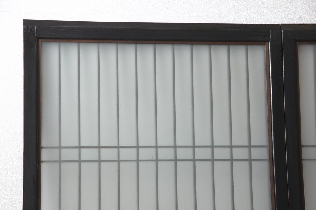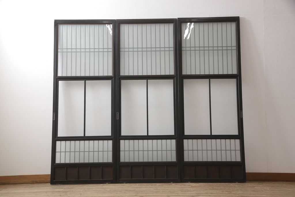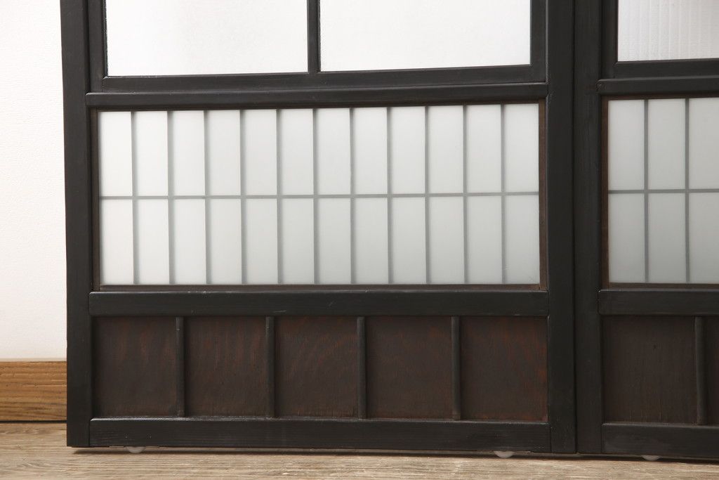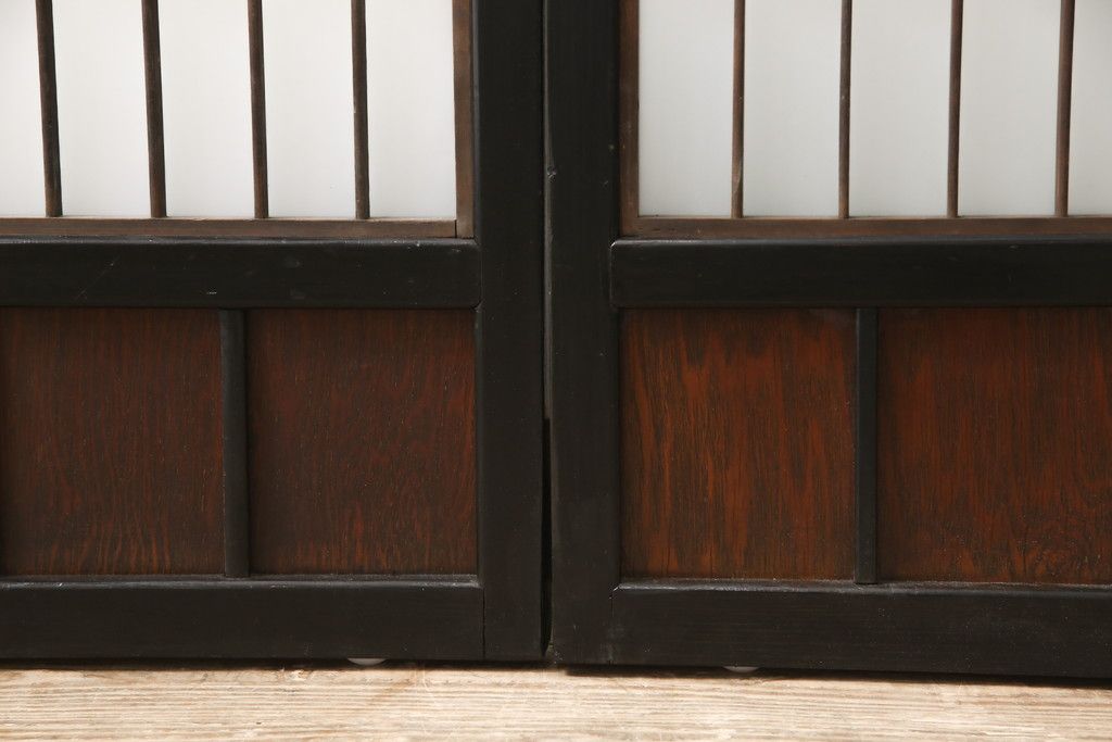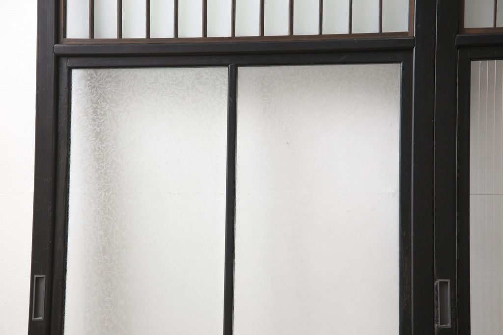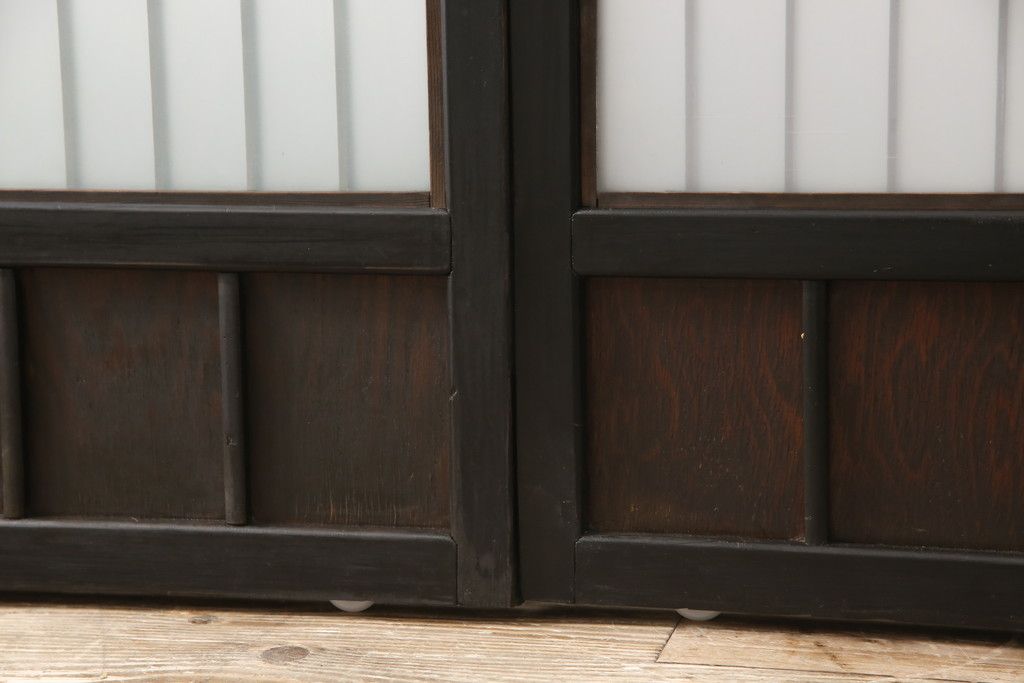 ドア・建具> 引き戸 > 昭和初期のガラス戸をリペア&カスタム!寸法を変えずに戸首を調整。1枚は結霜ガラスからモールガラスに変更。葵戸引手を取り付け、V型戸車を取り付け。現状に近い色味に着色仕上げ。(引き戸、建具)