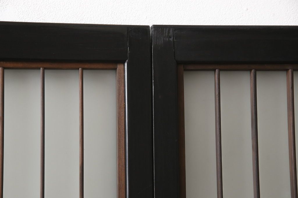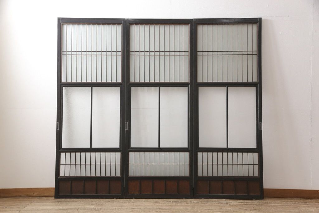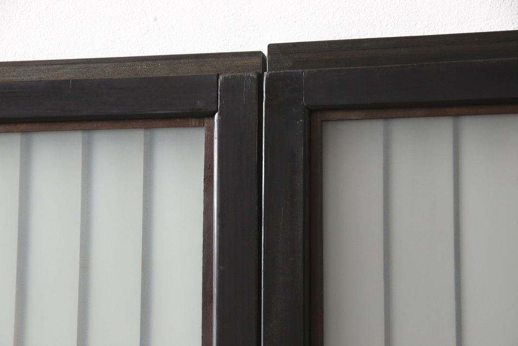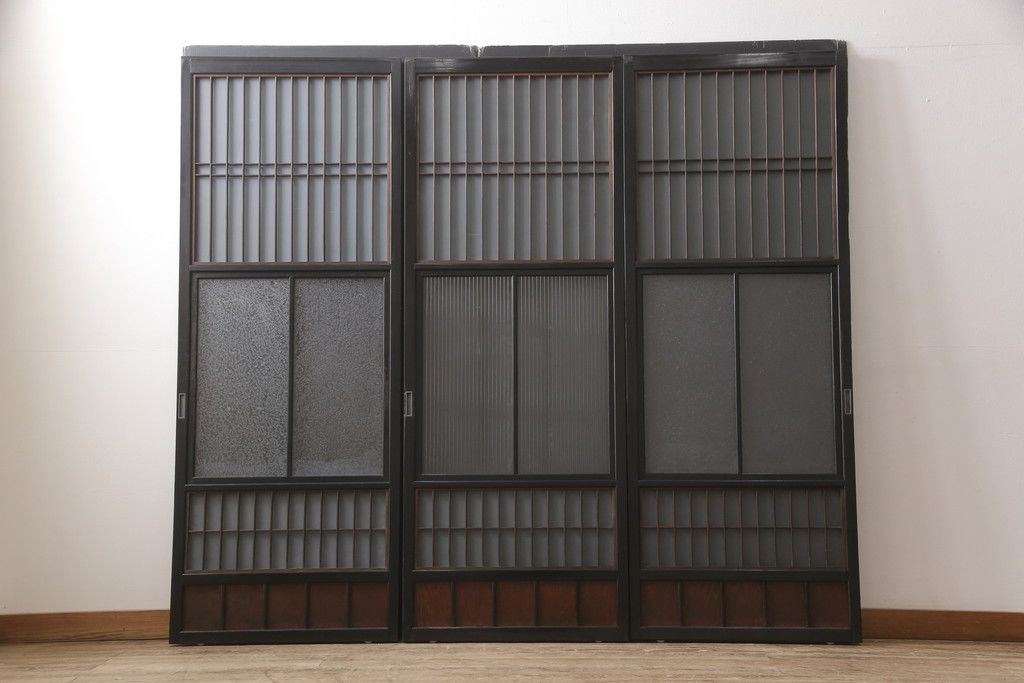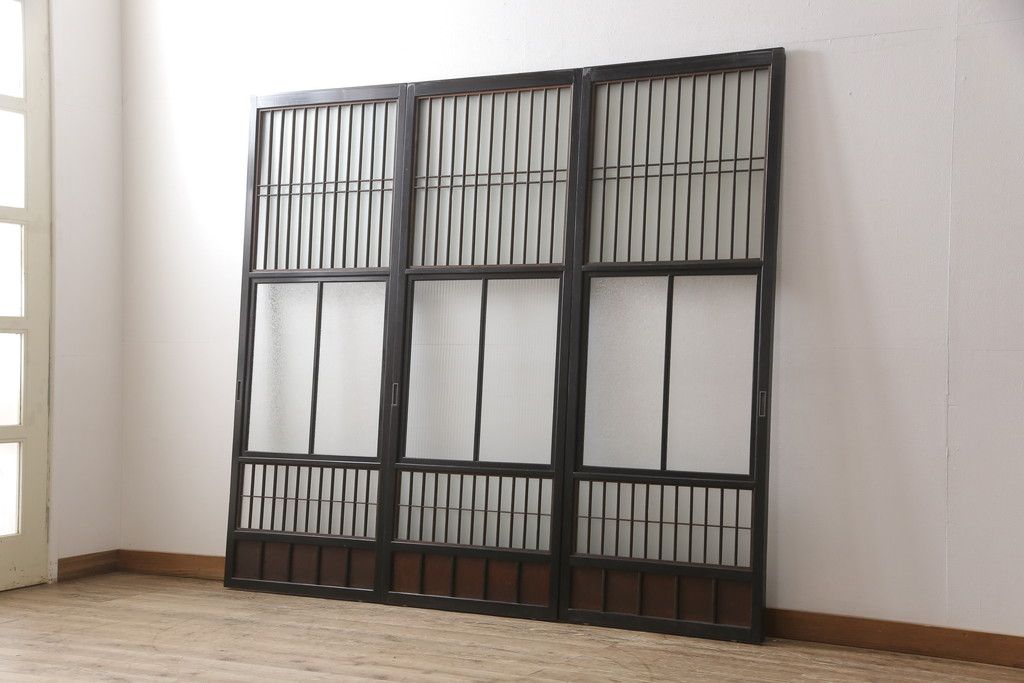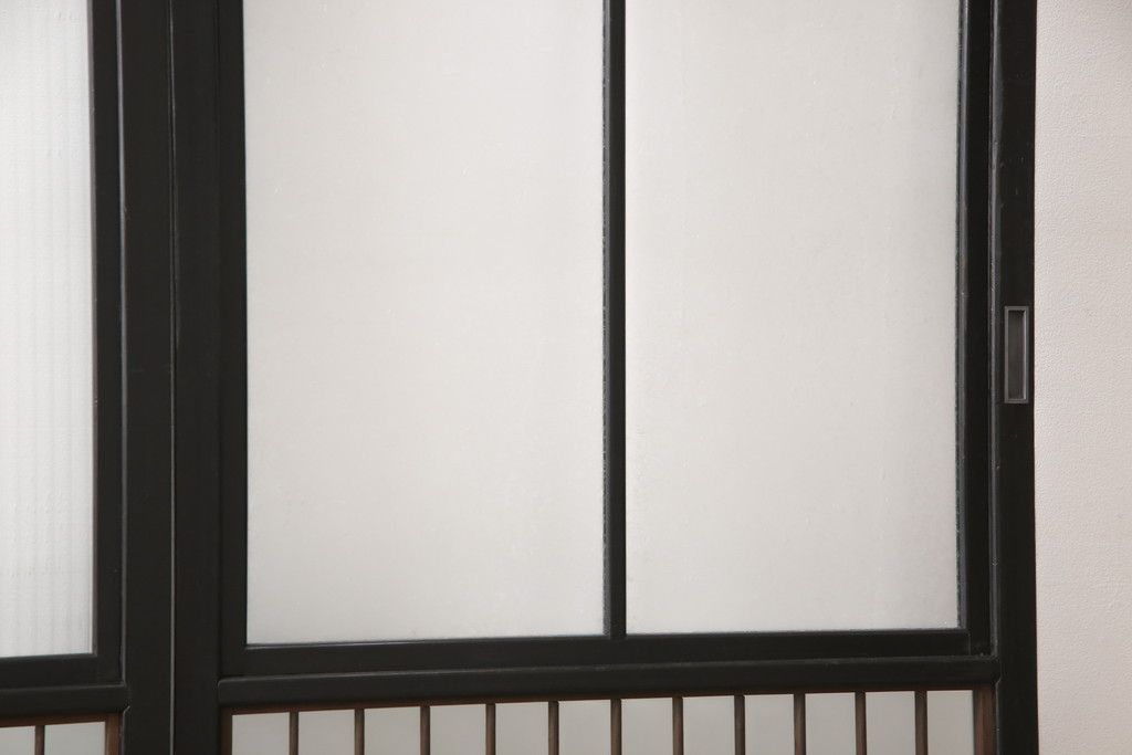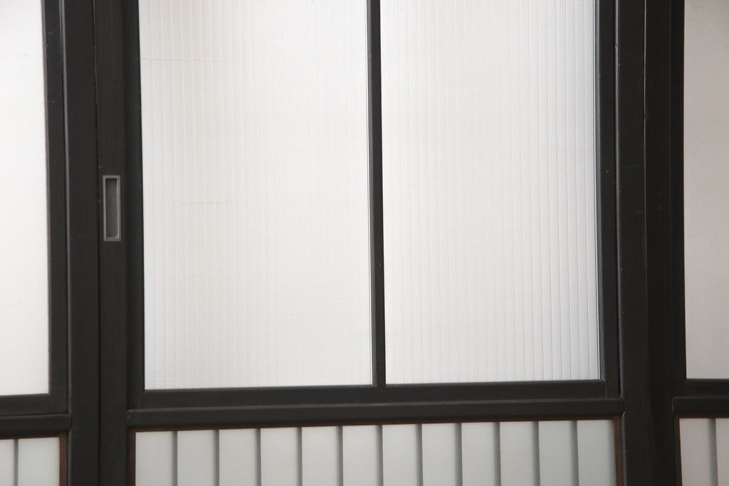 ドア・建具> 引き戸 > 昭和初期のガラス戸をリペア&カスタム!寸法を変えずに戸首を調整。1枚は結霜ガラスからモールガラスに変更。葵戸引手を取り付け、V型戸車を取り付け。現状に近い色味に着色仕上げ。(引き戸、建具)