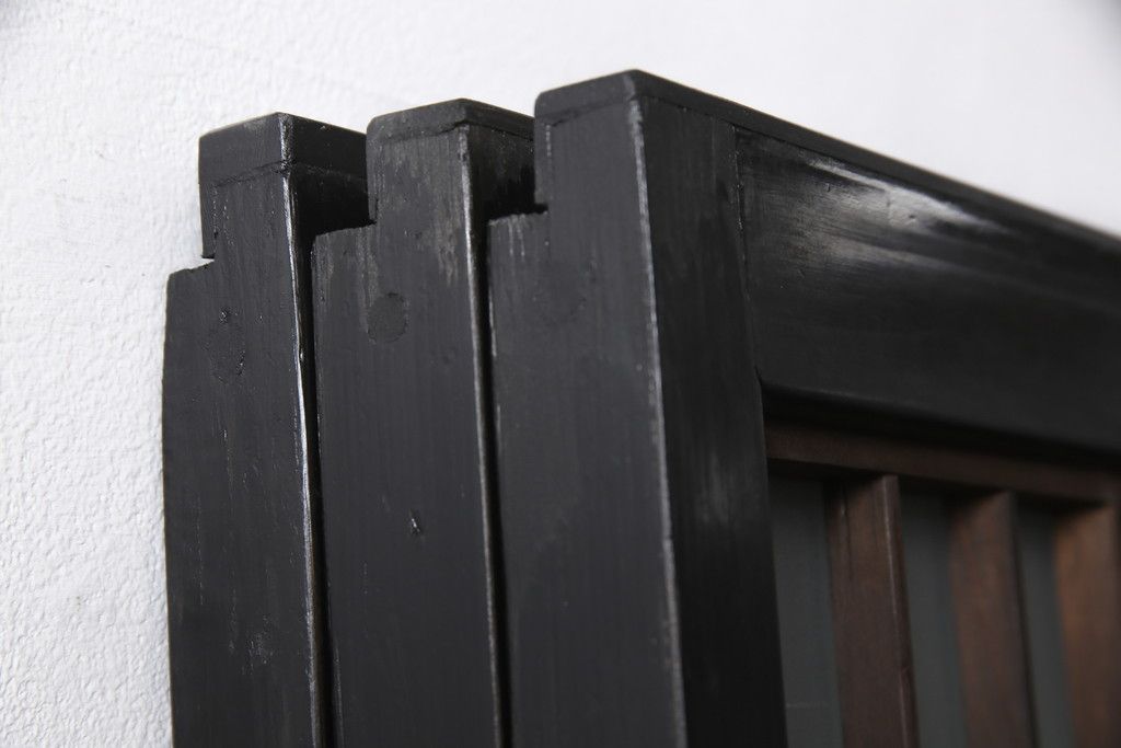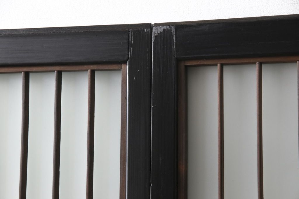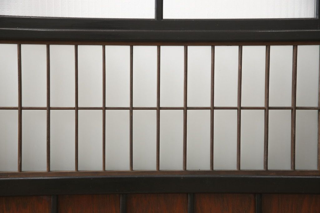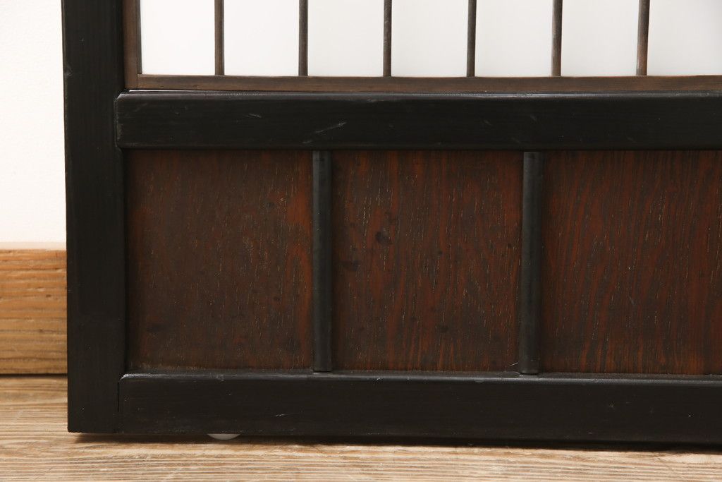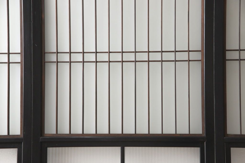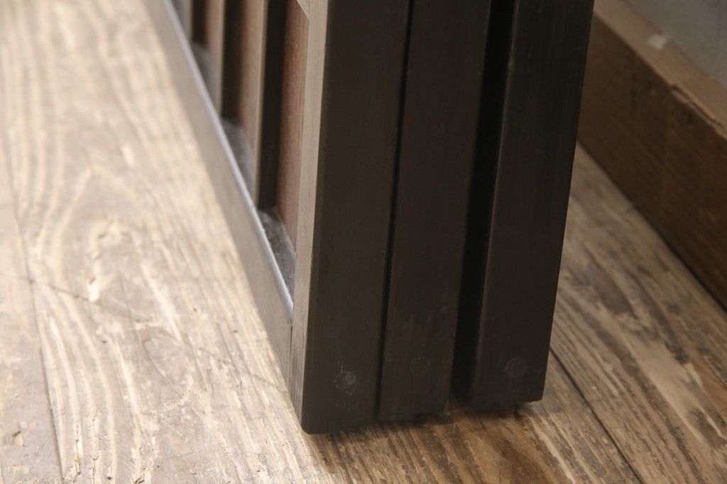 ドア・建具> 引き戸 > 昭和初期のガラス戸をリペア&カスタム!寸法を変えずに戸首を調整。1枚は結霜ガラスからモールガラスに変更。葵戸引手を取り付け、V型戸車を取り付け。現状に近い色味に着色仕上げ。(引き戸、建具)