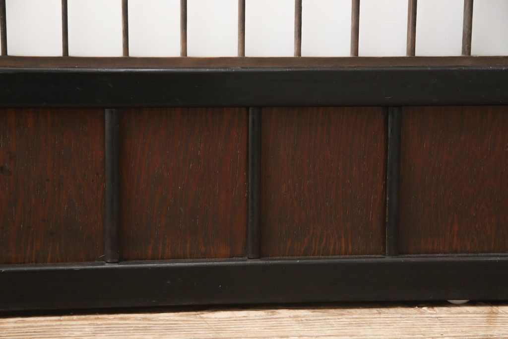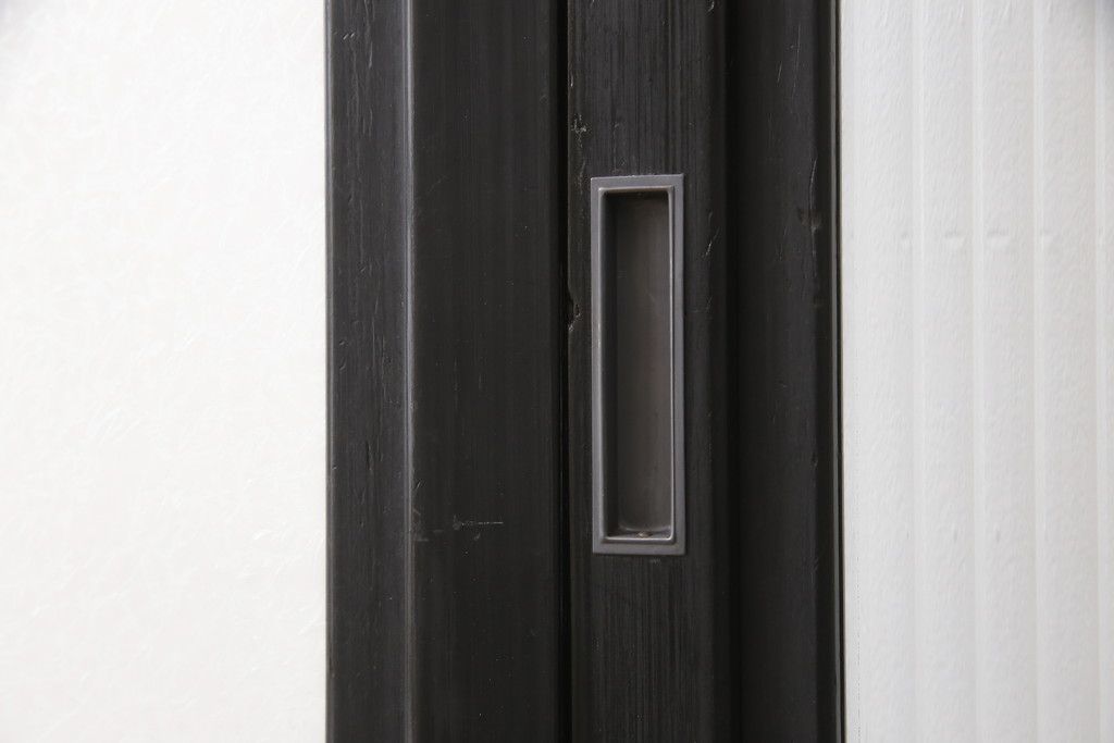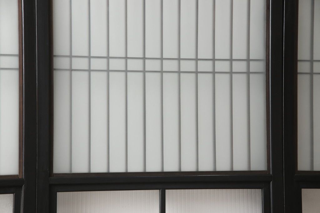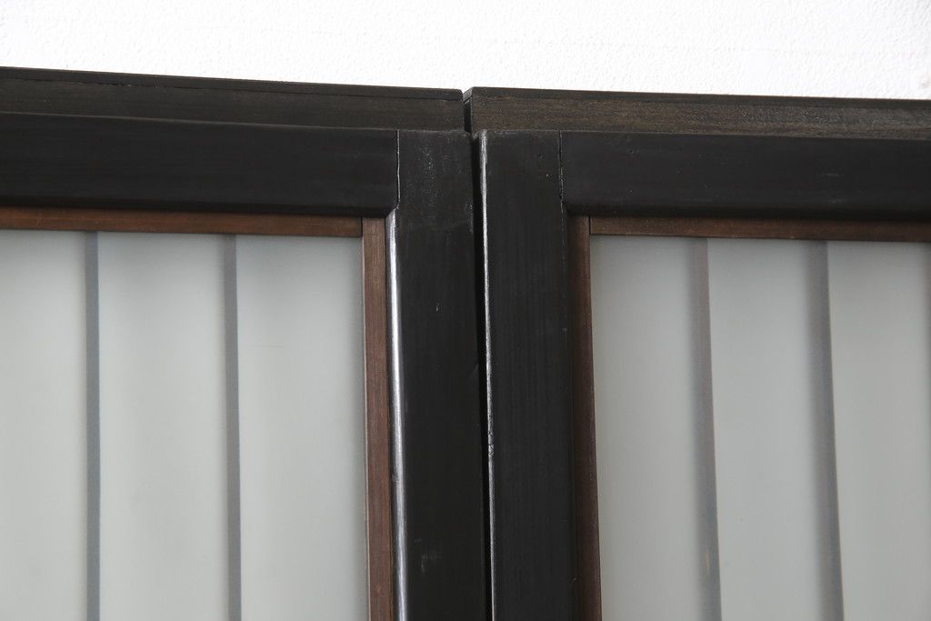 セミオーダー家具実績 > 昭和初期のガラス戸をリペア&カスタム!寸法を変えずに戸首を調整。1枚は結霜ガラスからモールガラスに変更。葵戸引手を取り付け、V型戸車を取り付け。現状に近い色味に着色仕上げ。(引き戸、建具)