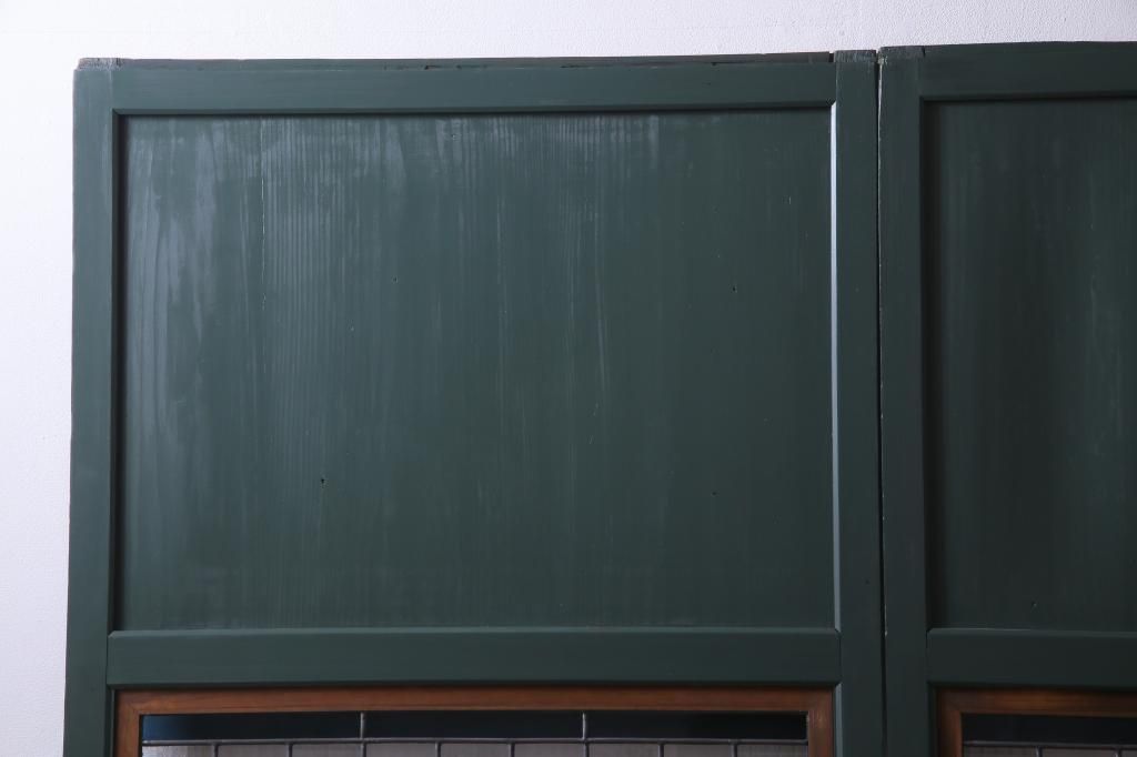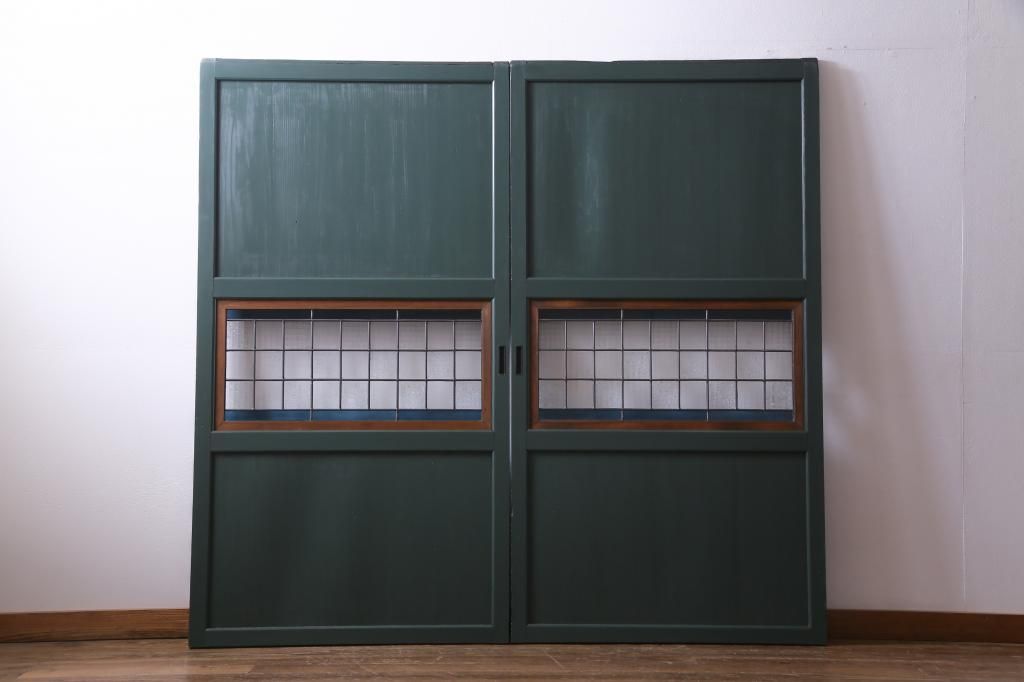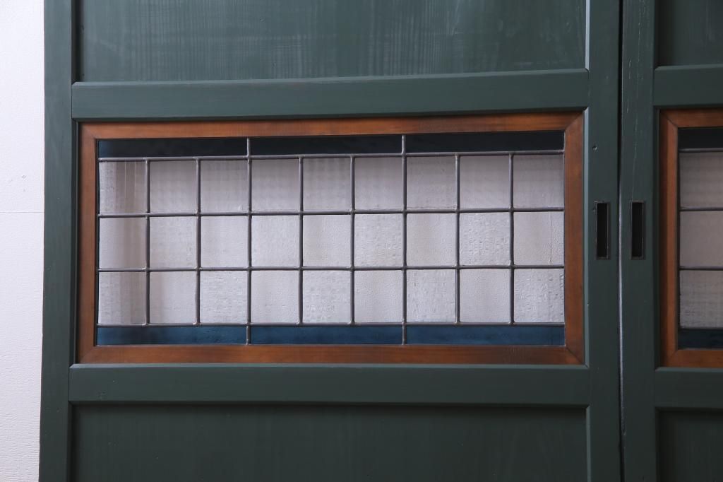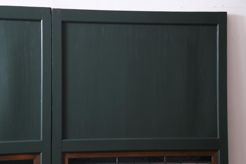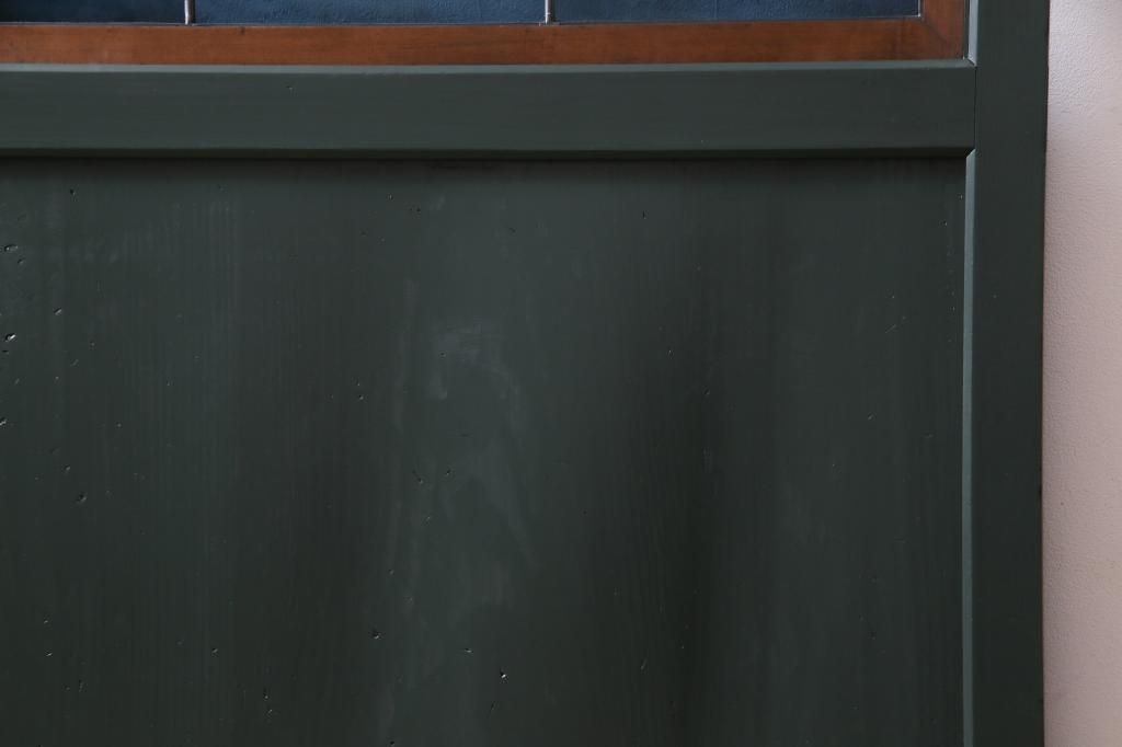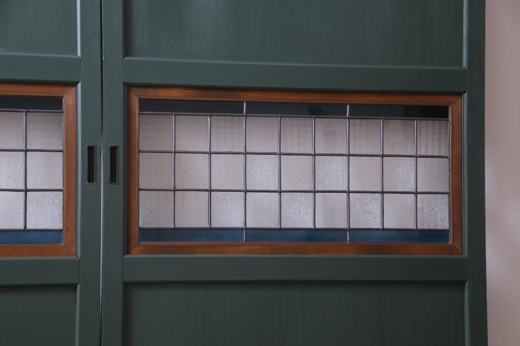 明治期の板戸2枚をリペア&カスタム!オリジナルのステンドグラスをはめ込み、ダークグリーンに着色仕上げ。(引き戸、建具)