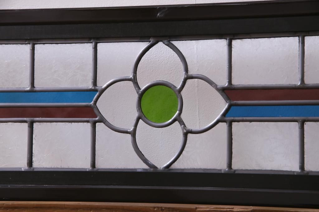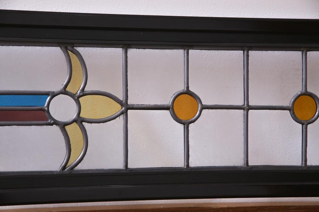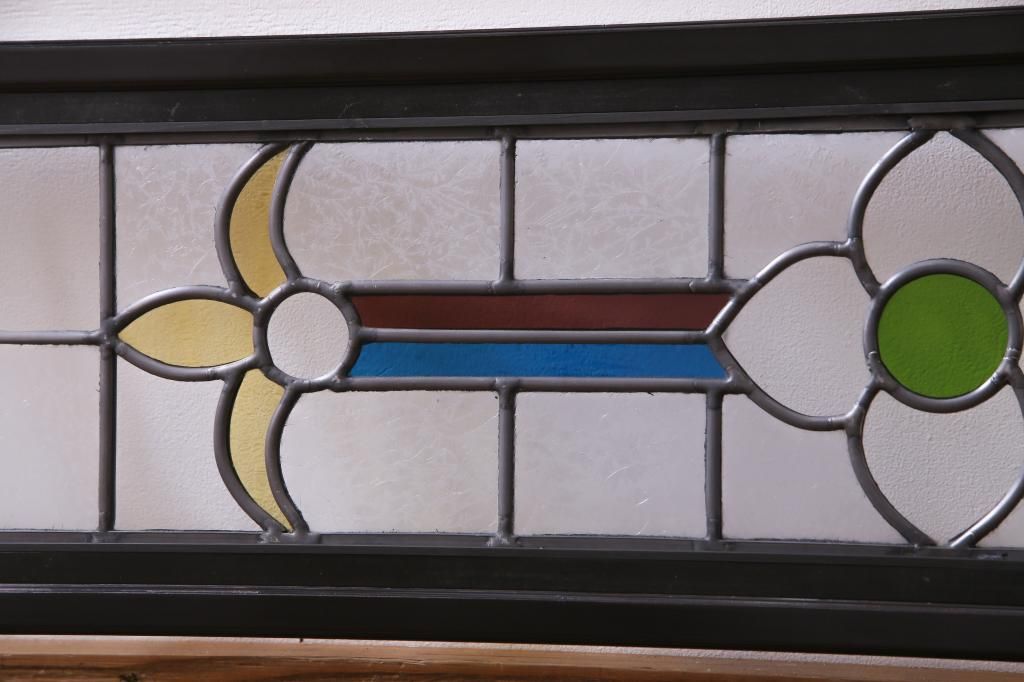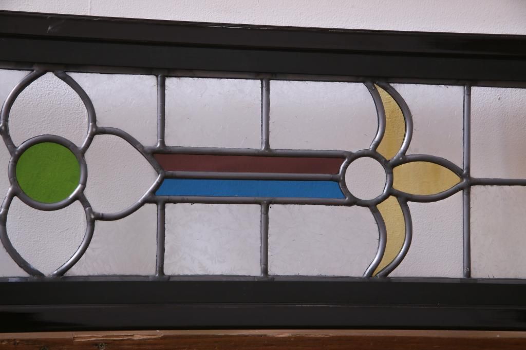 ドア・建具> 色ガラス・ステンド入り建具 > 明治大正期の大正ロマンな欄間をリペア&カスタム!オリジナルのステンドグラスをはめ込み、濃い茶色で着色仕上げ。(明り取り、明かり取り、ディスプレイ)