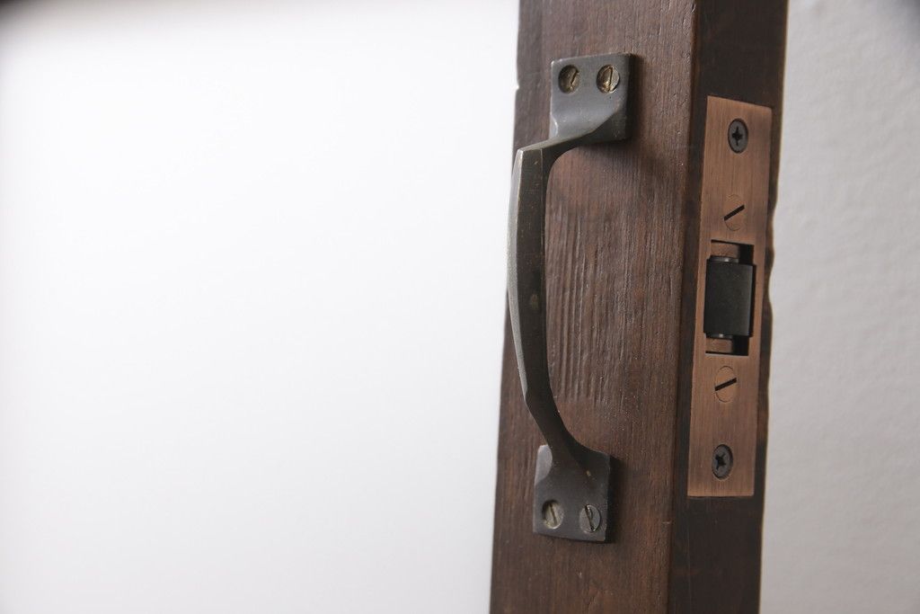セミオーダー家具実績 > 大正昭和初期のレトロなドアをリペア&カスタム!高さをリサイズし、ガラスを反転。蝶番を取り外し、ローラー締まりを取り付け。現状の色味をベースに着色仕上げ。(ガラス扉、建具)