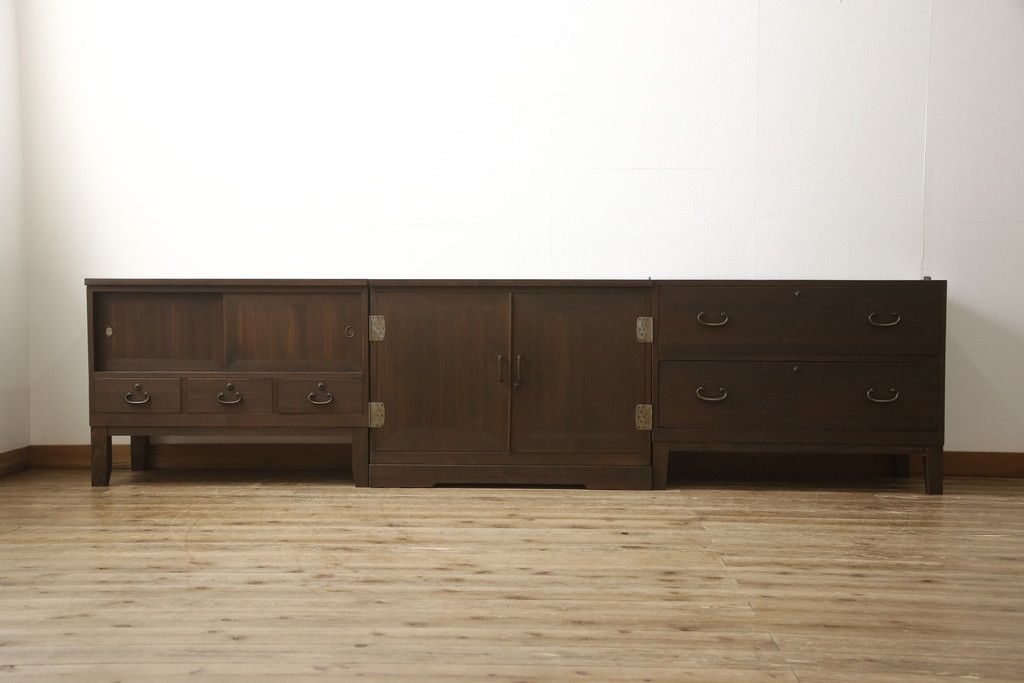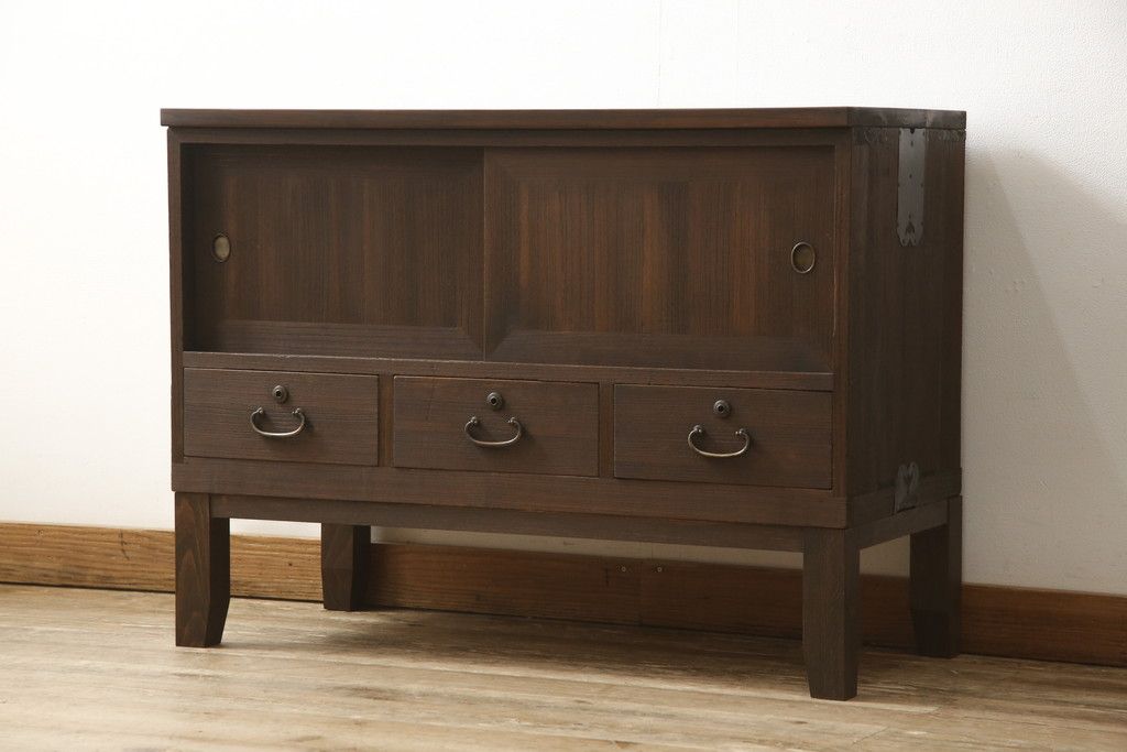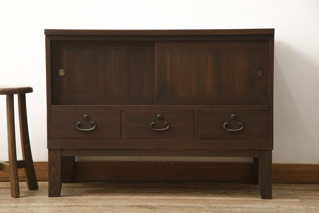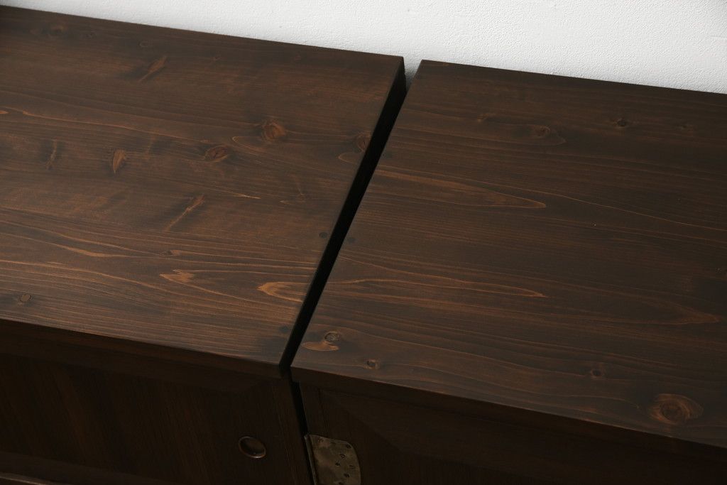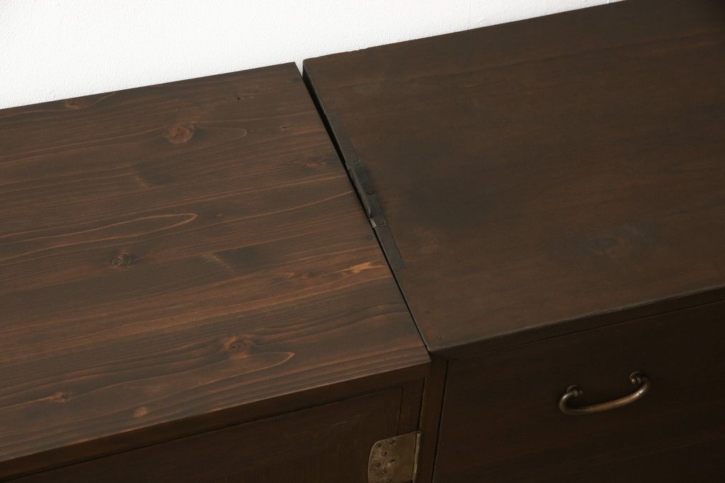 3段重ね桐箪笥を2つのローボードとキャビネットにリメイク!上段の引き戸内の棚は撤去し、新たな棚を製作。天板と脚を追加しローボードに。中段は天板と台輪を取り付けキャビネットに。下段は天板を補強し脚を取り付けてリビングボードに。全てを濃茶のステイン塗料仕上げ。