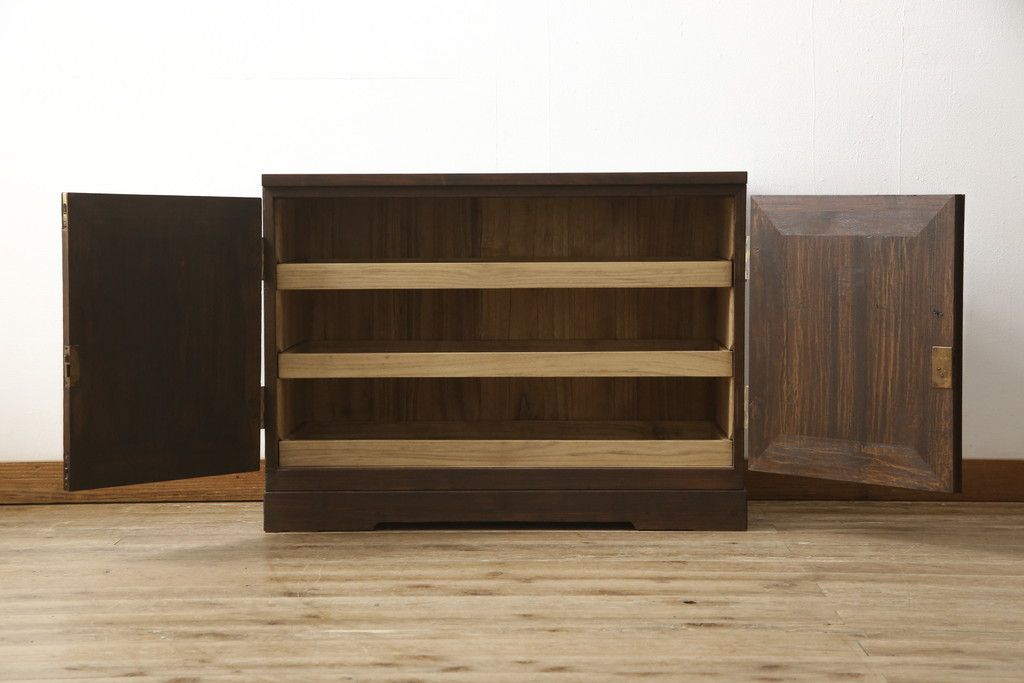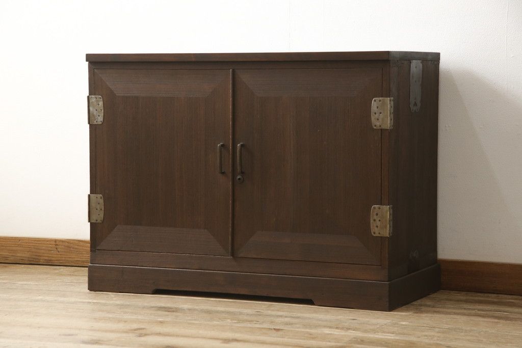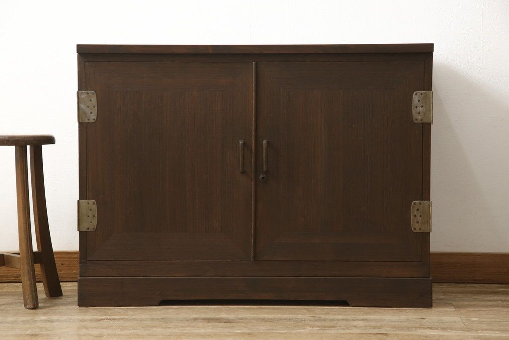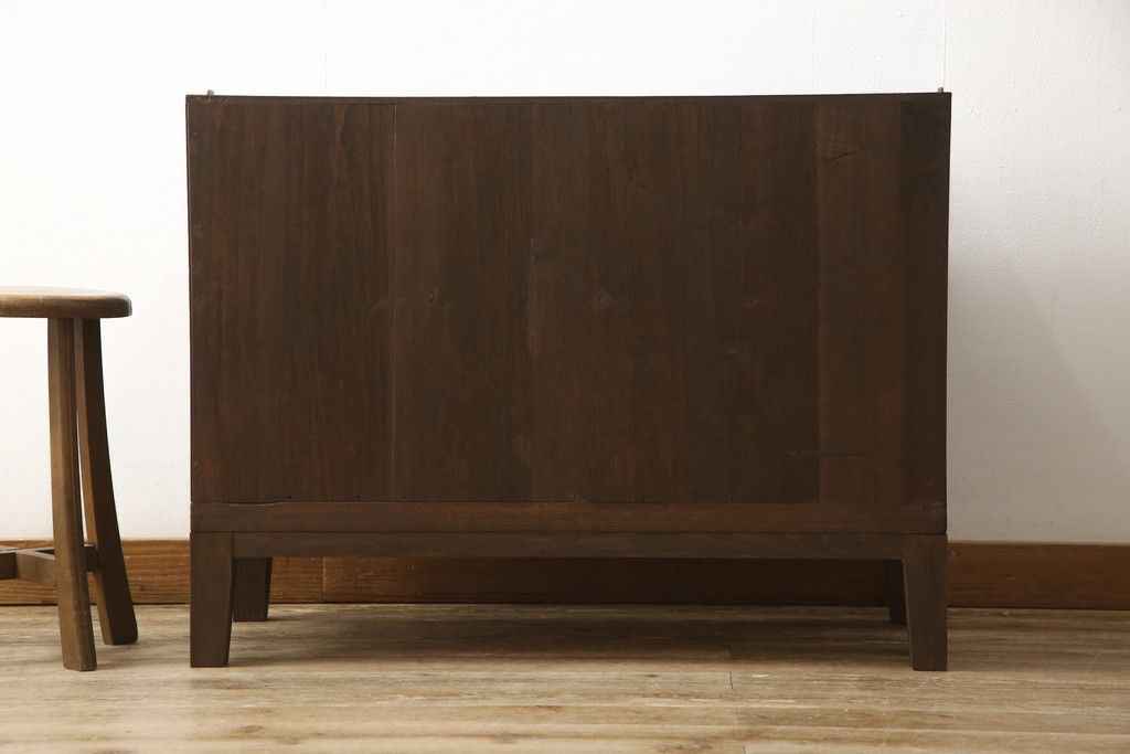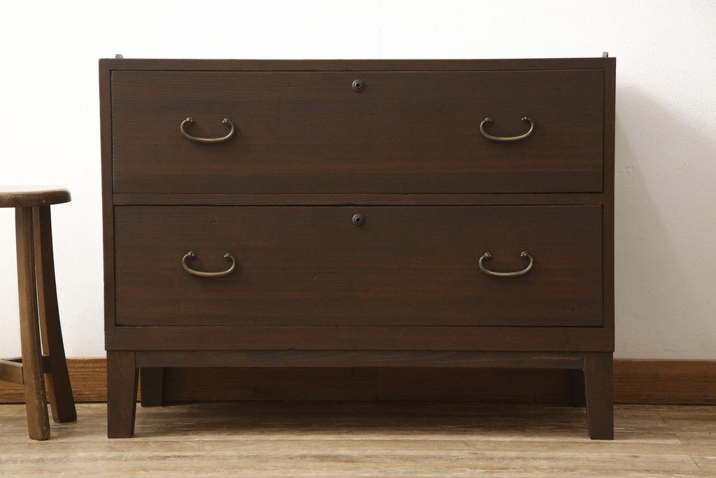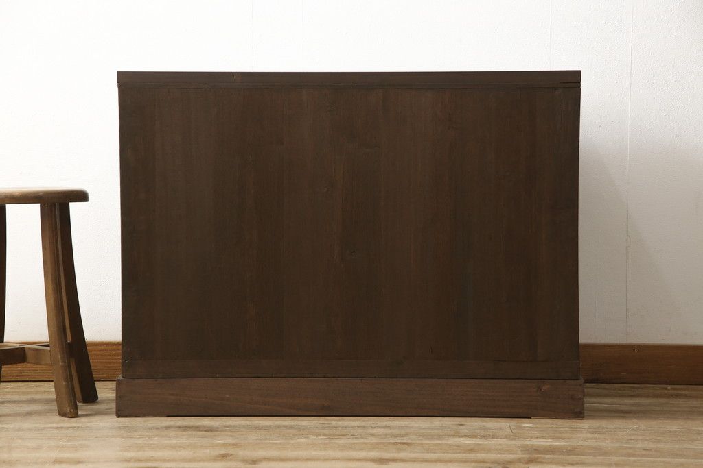 3段重ね桐箪笥を2つのローボードとキャビネットにリメイク!上段の引き戸内の棚は撤去し、新たな棚を製作。天板と脚を追加しローボードに。中段は天板と台輪を取り付けキャビネットに。下段は天板を補強し脚を取り付けてリビングボードに。全てを濃茶のステイン塗料仕上げ。